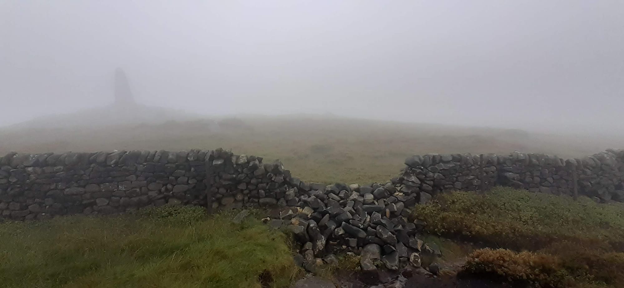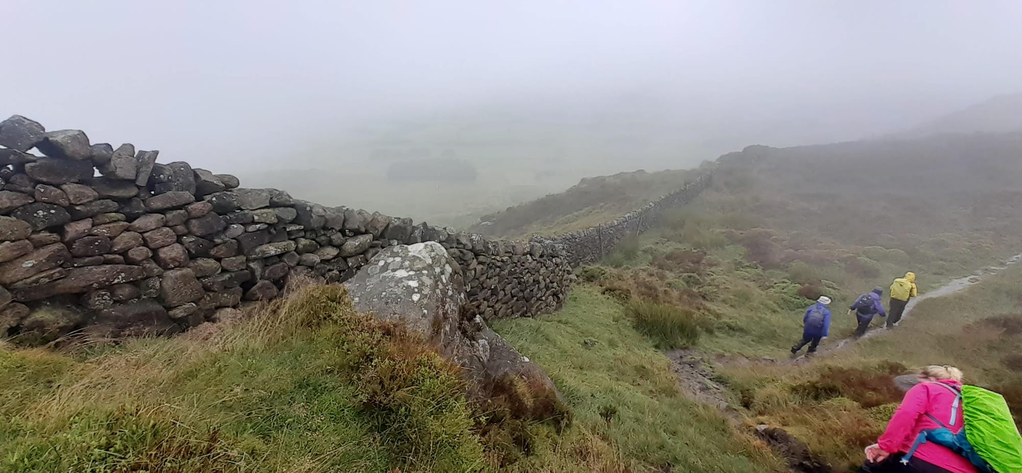 Then up one edge of the ridge until we got to Rylstone Cross, celebrating 50 years of Queen Victoria's reign. Speaking of rain, there was lots of it. As we walked along the ridge, a highland moor to our right, stone wall to our left, we were mostly walking in a stream and peat bog, with a heavy mist settled over the valley below us.