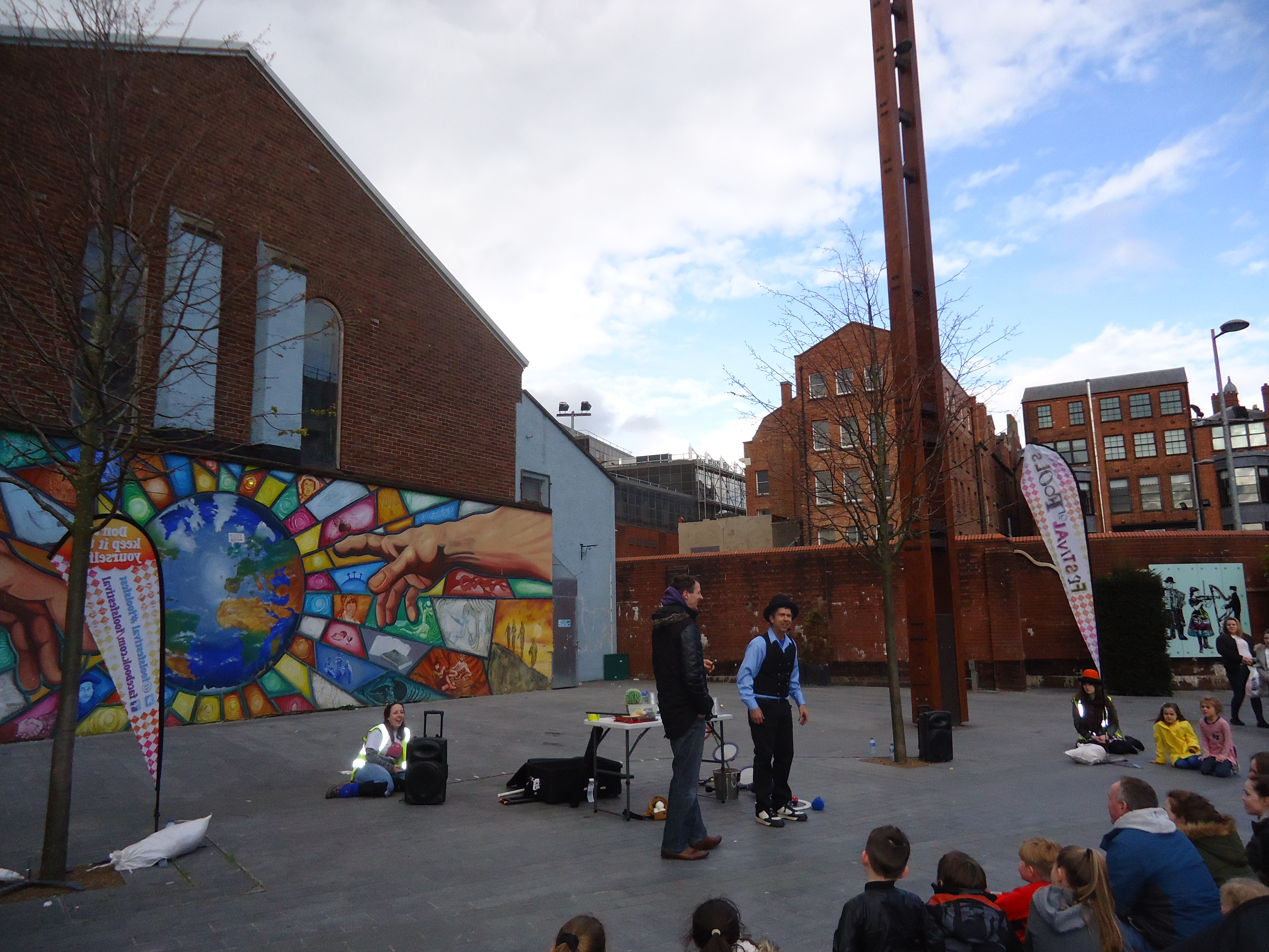 Here’s an American comedian/juggler named Dan Holzman, just to give you a feel for street entertainment in Belfast: