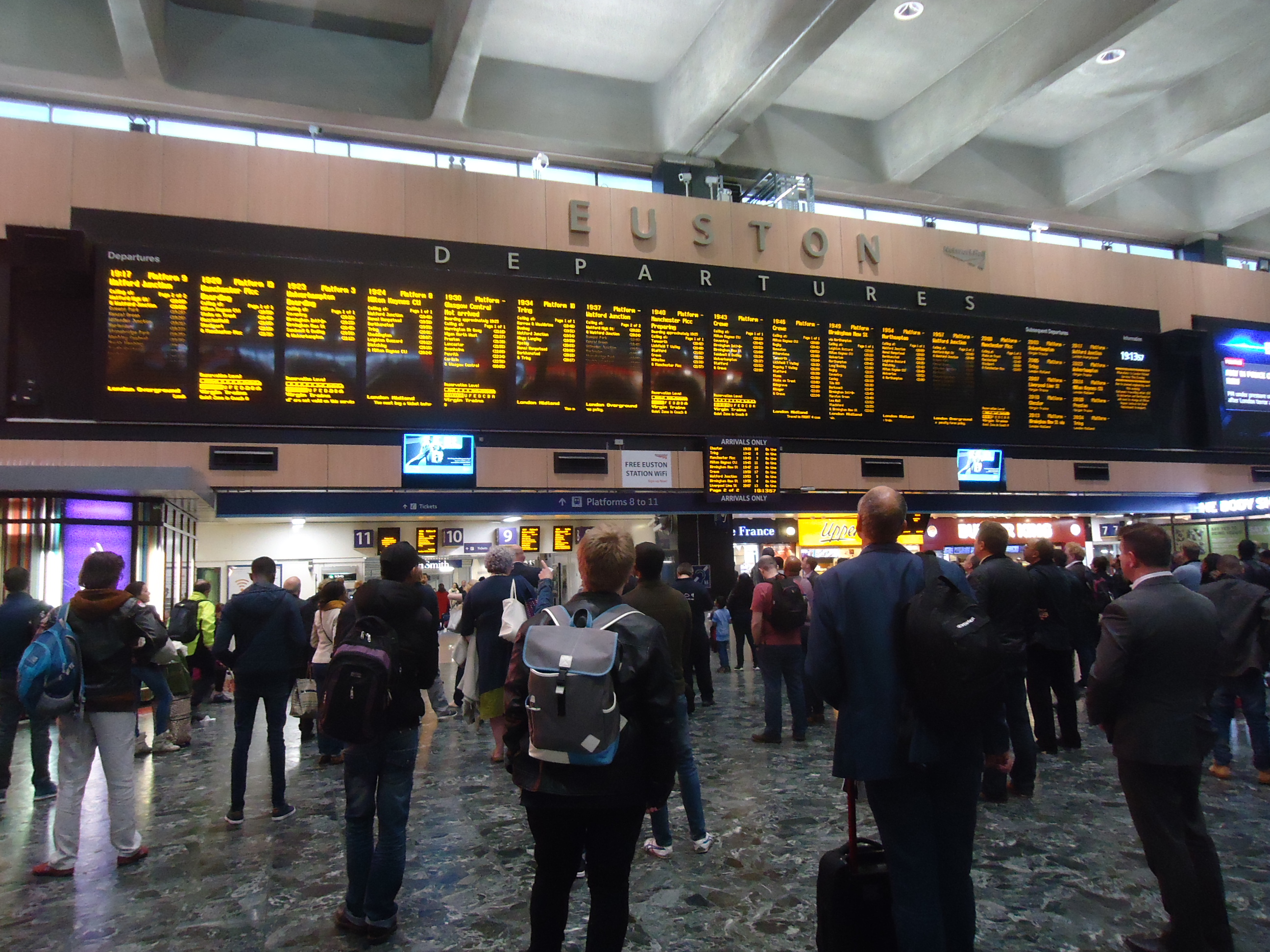 Before catching the 1:30pm bus downtown, I went swimming, cleaned the house, planted three geraniums that have been sitting in the backyard for more than a week, did some writing and editing for Preventable Surprises, and edited an annual report for the refugee women’s integration project. Then I took the 2 pm bus from downtown to the airport. Then a 4 pm flight to London (the dreaded Ryanair). Then the Gatwick Express train to Victoria. Then a tube to Euston station. Where I went to the Quaker House, a massive property across from the station. The woman I stay with was at a Quaker service and she left the keys for me at reception. Here’s the schedule at Euston Station. Which represents nicely the difficulty I have navigating large cities (more on that later).