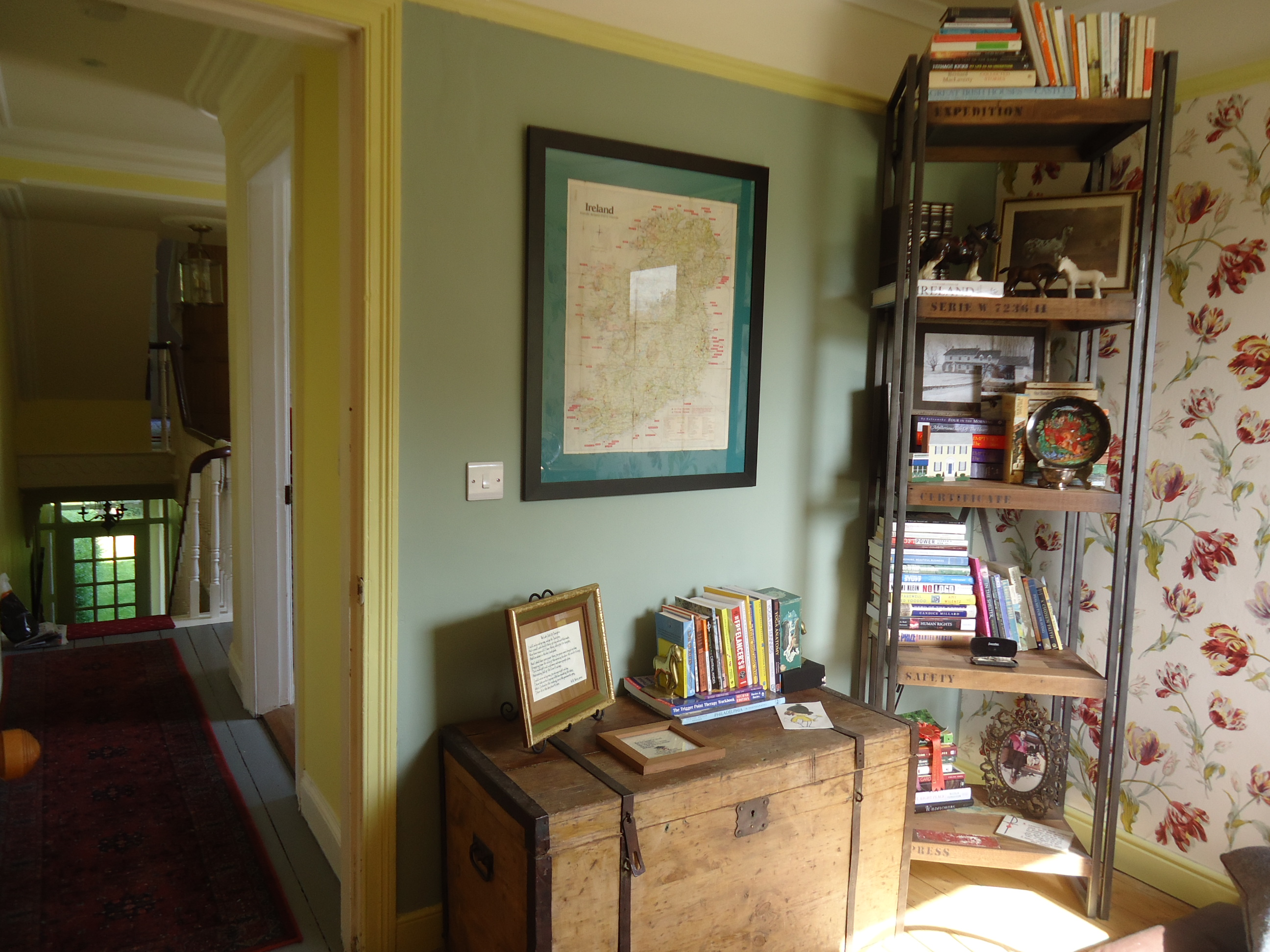 What I love about this room is all the things that are very dear to me, all mementos of people I love. There’s a plate from Mrs. Morris and a horse print from Mrs. Curran, both neighbours in Chester, Va., where I lived from age 8 to age 12. There’s a map of Ireland I took with me when I hitched around Ireland at age 18. There’s a photo of mom and Aunt Rosemary, my favourite aunt. I have a cross stitch from my mom (of a poem by Yeats). Pride of place for a print of Queen’s University. Each of my diplomas is accompanied by a graduation photo.