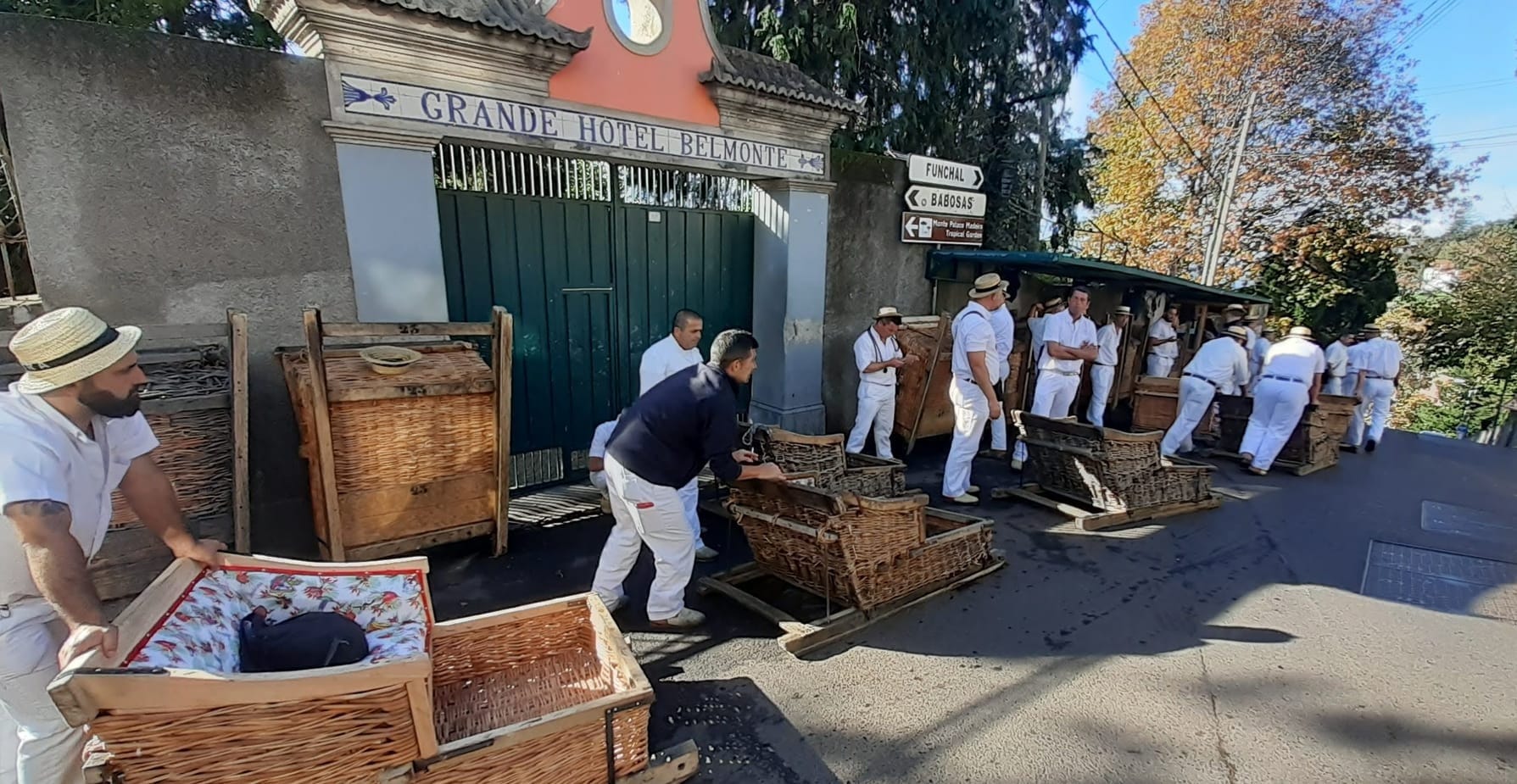 A short walk from the garden is the starting point for the toboggans. These wicker sleds were once used to transport goods from the mountains down down down to Funchal. Now tourists are guided down the serpentine roads about two-thirds the way to Funchal. These are the drivers who provide steering and braking while you sit back and enjoy the view and the wind in your hair.