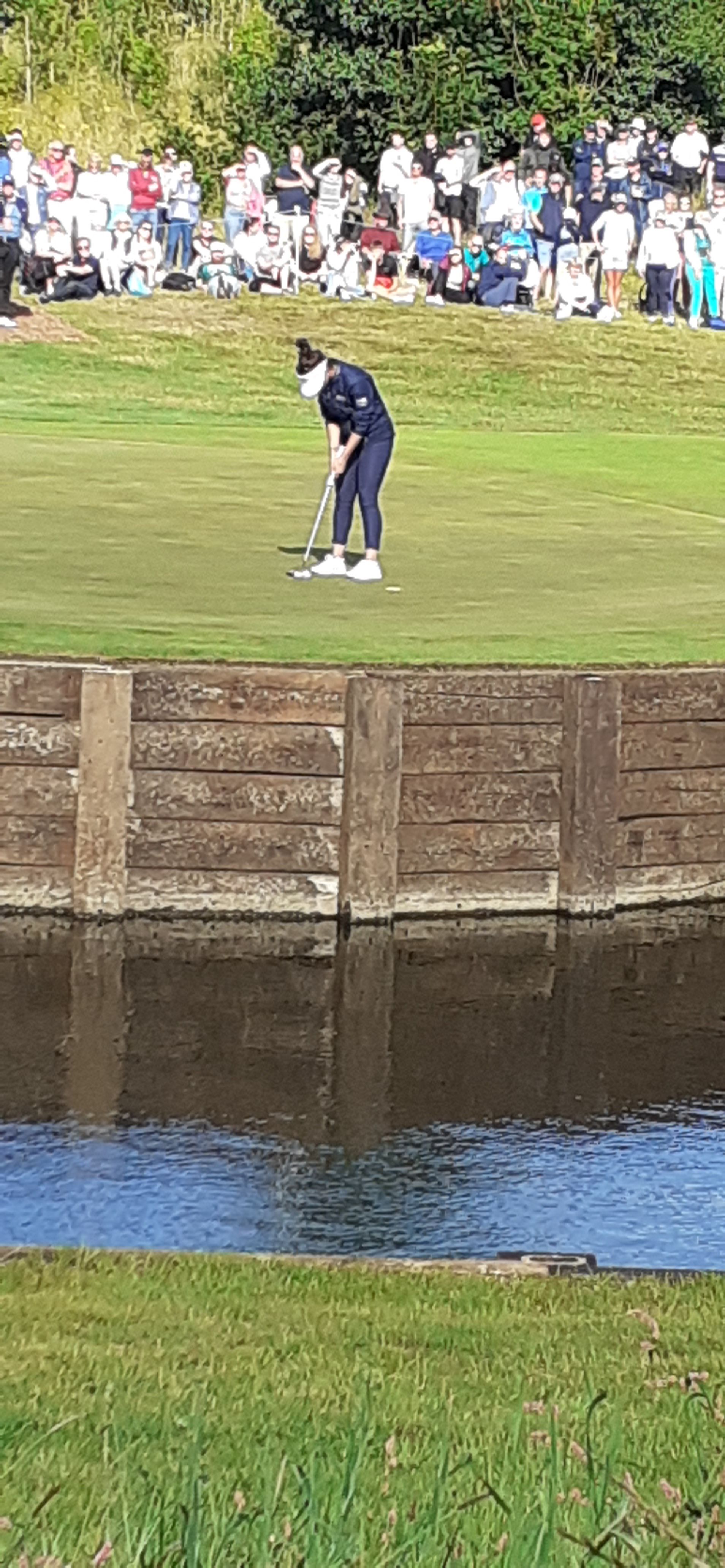Talley, from Kentucky, in the foreground, and Kupcho in the background, about to hit a shot into the water next to the sinister 18th green, taking her out. Below, Anannarukarn has just hit a lovely shot onto the green.