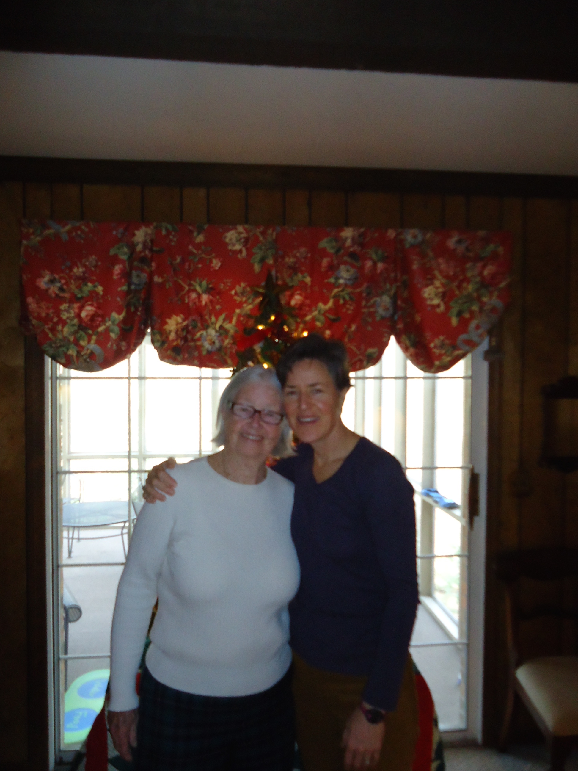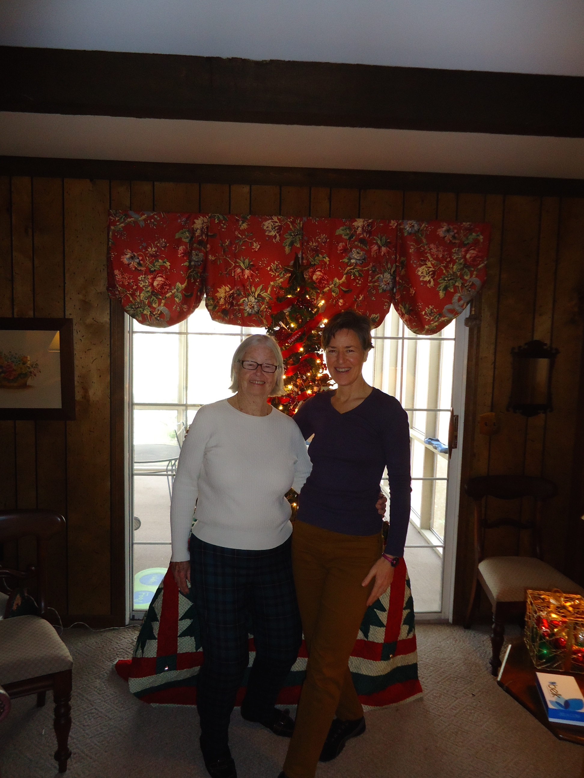 In this picture, we tried to show the tree, but we both had to squat a bit. Mom made the curtains and she sent me home with a beautiful cowl scarf that she made. Unlike me, she has a wide range of domestic talents.