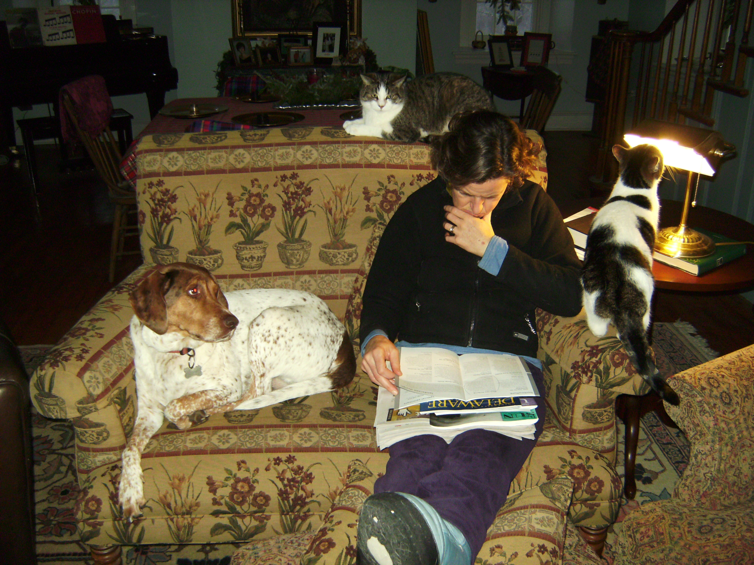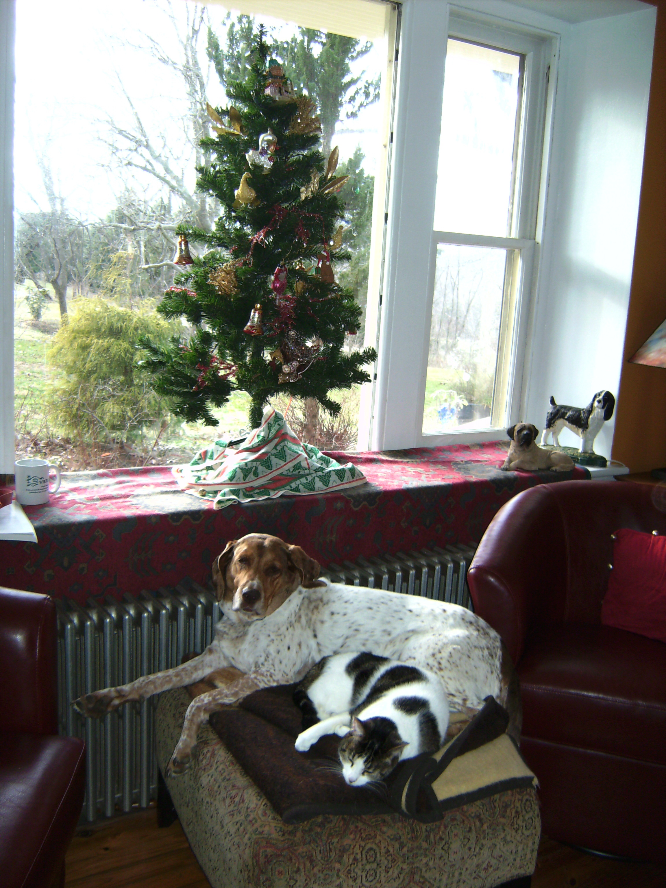 I think this was the first time the cat and dog shared close quarters. We kept them separated the first few years because the cats ran from her and she gave chase fairly aggressively. At some point the cats stood their ground, used their claws, and Maysie learned her place. Note my Bill and Darby statues keeping an eye on us.