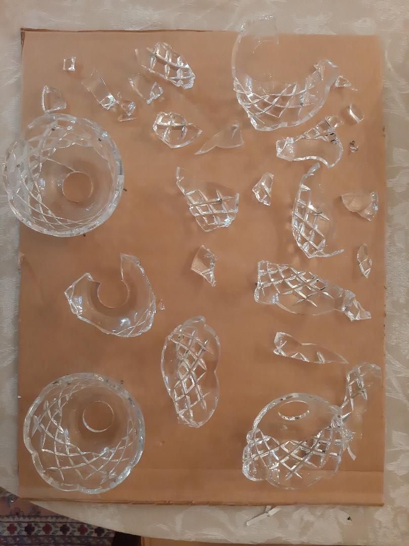 I've been really looking forward to sorting out the lighting issues in the dining room and hallway and I'm gutted that this project has backfired. Of the five cups, three are smashed and one has a crack. Of the five arms, one is broken in two. The upside down bowl at the top of the chandelier was also in bits. I put a black napkin among the pieces to show the damage.