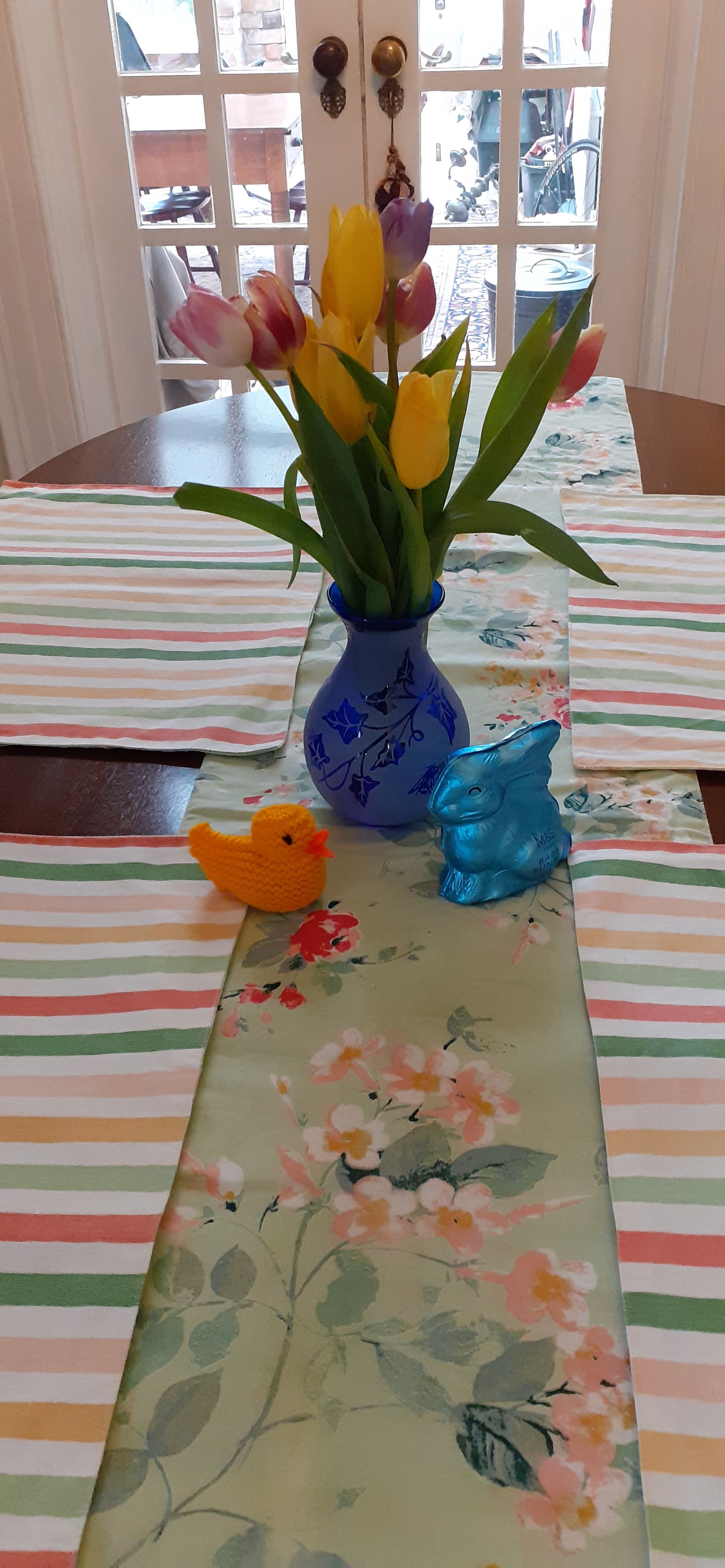 I also got three chocolate Easter eggs from three friends and a slice of cheesecake and a brownie from a fourth. The yellow chick above is a knitted cover for a Cadbury Easter egg. My friends are both clever and generous.