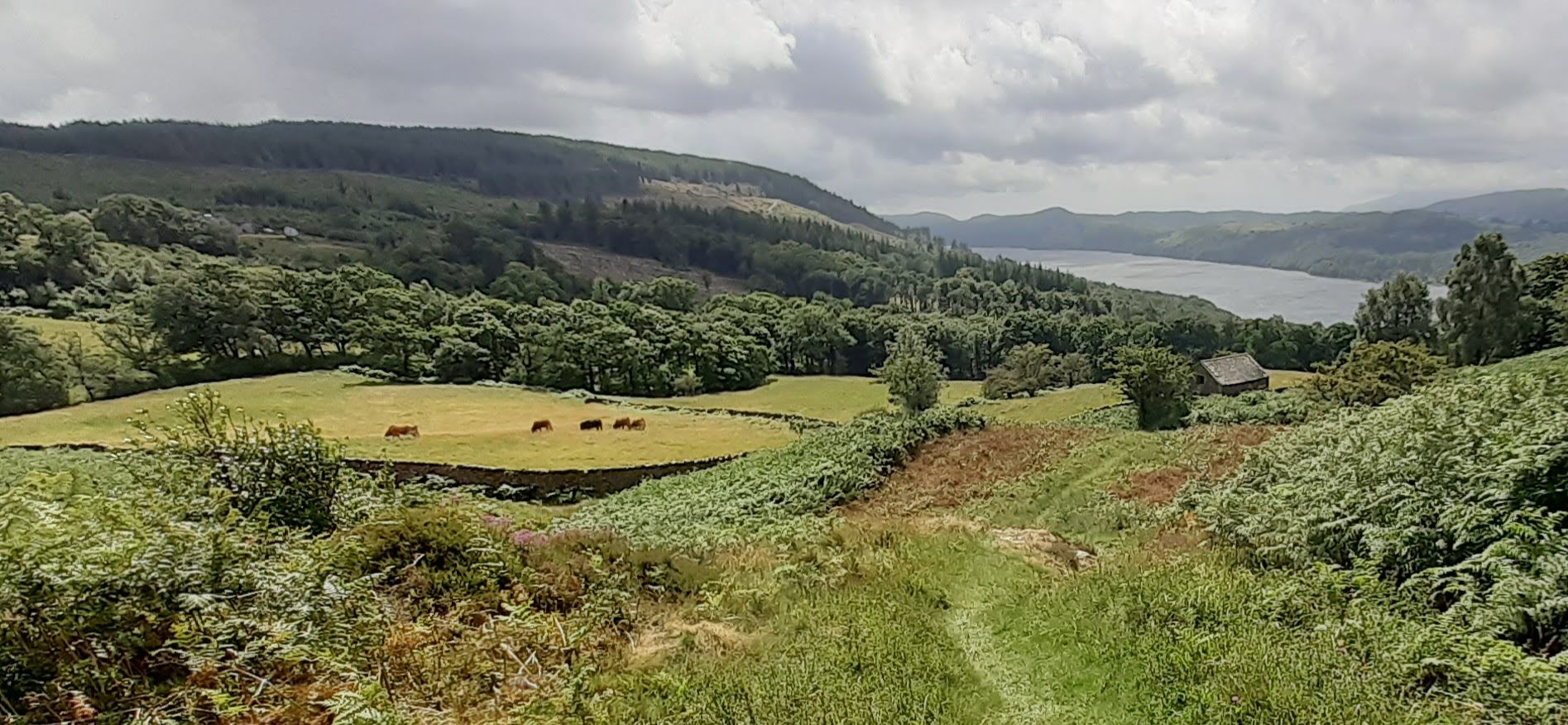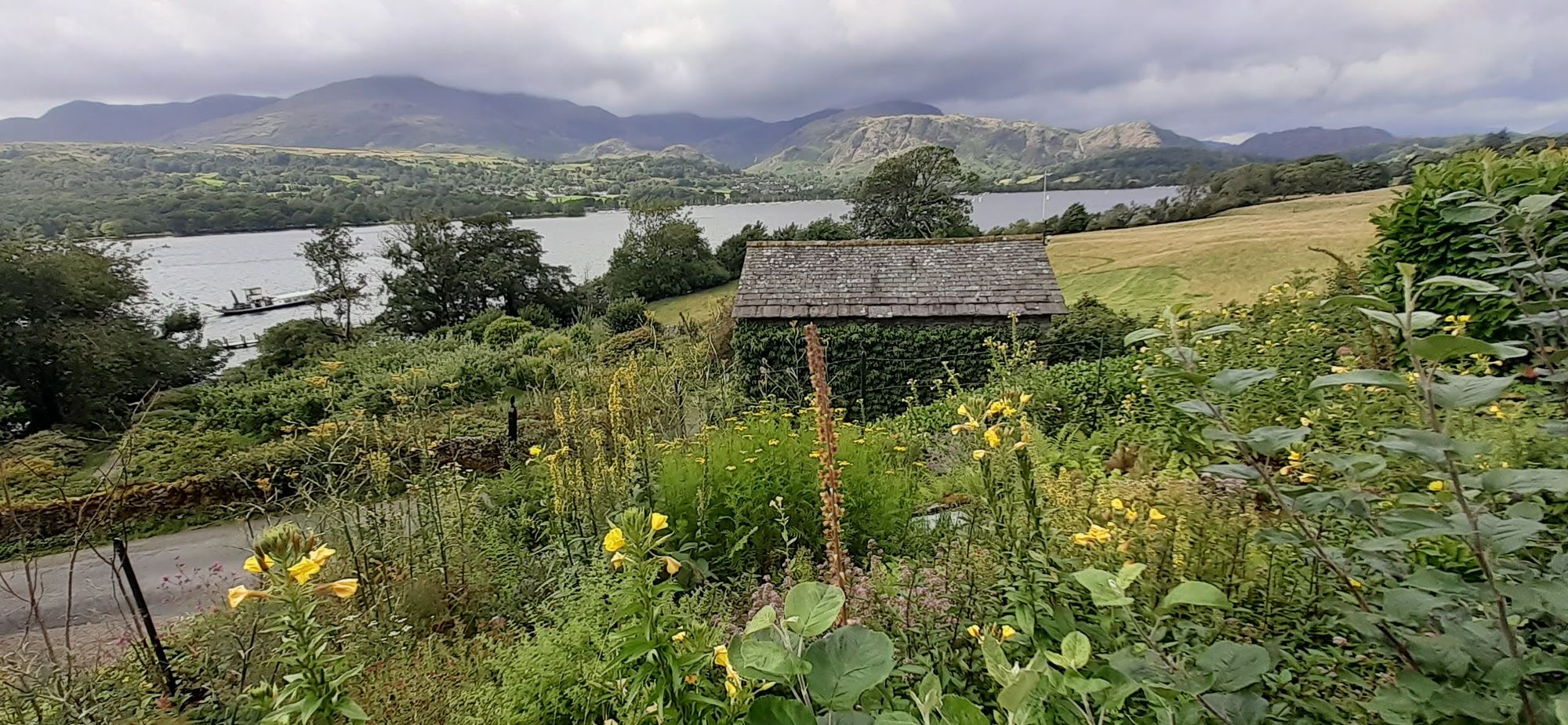 By lunchtime the sun was out so I ventured out to the walled garden and gazebo, which had some info about the families that lived in Monk Coniston. From there I returned to John Ruskin's house to explore the 250 acres of gardens, meadows and moorland, given that it was raining the last time I was there. I hiked up to a crag above the house, getting this view of Coniston Water on the way down.