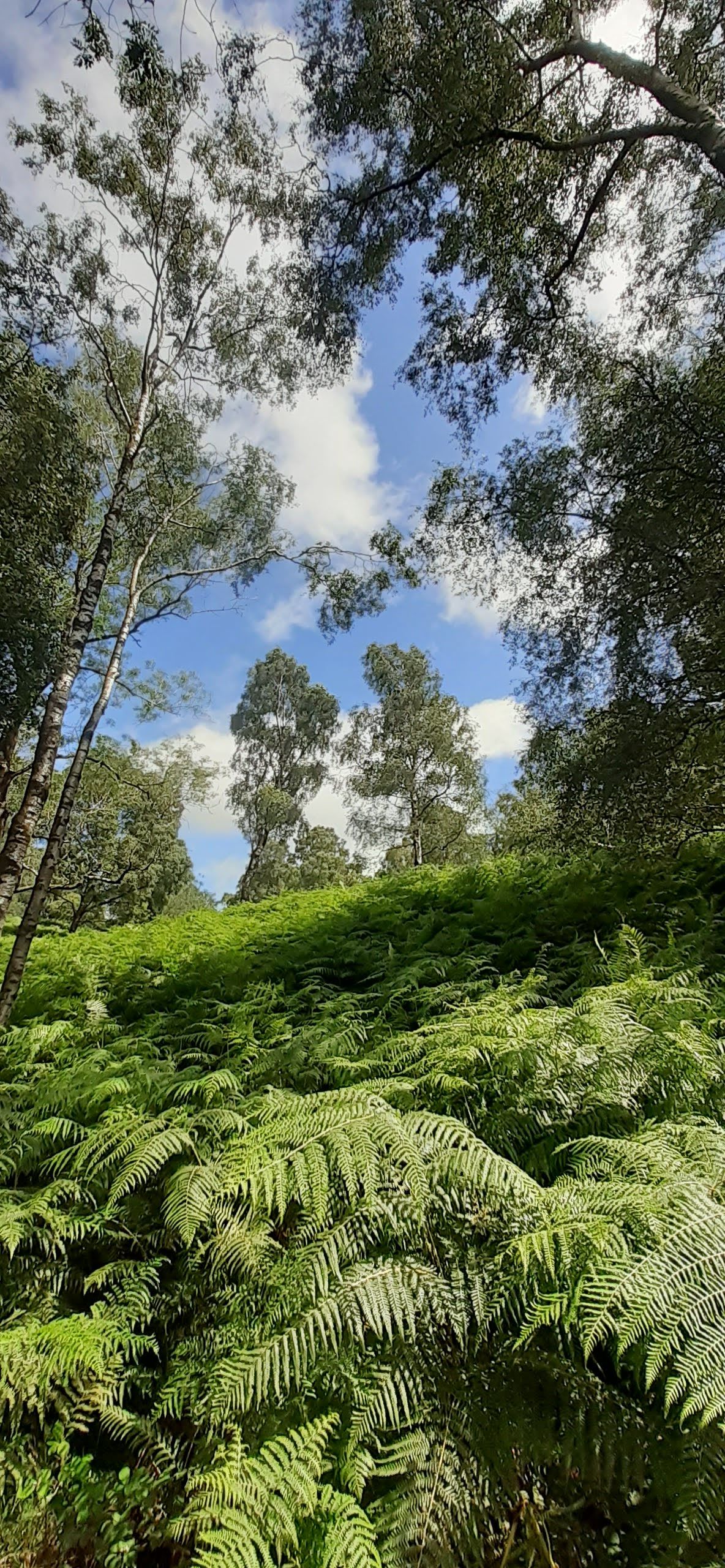 If there were an official tree of the hike it would be the birch, whose leaves dapple the sky. The official bird would be the house martin, whose cotton-ball belly flits through the fells like an airborne EKG. The official plant would be bog asphodel, whose spears of golden yellow mix beautifully with the purple heather. Birch and bracken below – a common combination along the lakeland fells.