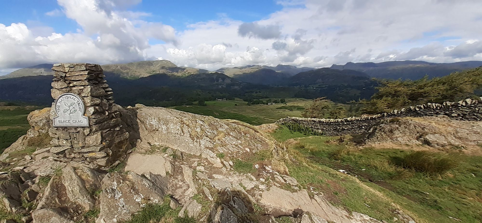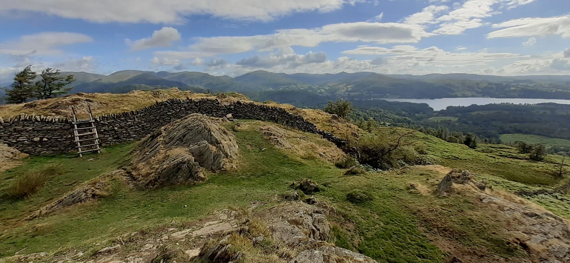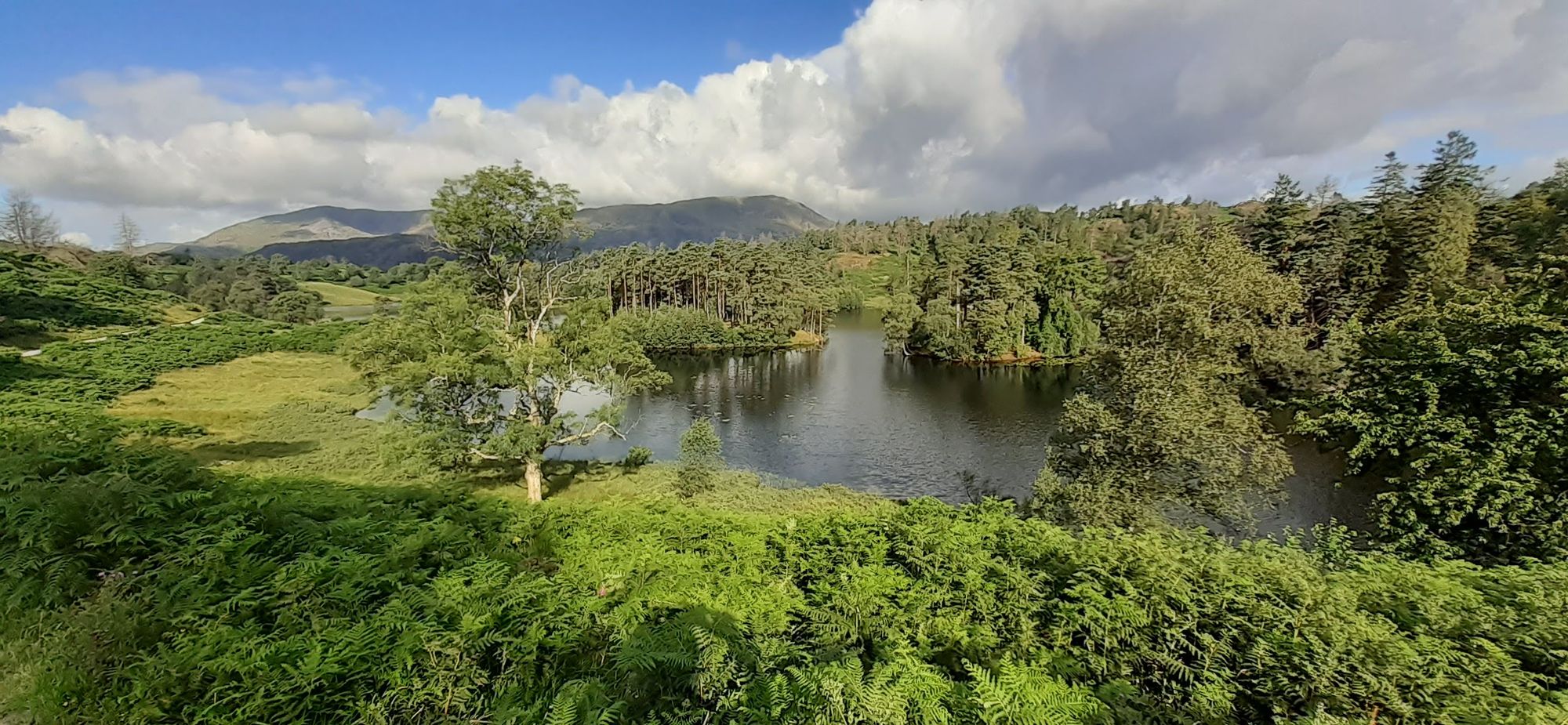 Today is travel day back to Belfast--and it's a lovely sunny day. I needed to be on the road by 10:30 a.m. At breakfast I asked a trip leader how long he thought it might take to get to the top of Black Crag and back – that being the high point of hike #6, last seen in a downpour of rain two days ago. He estimated three hours. Which I didn't have. I thought I could do better and headed back through the forest above Monk Coniston. First stop Tarn Hows. The man who owned Monk Coniston in the 1800s had enough earth moved to merge three lakes into one, creating Tarn Hows, which he stocked with trout. The locals were so angry they stocked it with perch and pike, which ate the trout.