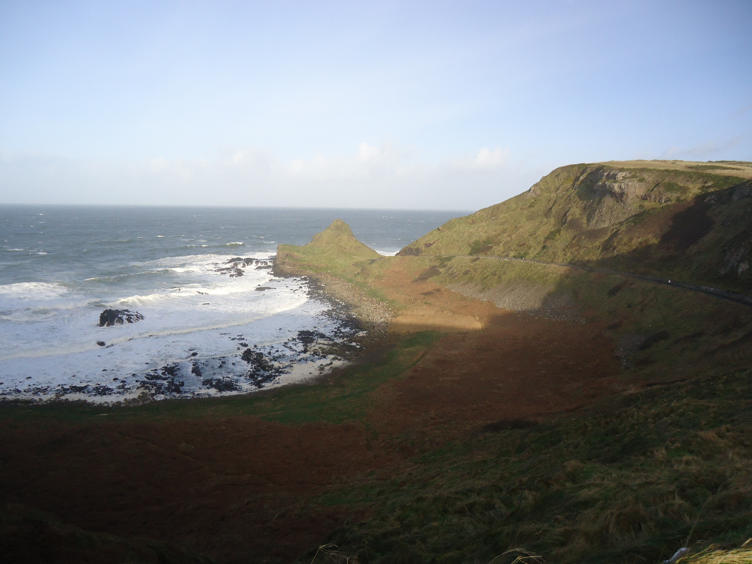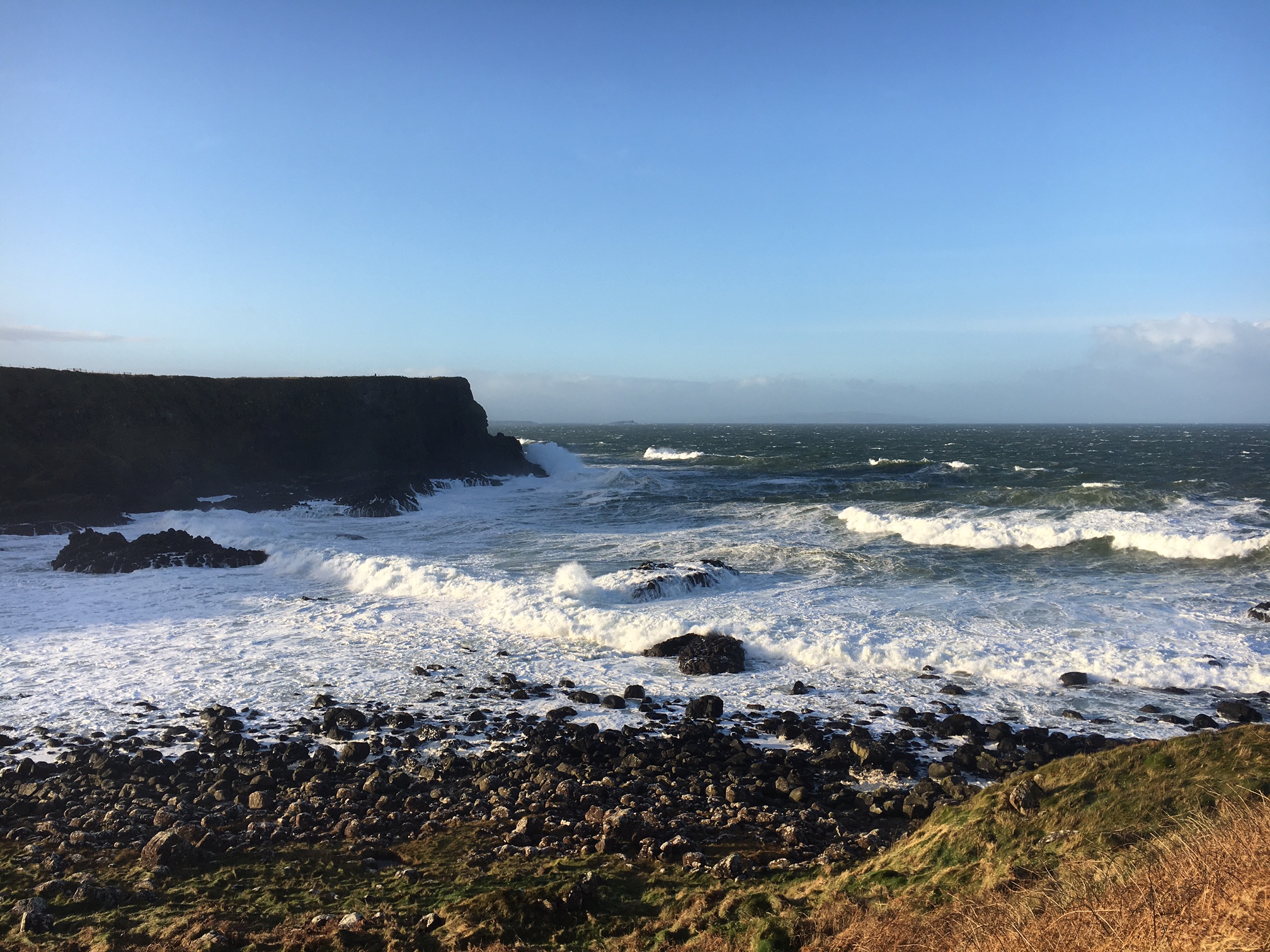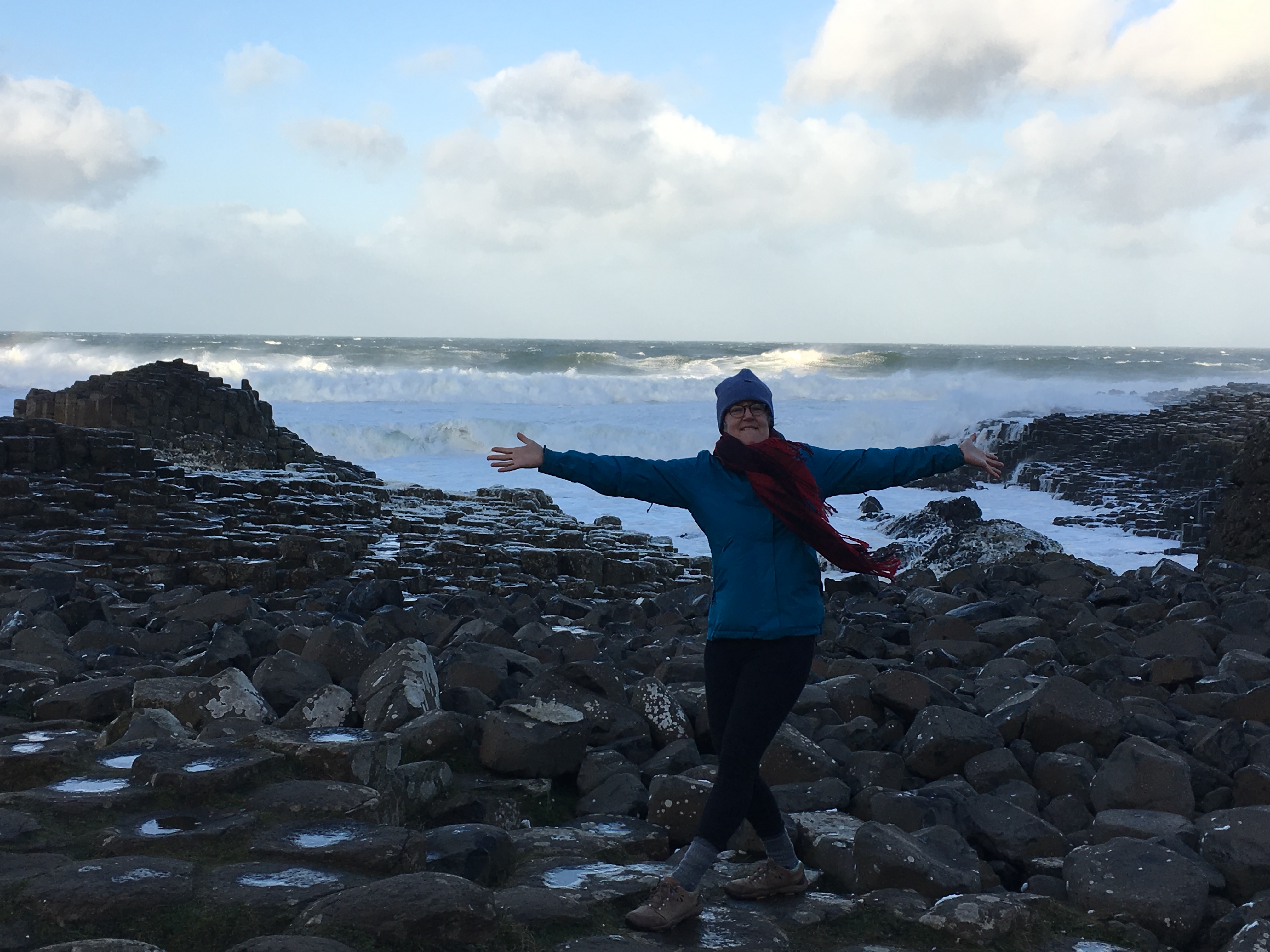 Not today. Bright winter sunshine, high high winds, roaring waves (the water at Giant’s Causeway is usually more like a bath tub) and, importantly, next to no one there. We had the place to ourselves. I explored it more than I have before, seeing angles I’d never seen before, and it was magical. There were huge curling waves--lit up by the sun--quite a distance from the shore, and then a second smaller wave near the shore. The result was big pools of foam among the rocks. As the new waves crashed in, golf-ball-sized puffs of foam popped into the air. Because the causeway rocks are backed by a steep hill, the foam soared upwards. It was like being in an upside down snow storm. Really magical. I kept giggling.