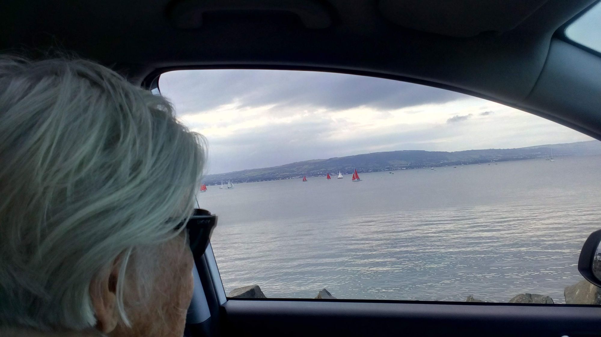 Tuesday I was back to work. I'm sure mom enjoyed a day of sitting still. She began to watch Great British Bake Off season 2. In the evening I took Paddy for a run/swim on the coastal path while mom watched and was kept company by a chatty nurse with two little mop dogs. Then we parked at the North Ireland Yacht Club, which had a regatta on.