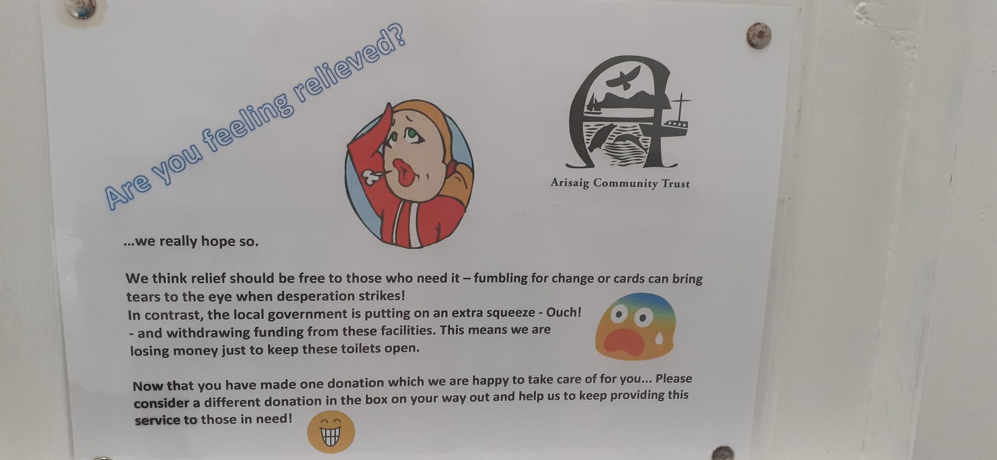 We just made the 11 am train viewing. Then to a lovely wee village called Arisaig which, thankfully, had public toilets. With a very entertaining message.