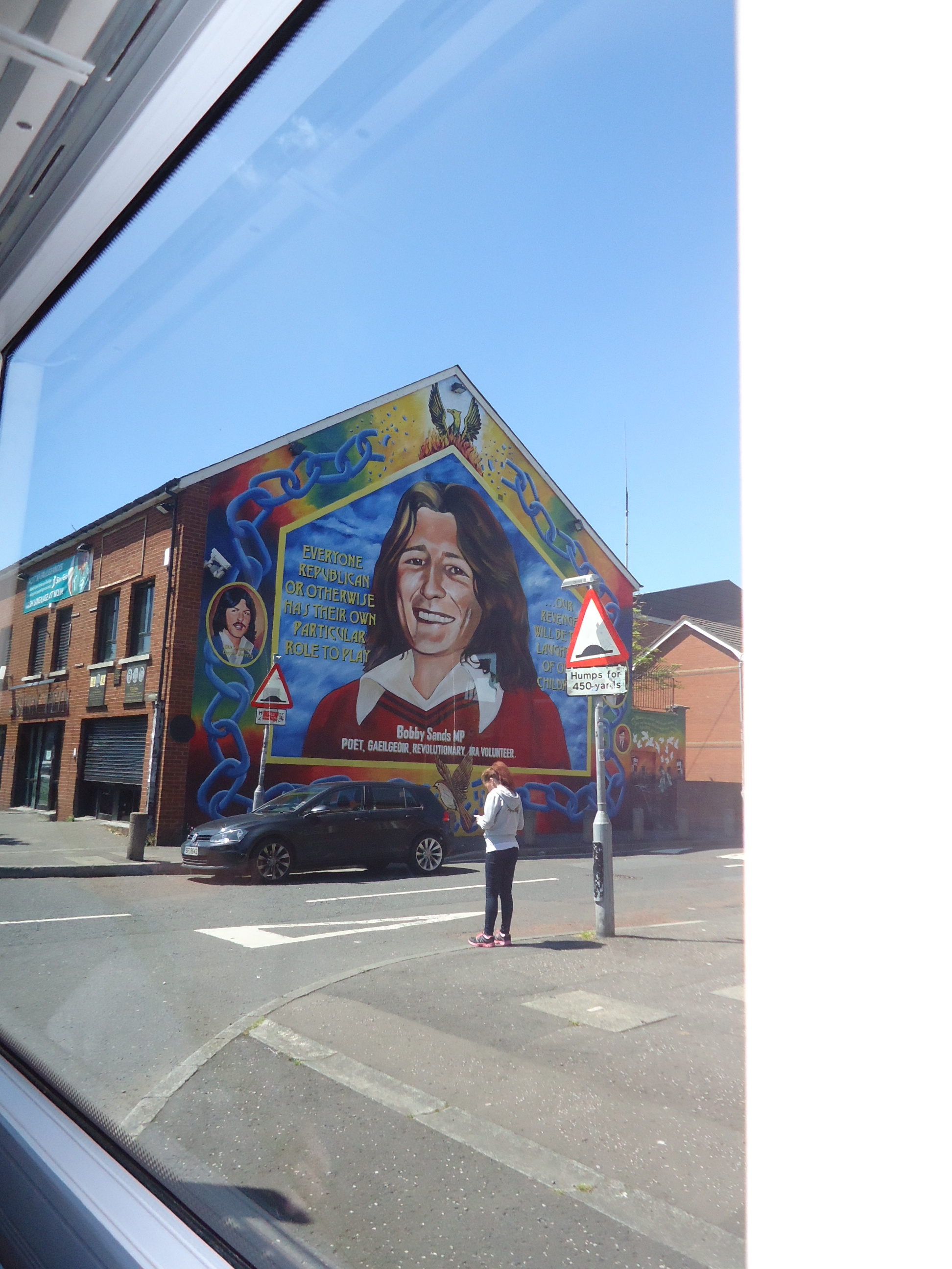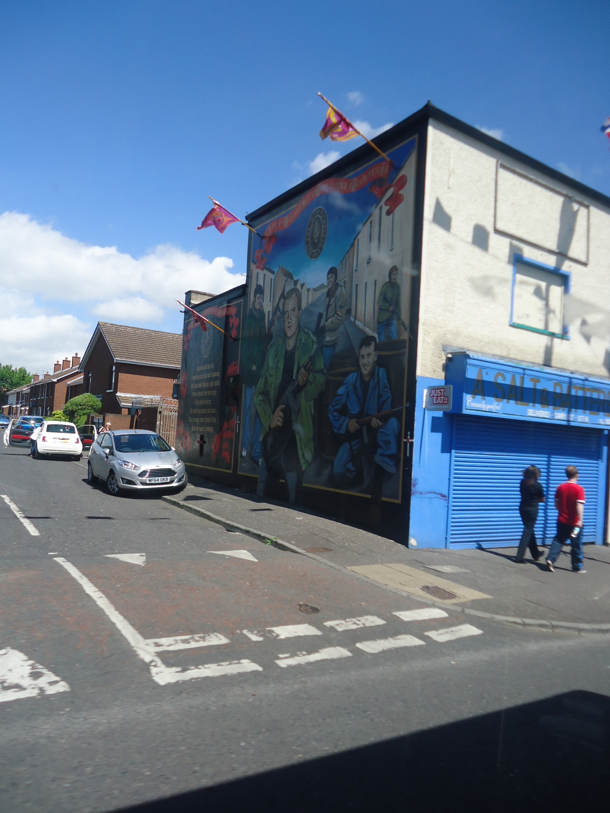 Today mom & I took the hop on hop off bus around Belfast. We toured the political murals, St. Anne's Cathedral, the dockyards, Customs House, the High Court--with its 10-foot reinforced concrete wall to protect it during the car bomb era--the "peace wall" on the "interface" boundary between Catholic and Protestant neighbourhoods, the memorial gardens, where Catholic and Protestant victims of The Troubles are buried.