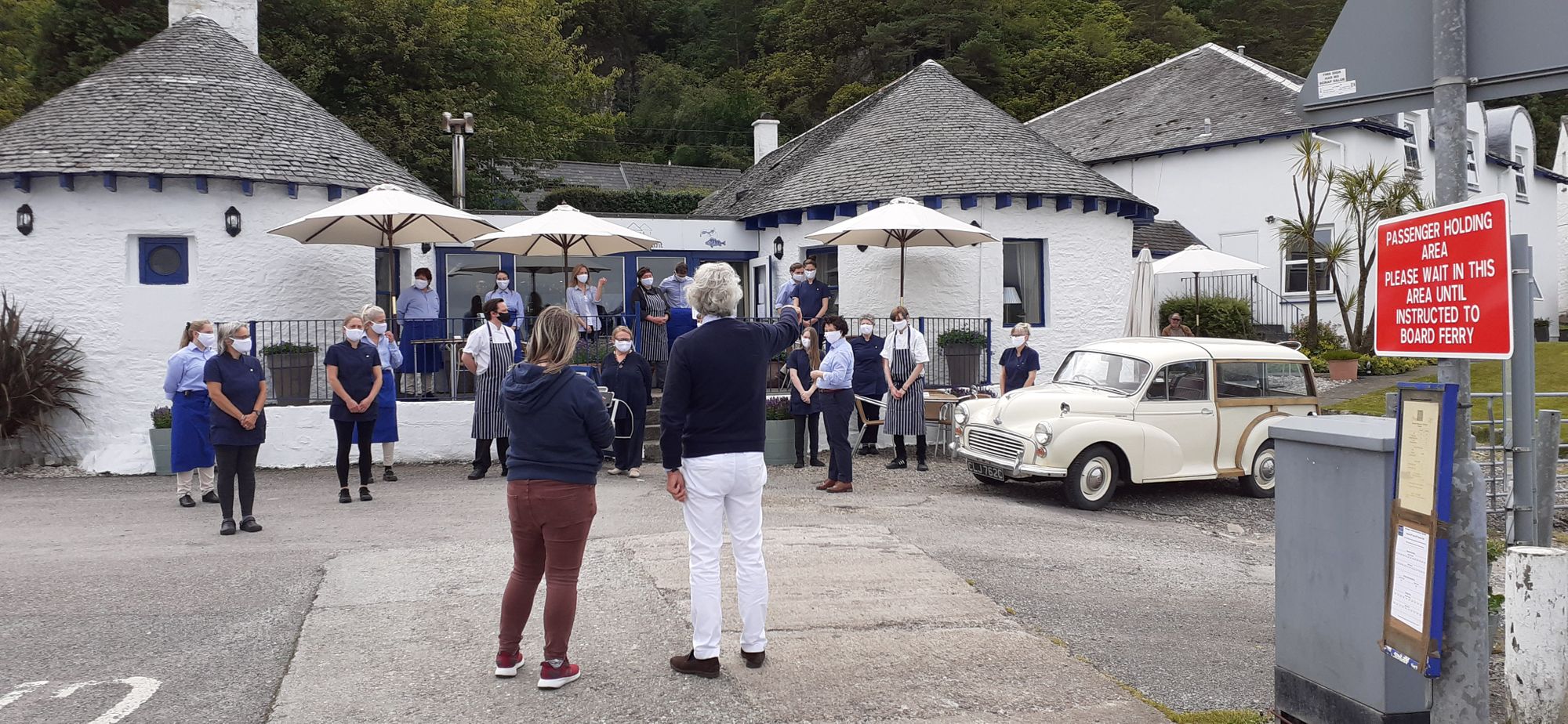Here's a nearby restaurant opening for the first time. Scottish restaurants have only begun opening in the last week. They were taking a photo for their website.