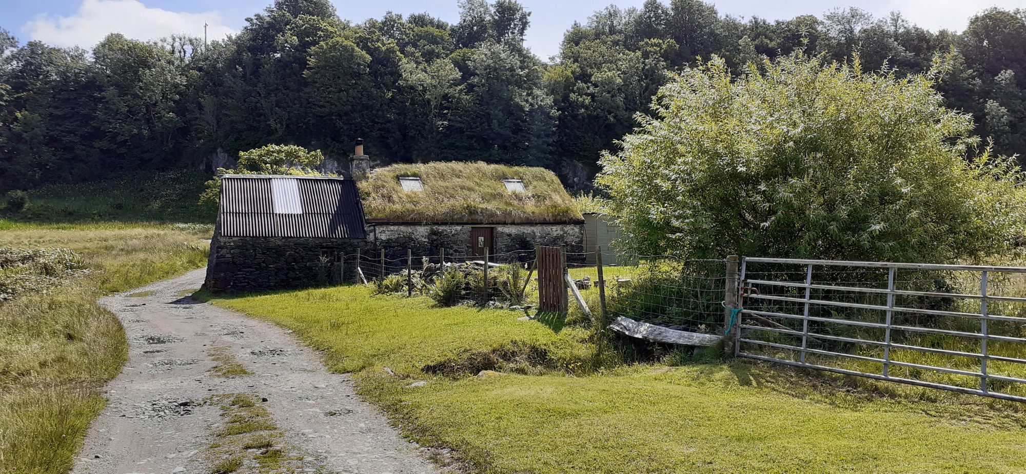 This cottage had a grass-covered thatch roof with sunlights. Very on trend.