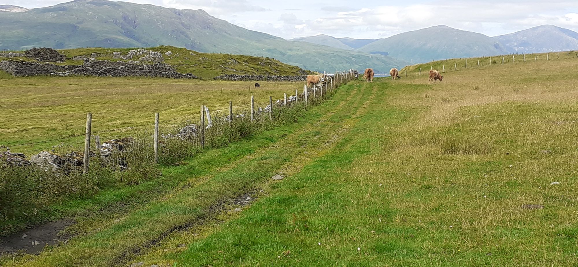 We come to a field with highland cattle. Steve goes to one end of the field. Julie, Molly and I stay at the other. Steve calls and Molly is supposed to run along the fence line to Steve by a far gate. Molly enters the field and the two big horned cows and one calf make for the fence to cut her off. She runs back to Julie. We try twice, and Molly, one smart cookie, is having none of it. I suggested we go through the lower field, which has only one horned cow and no calf. That worked a treat and we went on our way. This is looking back after we got to the far gate. I didn't go toward the cows to get a closer picture because I agreed with Molly they are not to be messed with.