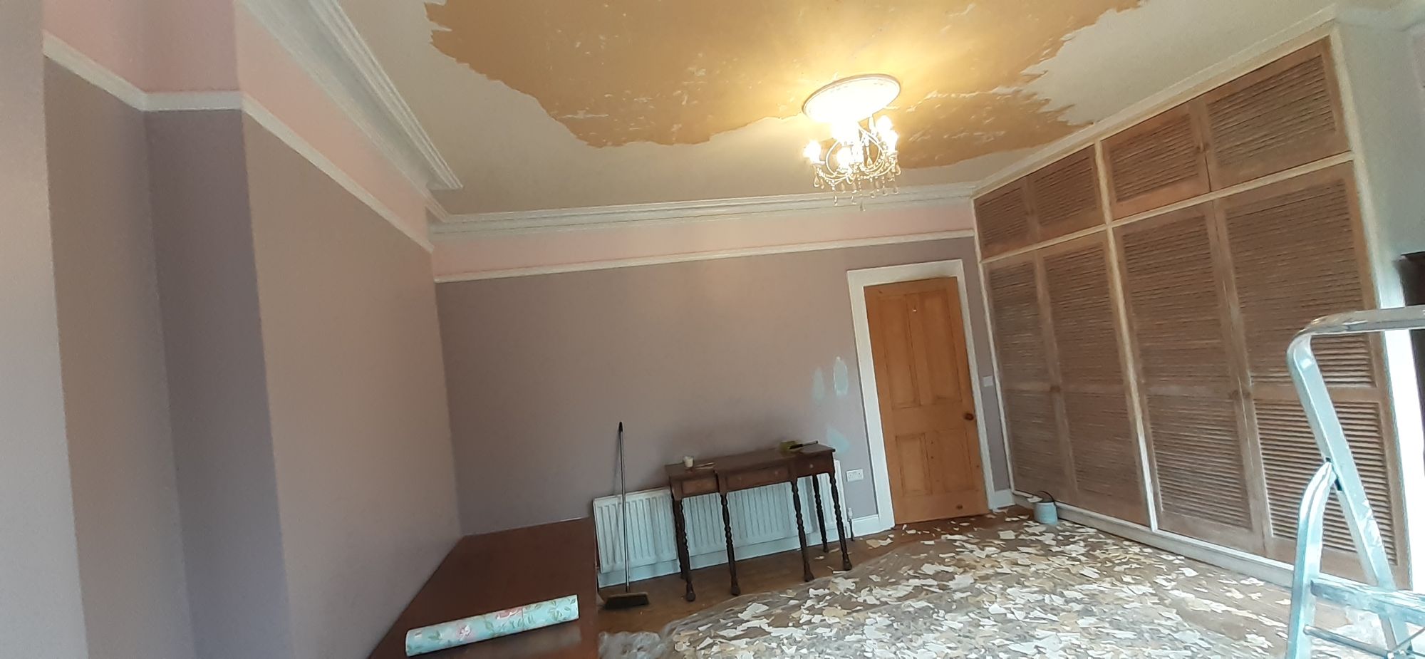 Next will be a coat of primer on the ceiling. Then repaint the moulding around the ceiling, which chipped when I pulled off the paper. Then the colour coat on the ceiling. Once the ceiling is done--a project that will have taken 3.5 months in another week--I can paint the walls and have wallpaper put up on a feature wall. Then I can move into the new upstairs lounge a sofa, rug, lamp, and three chairs that are destined for that room--and crowding other rooms.