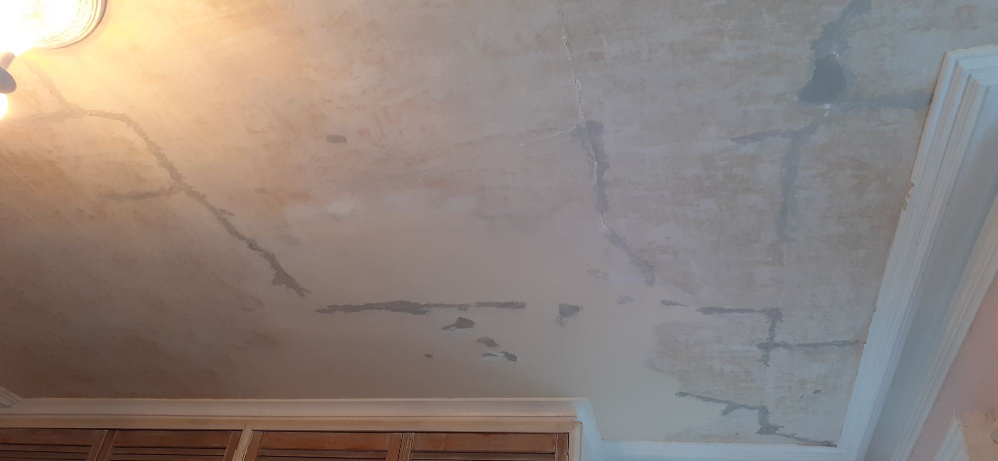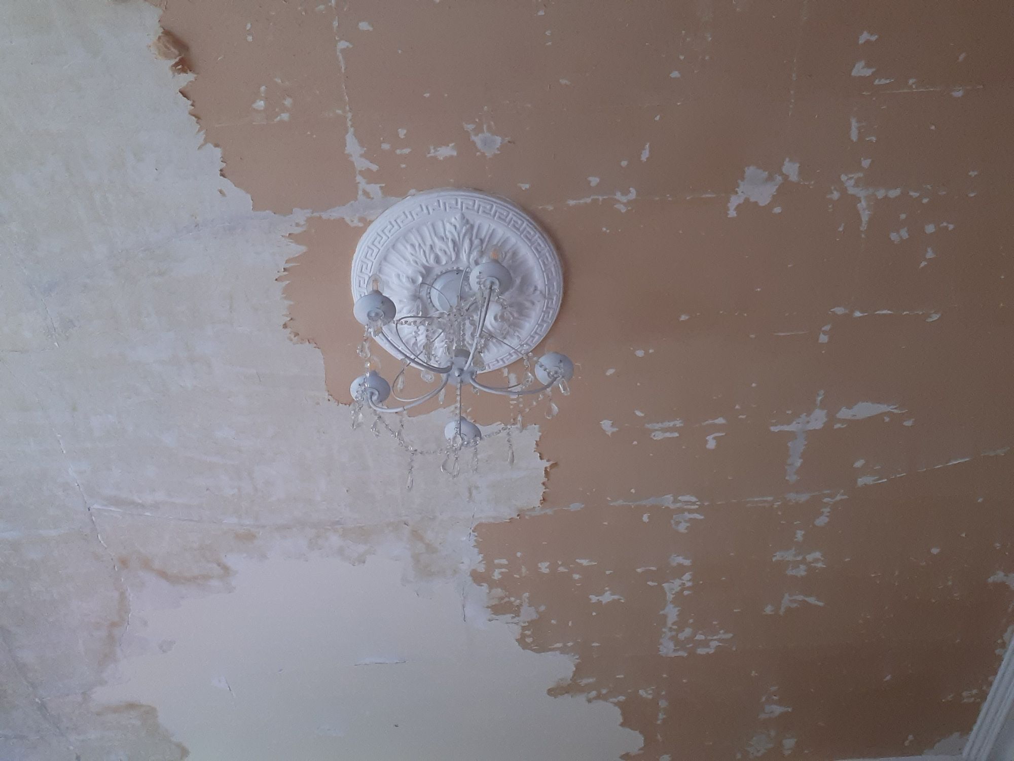 The point of this exercise is to get a smoother ceiling painted a brighter colour than the dreaded Magnolia (which also featured in my three-story hallway). The old wallpaper had opened up at the seams, the patched and painted areas were quite lumpy. Once both layers of paper and the glue were removed, I spackle and sand the cracks and sand and spackle the lumpy bits of plaster that had been patched ealier.