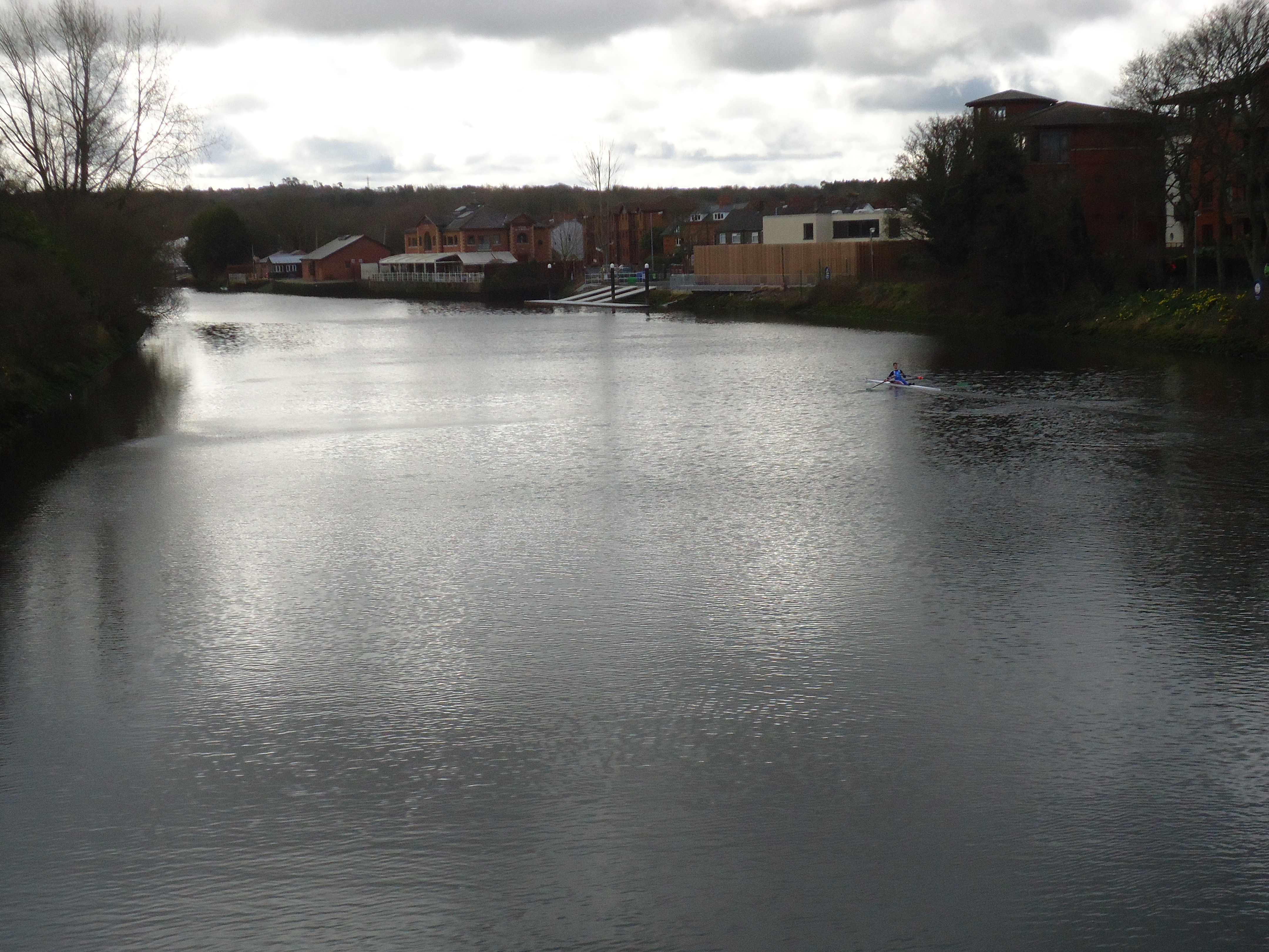 I crossed the Lagan from East Belfast to South Belfast to get to the beginning of the 11-mile towpath and saw a lone rower. I was amazed on Easter Sunday to see several rowing teams on the river, with someone in one of those larger motor boats. You can barely see the boathouses in the background.