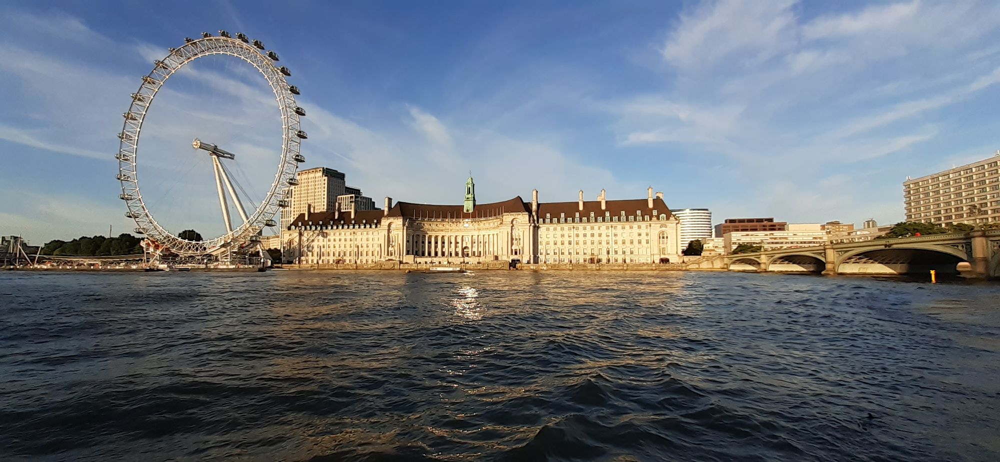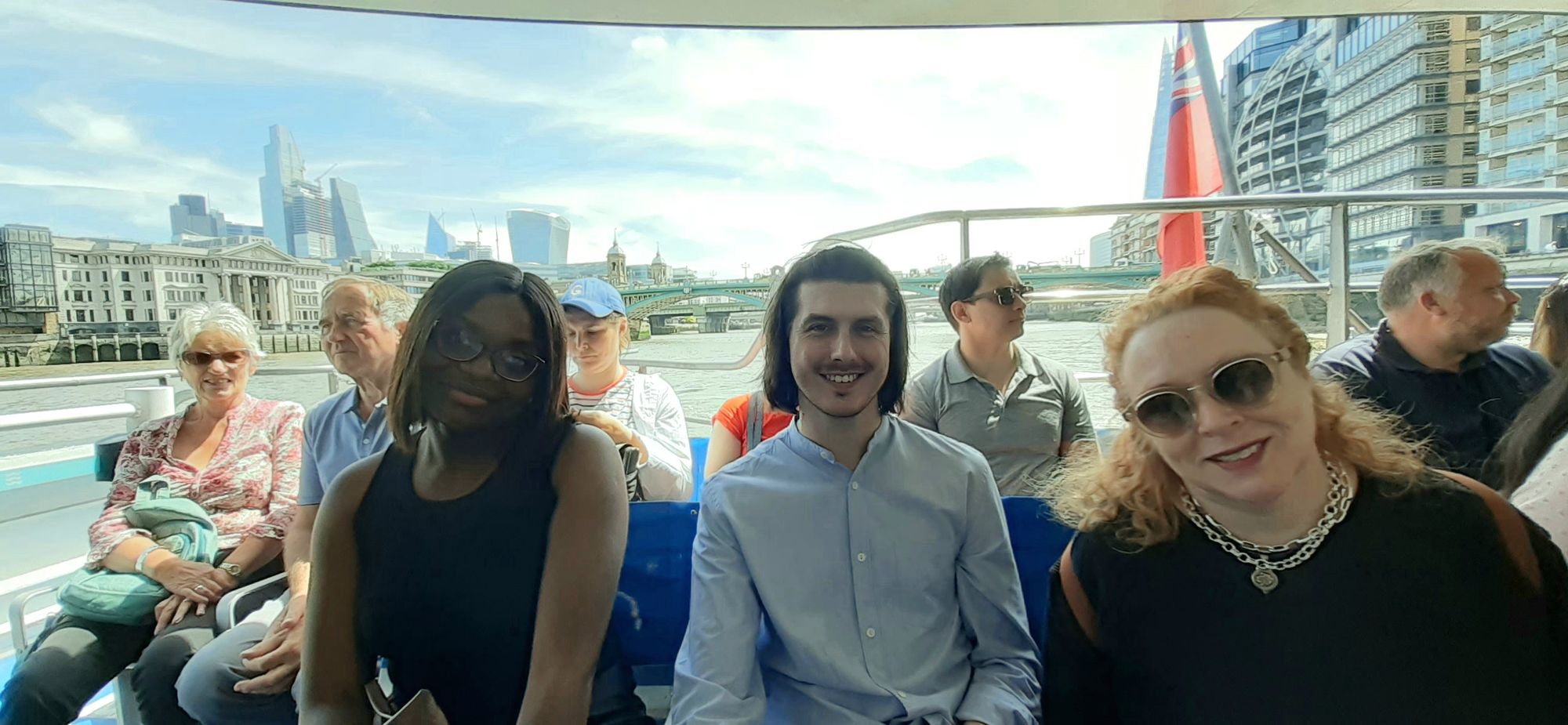 Here are some of my colleagues on the first boat. It was late, so it was going to be very tight to catch the boat to Kew. Me with the London Eye in the background: