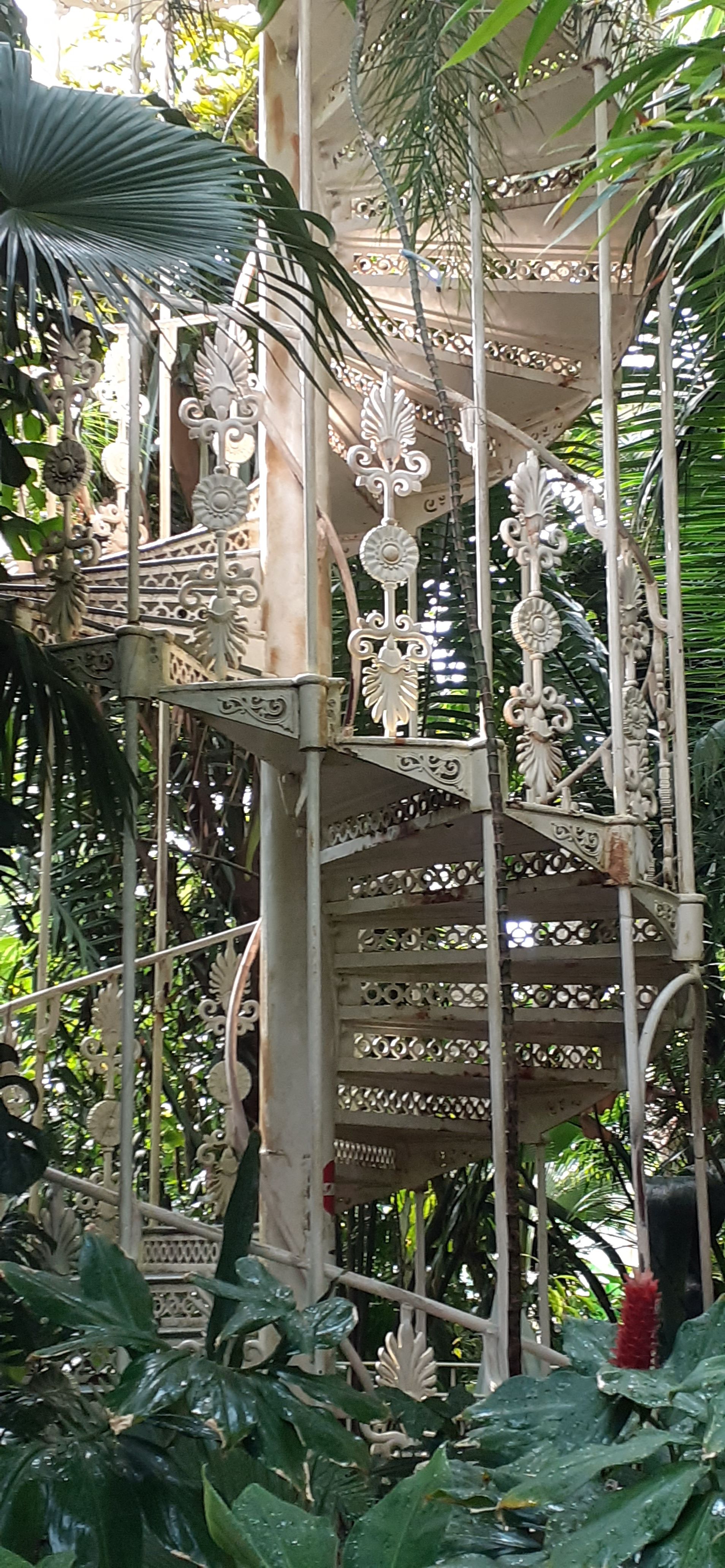 My impressions of Kew Gardens. Not many gardens! Most of the surface area I saw was either brown mowed grass or tall brown meadow grasses. I saw only one formal garden--a broad walk that had deep borders on either side. I'm assuming Kew has decided--bravely--not to fight climate change by foregoing watering of massive green lawns. So the greenhouses were the highlight. Here is a fabulously ornate staircase--like the bridges, needlessly and intricately detailed, like the greenhouses themselves.