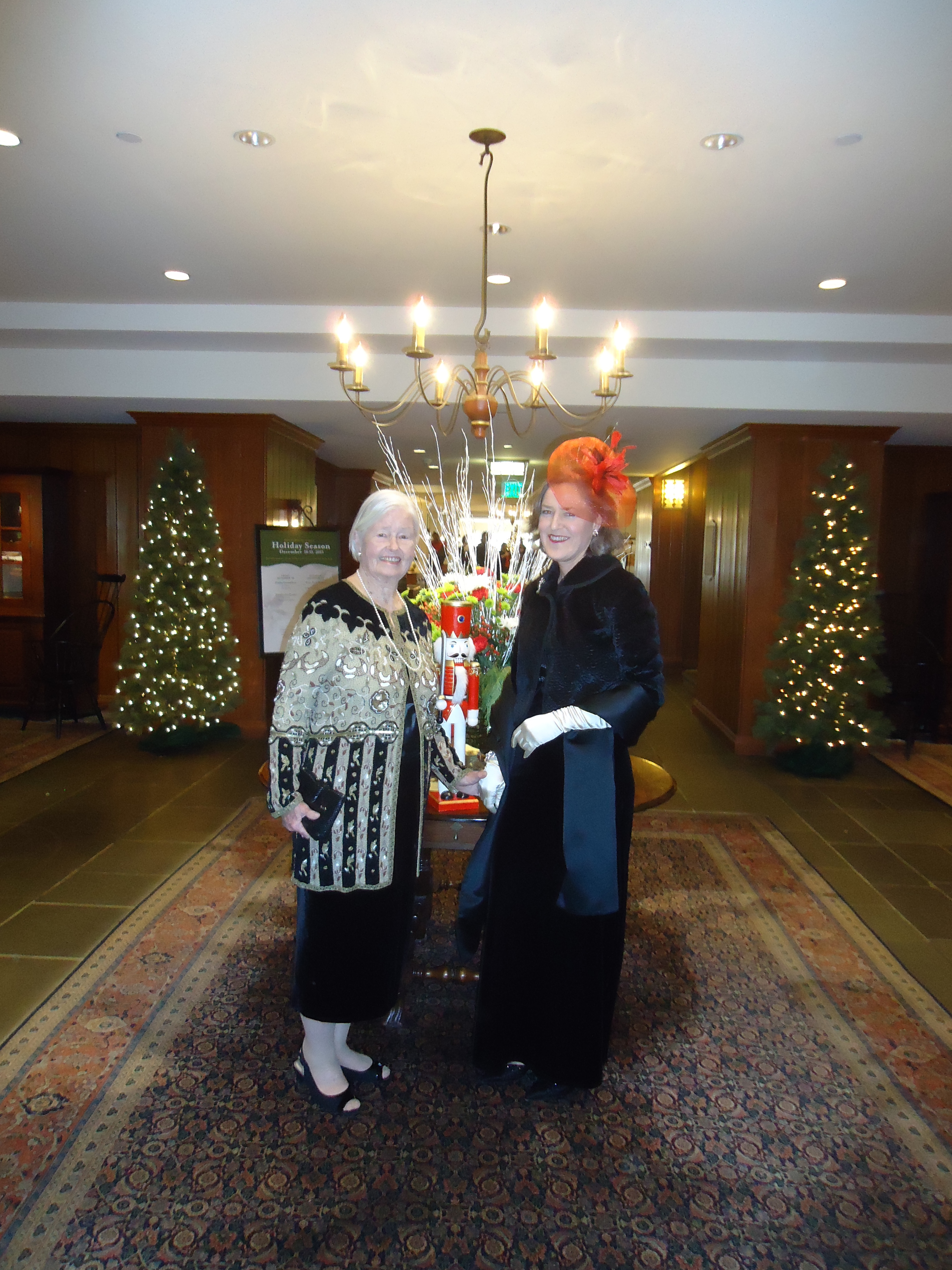 My sister and I don’t speak so I wasn’t entirely looking forward to the big event. Years ago she requested that I stay out of her life during a conversation in which she said a lot of things to me that made me realise that that was indeed the best option. I entertained the thought of introducing myself at the wedding as the evil sister, which I expect is how I’m known to Beth’s friends. David suggested I wear a skinned Dalmatian and pass myself off as Cruella de Vil. As it happens, this is what I wore. Here’s me and mom at the Williamsburg Lodge.