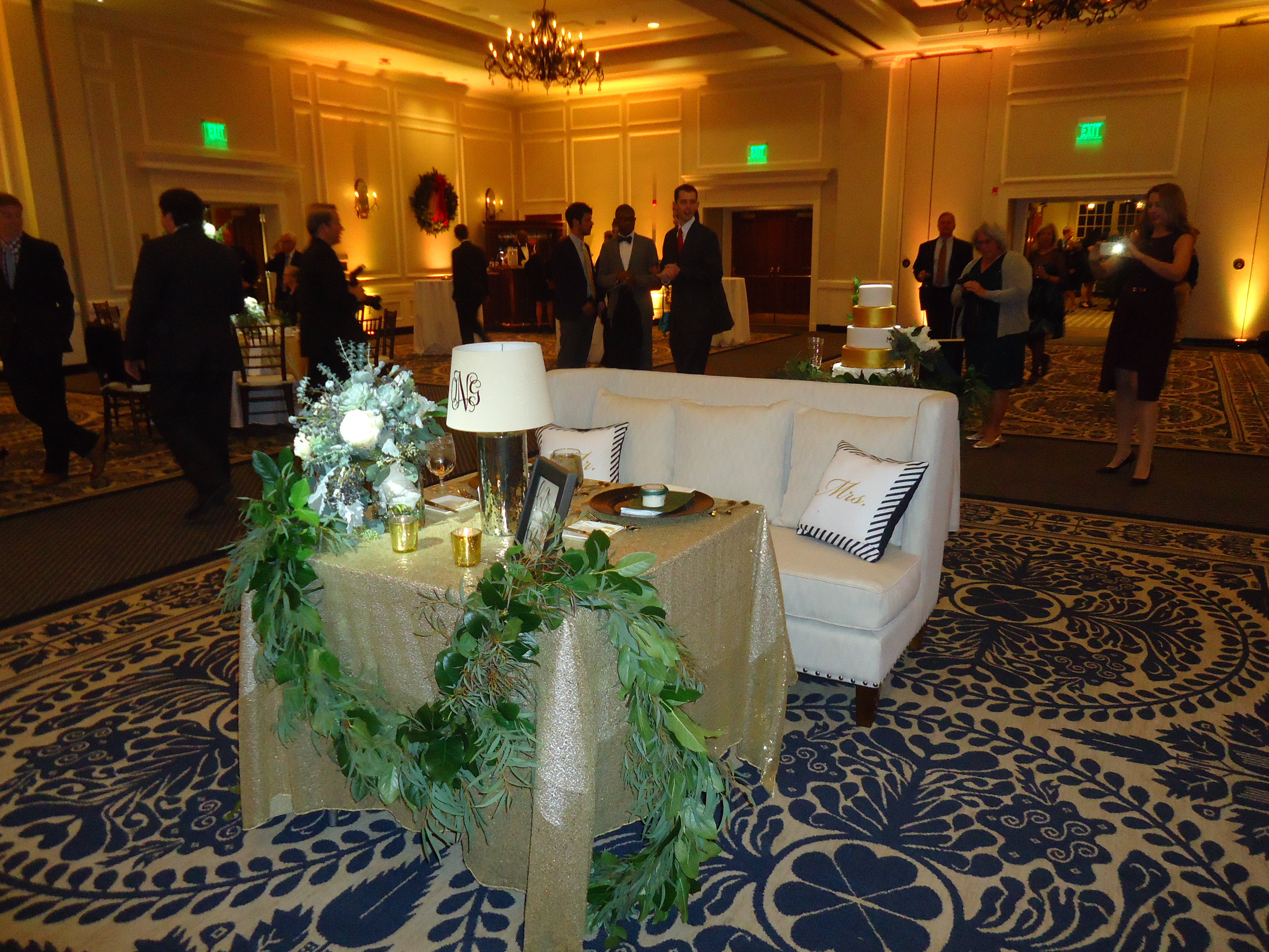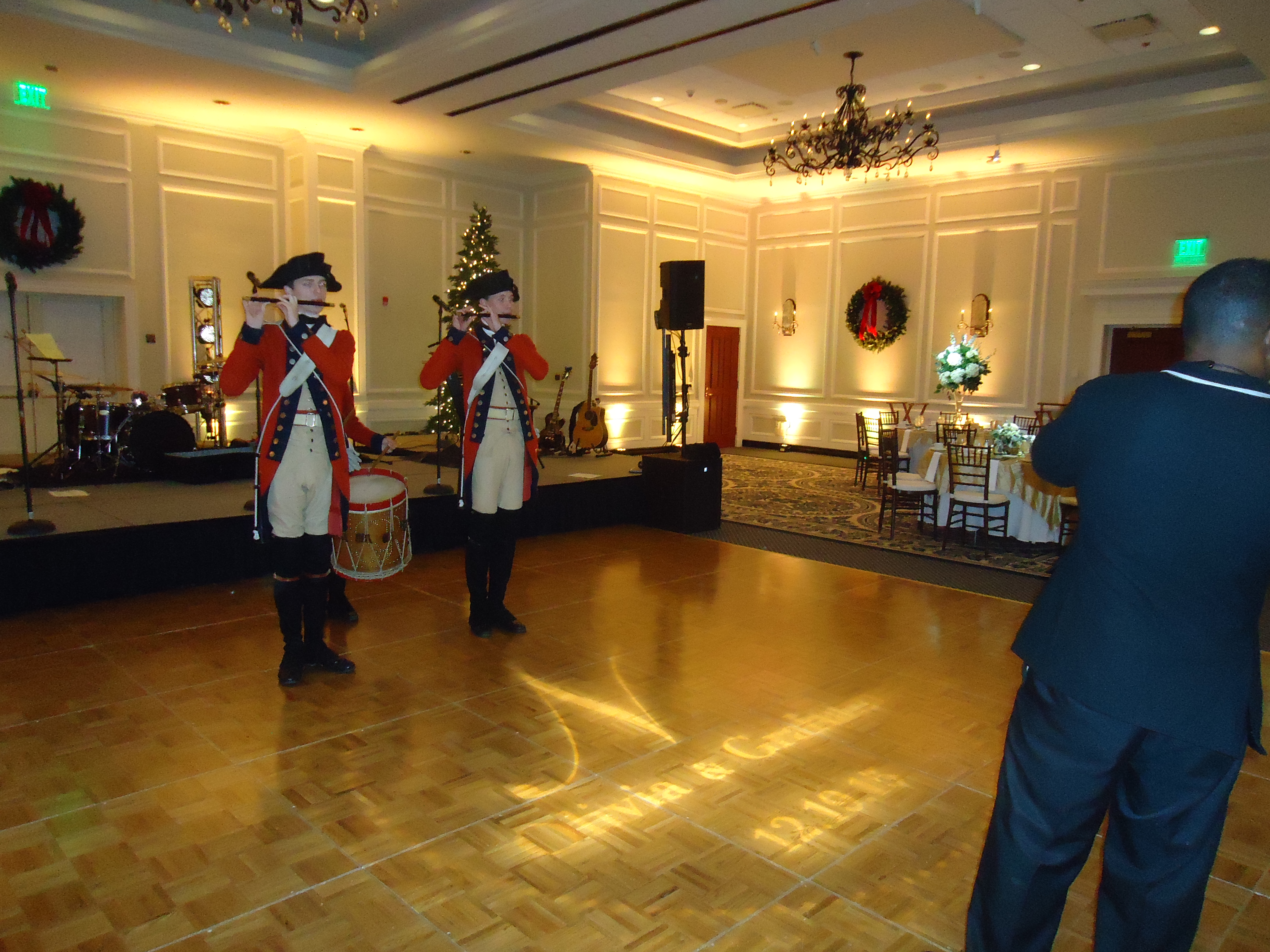 My nephew said I looked like the aunt who lives abroad, so my job was done. I brought a fascinator for mom to wear too, but she declined. This being Williamsburg, we had two pipers and a drummer lead a procession from the reception to the dinner. Note the newlywed’s initials projected onto the floor.