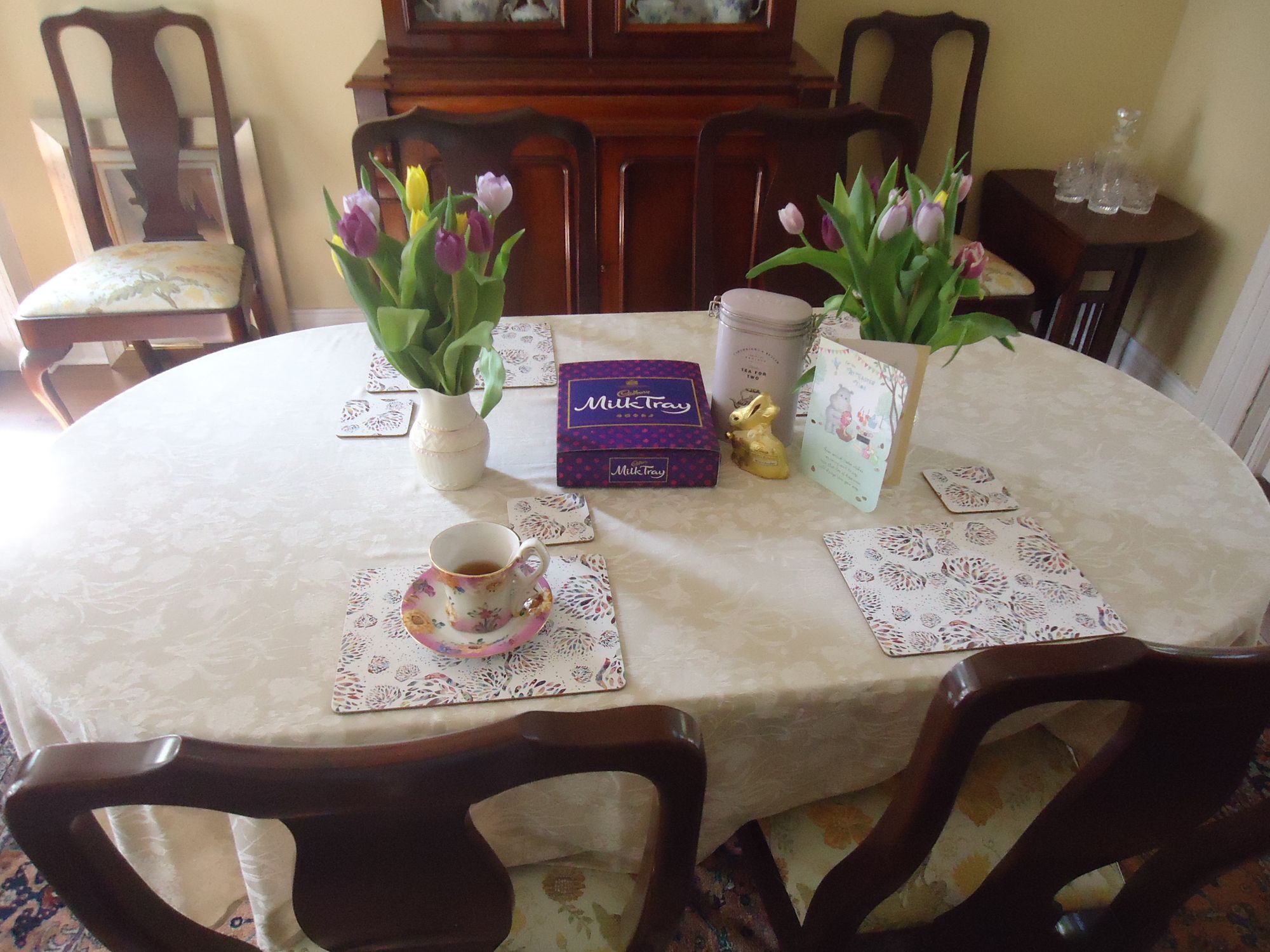 My solace today was a gorgeous run this morning with Paddy through the Lagan meadows, where the valleys were filled with mist, and a late evening walk on the lovely coastal path, from Crawfordsburn to Bangor and back. In between I worked away on my home projects. I also enjoyed a table decorated with gifts from friends. My mom is visiting my sister, so I didn't get to talk to her today, or last Sunday. It's part of my dysfunctional family package. Hence my joy at being reminded of my friends every time I walk by this table, laden with gifts from Julie, Dara, Meabh, and Eddis.