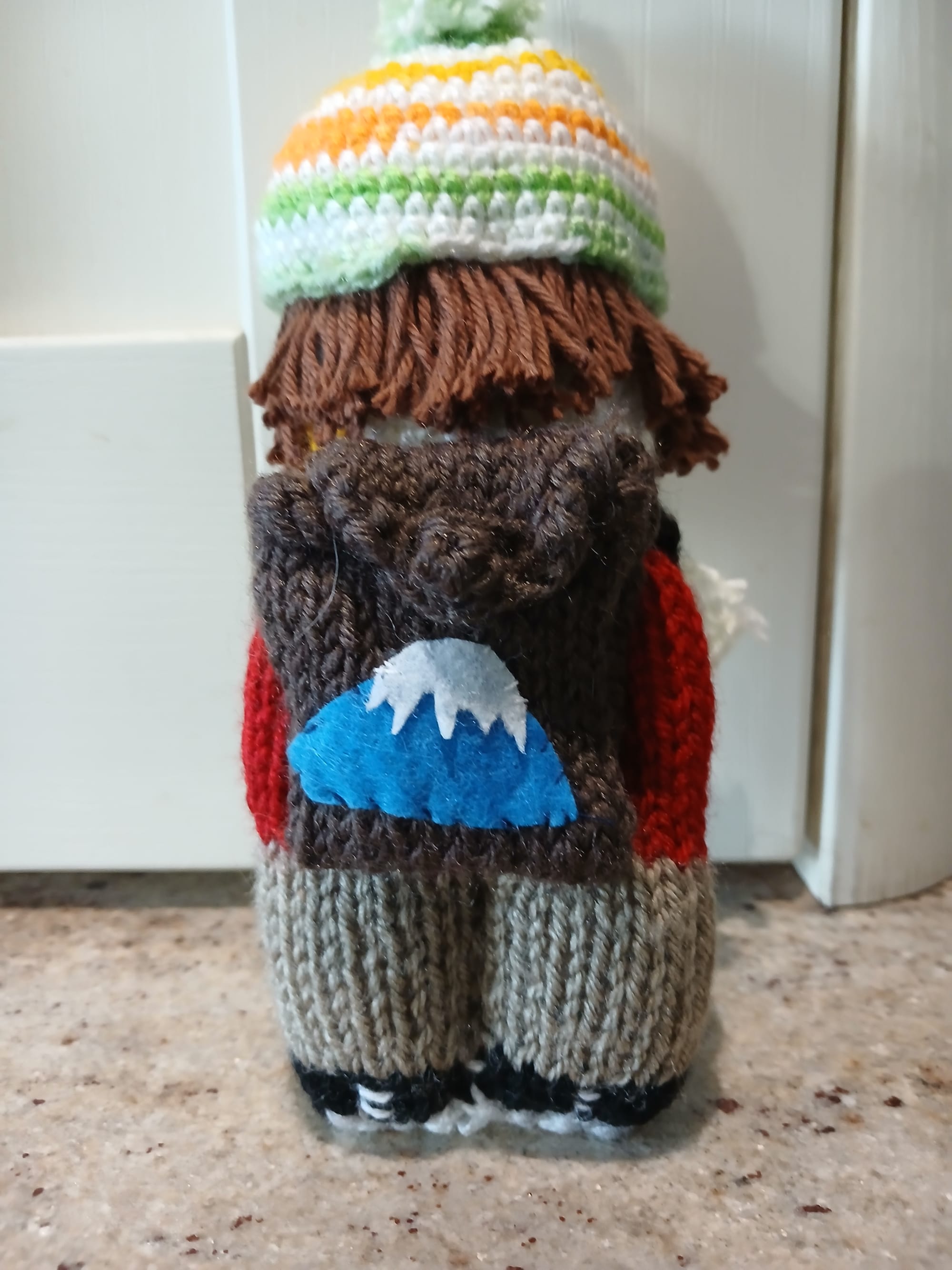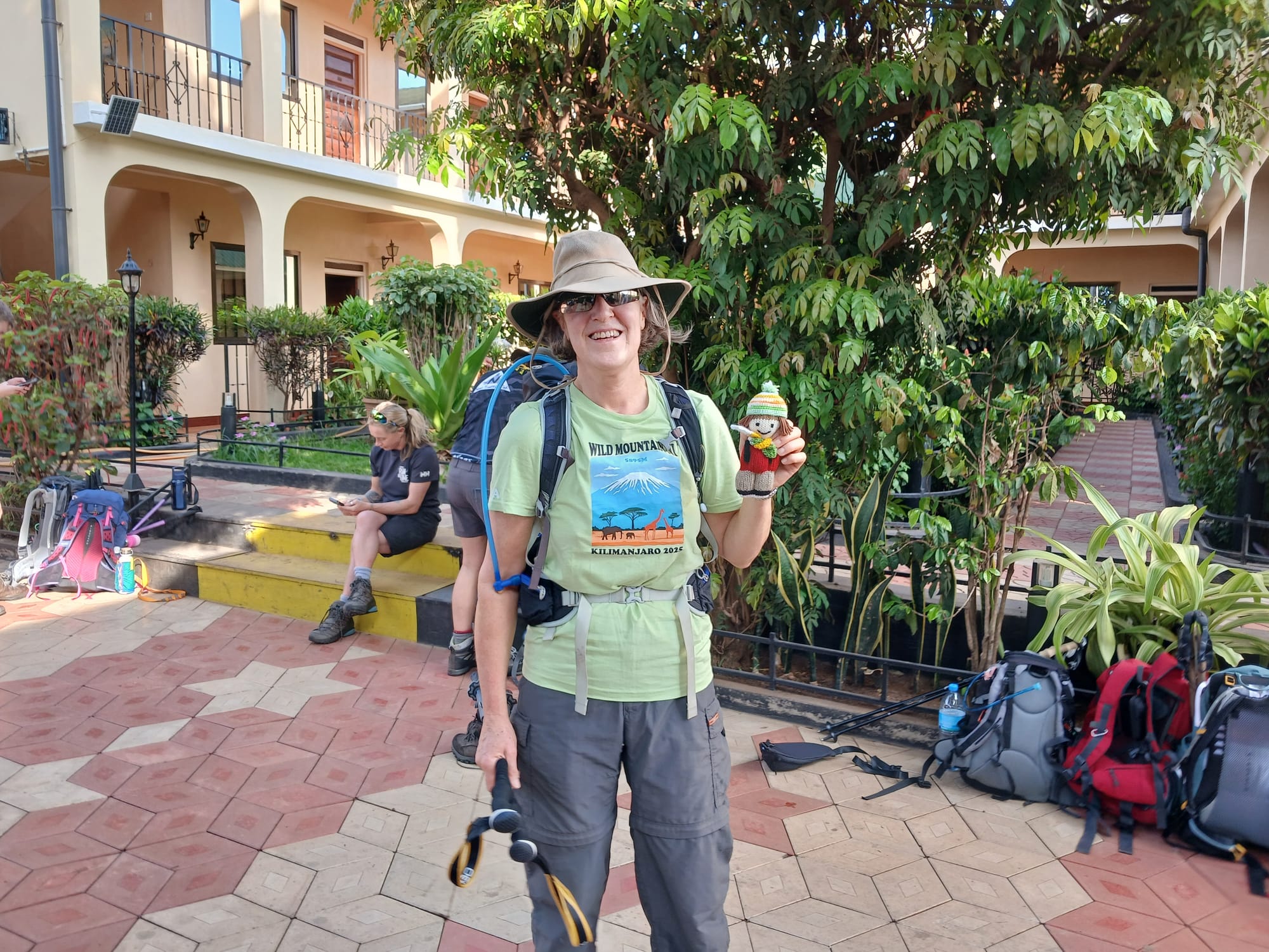 Once all the bags were loaded on the bus, we got on board and headed to Machame Gate, maybe a 1.5-hour drive. Here I am clean for the last time in a week. I'm holding the mini-me Aelish made for me and wearing the t-shirt Cathy had designed for the trip.