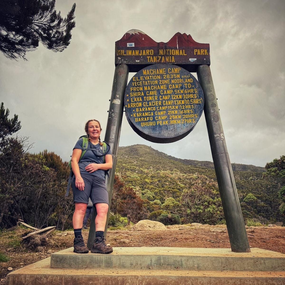 Each camp has a sign like the one below. Next to it is Karen, one of my favourite hikers because she is so positive and upbeat – really good traits for a hiker. Note the sign lists the camps we will stay at (although our fairly aggressive route skipped two of these camps).