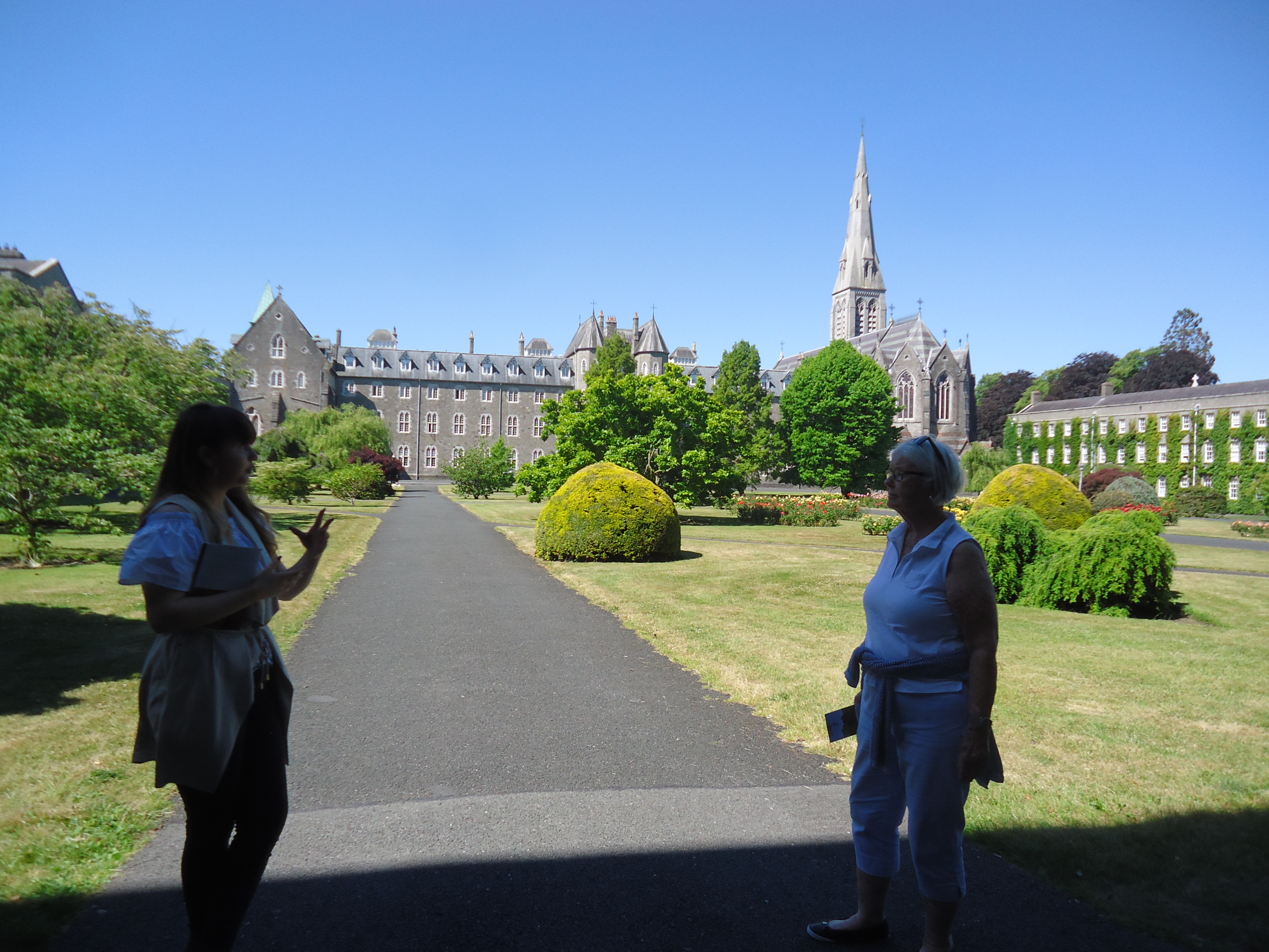 I carefully wrote down directions from the hotel to Maynooth and from Maynooth to Belfast. I didn’t note where does the 11 a.m. tour start? South campus? North campus? And where to park? A bit of panic in Maynooth as I figured this out, but a friendly professor told me I could park for free in the faculty lot (on-street parking limited to an hour, which was a problem. No time for breakfast, another problem for me). Then he escorted us to the visitor centre across campus. The photo above is mom at the start of the tour. The tour guide told us today’s tour would be 30 minutes instead of 50 minutes because the chapel, the highlight of the tour, wasn’t open today. Whereupon I did my routine about my 86 year old mother traveling all the way from America to see the chapel. Whereupon she said she’d see what she could do. Here’s the chapel: