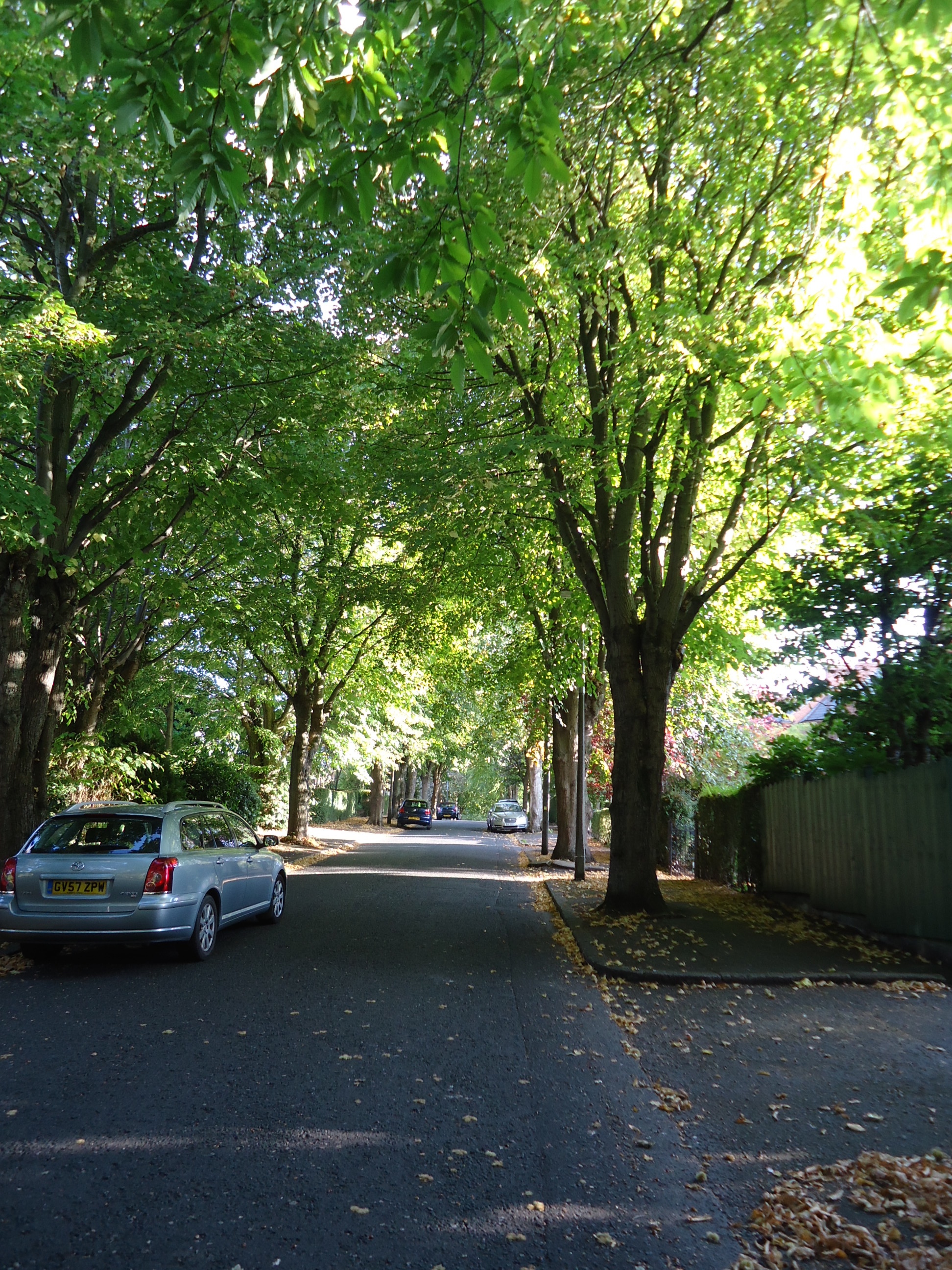 This photo is of our new street! I took it a few weeks ago. That's our car on the left. Our house is on the right just beyond where the car on the right is parked. I love the mature trees lining the street.