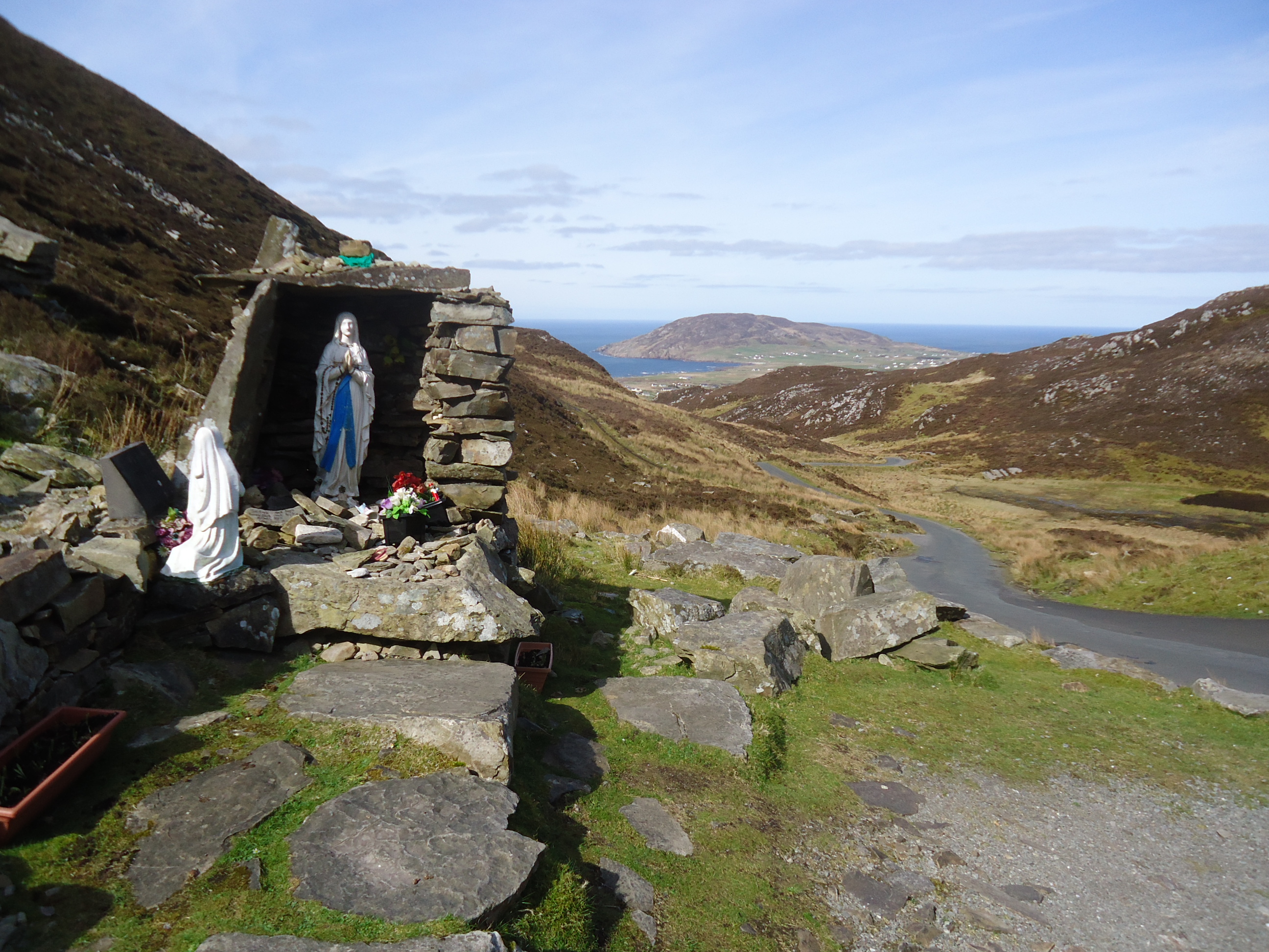 "Near the summit of Mamore Gap a number of holy relics can be found – a holy well devoted to St Eigne and a small alter of statues are the centre point of an annual mass held here every August 15th in commemoration of Penal times when people had to practice their religion in secret to be protected from persecution."