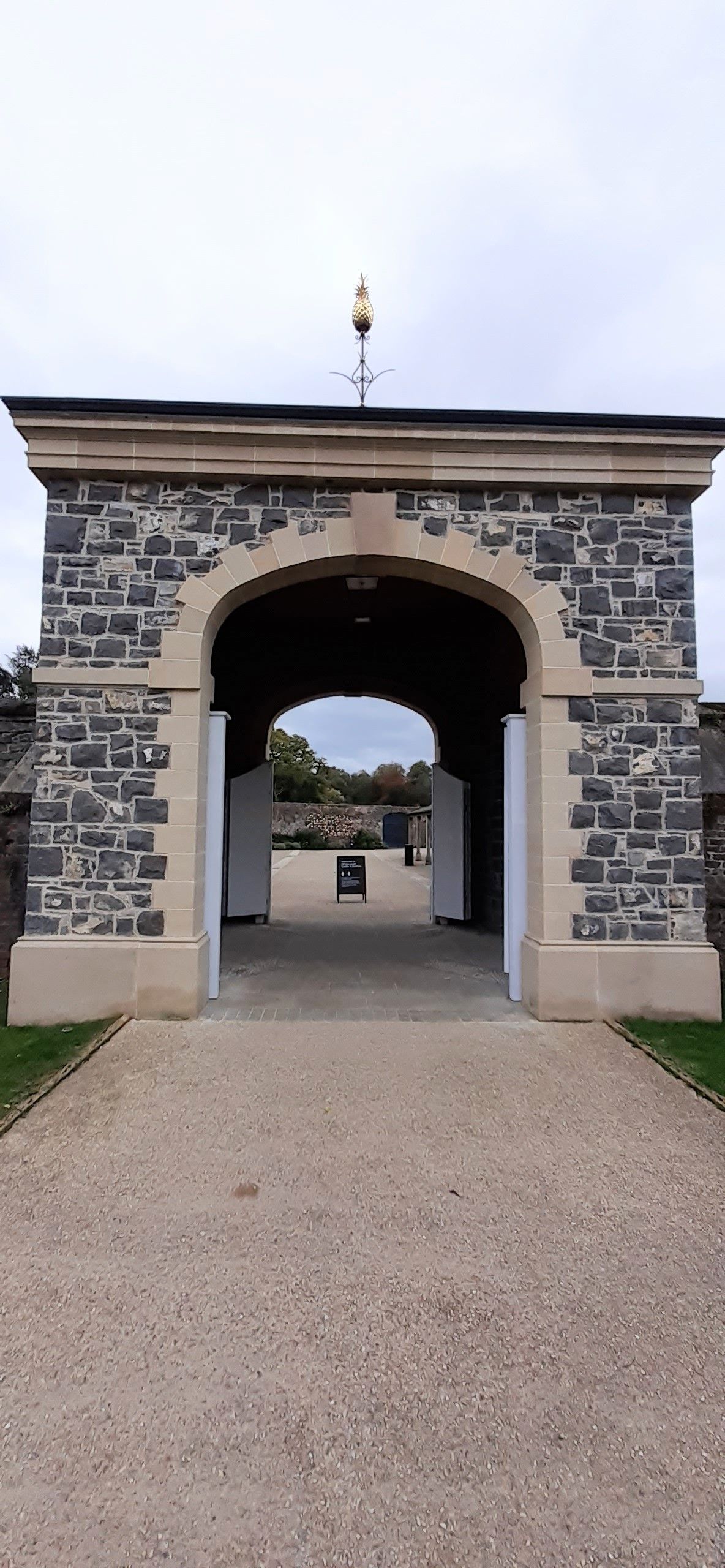 There's a large pineapple on top of the entrance because there were two greenhouses there that once grew pineapples for the estate--quite the luxury centuries ago. A boy slept in the greenhouses to feed the fire all night that kept the pineapple pots warm. The entrance to the gardens was enticing, however we had already logged our miles for the day.