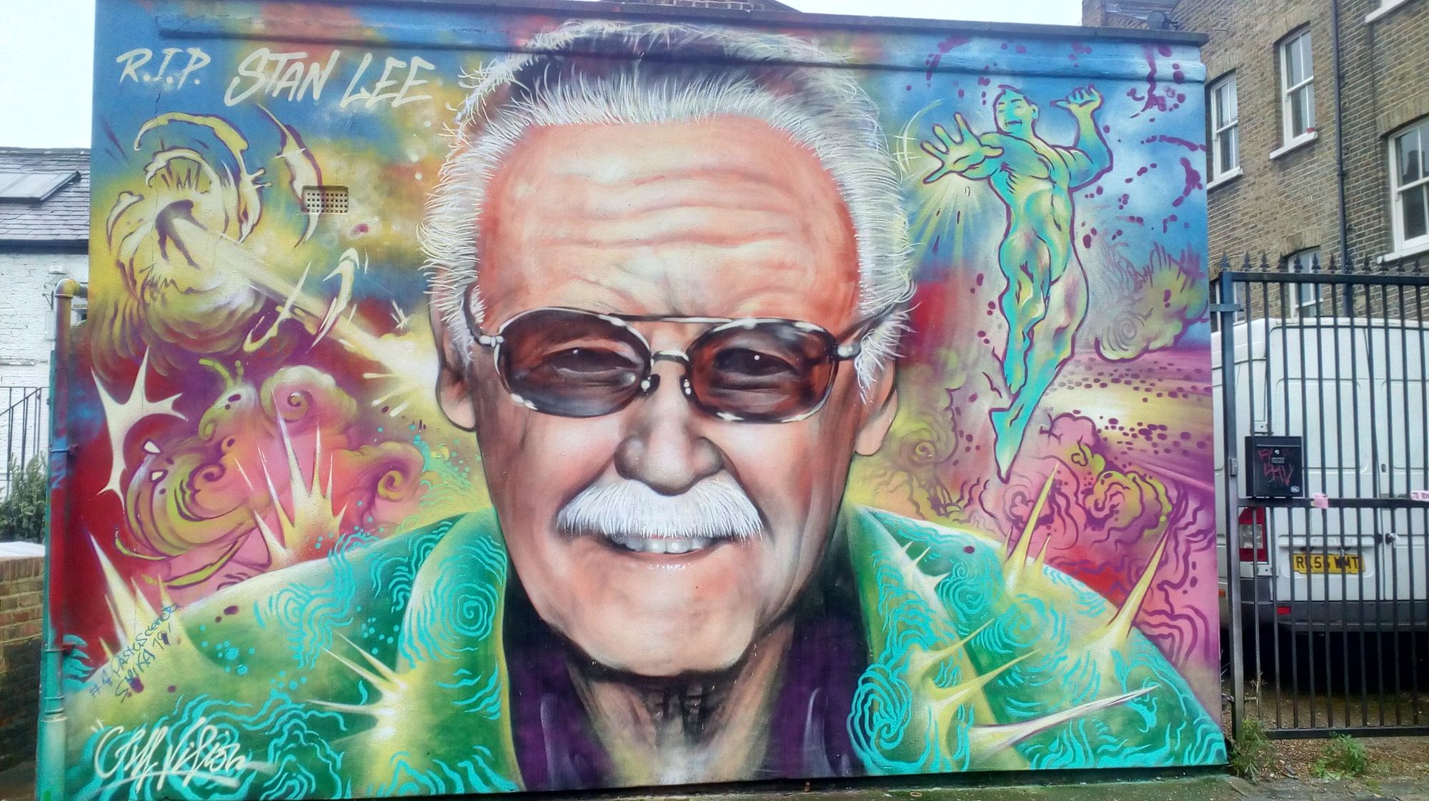 Above is Stan Lee, creator of Marvel comics. This is a new mural on Rhoda Street on my way to work. I love the 25-minute walk to work because I see so many interesting things. About half the walk is on wonderful Brick Lane, with its Bangladeshi restuarants and sweet shops, vintage clothing shops, African chocoloate shops, and bagel shops. Not a chain store in sight.