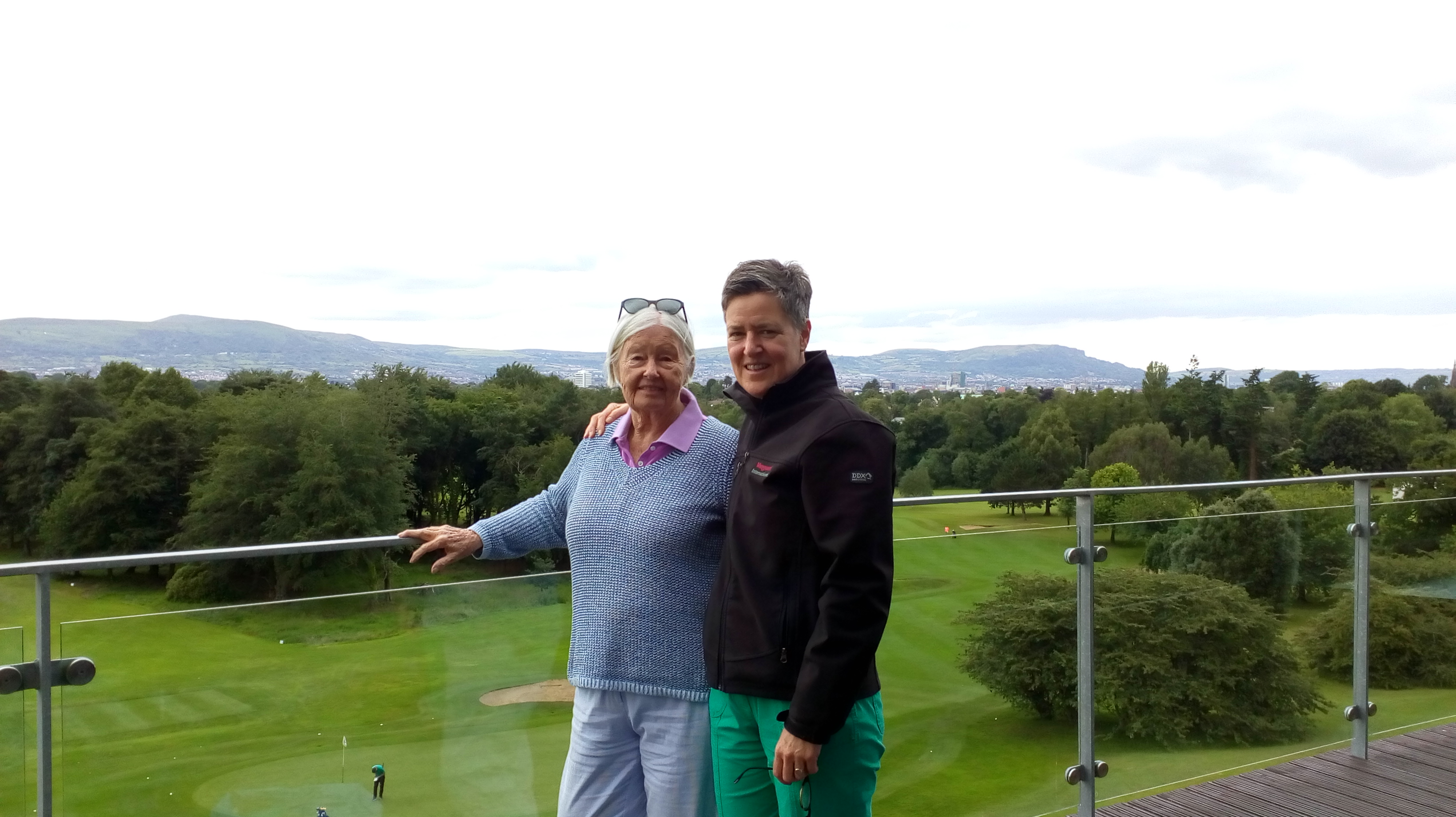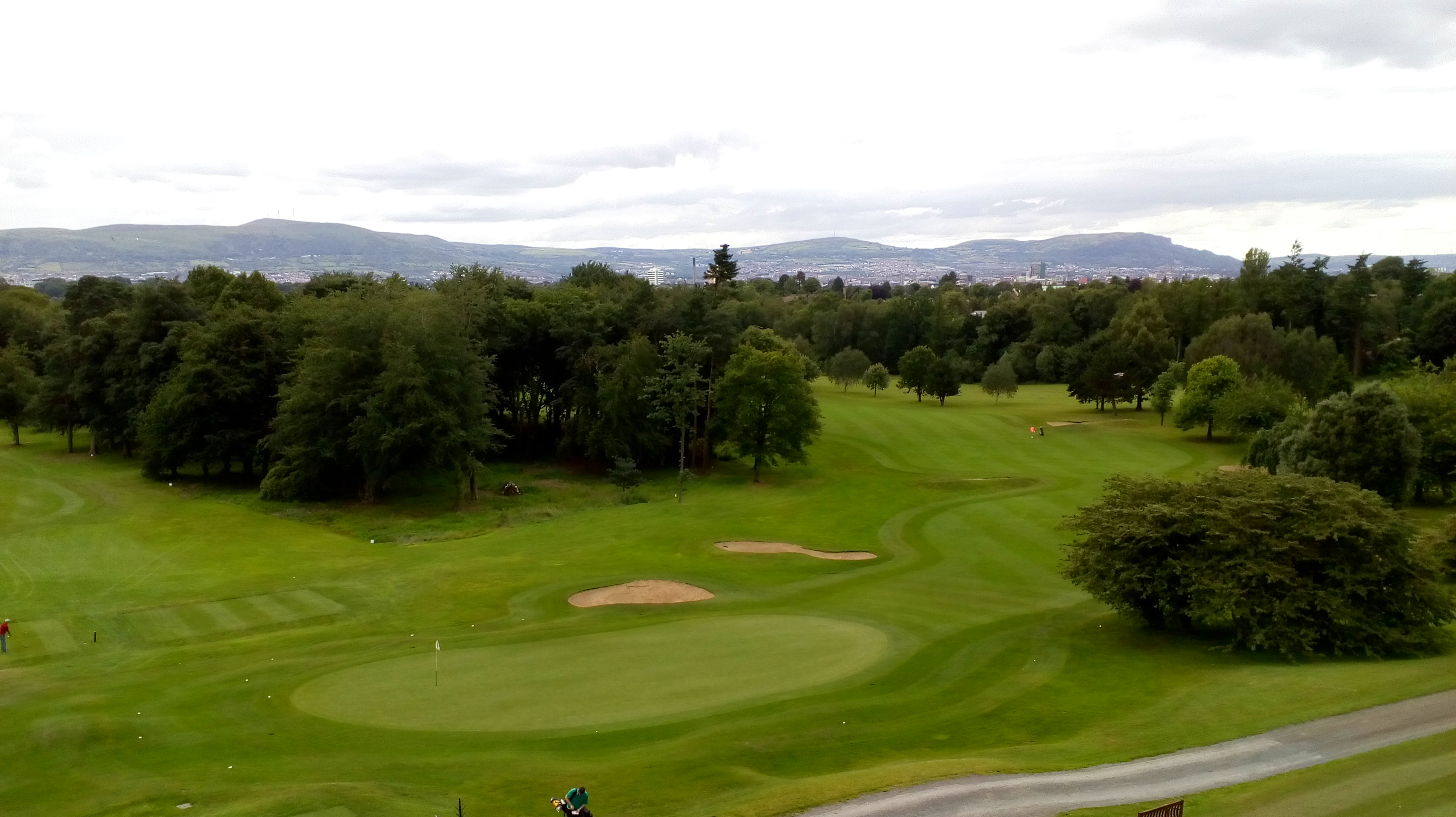 From championship golf on Friday to rank amateur efforts today. I played nine holes at Belvoir Golf Club, where I joined for the summer after taking lessons there. Mom rode along in a buggy, giving me tips. It was a lovely day. As usual, I forgot to take photos on the course. Afterward, we had lunch in the club house. Here’s a view of the course and the Belfast hills in the distance.