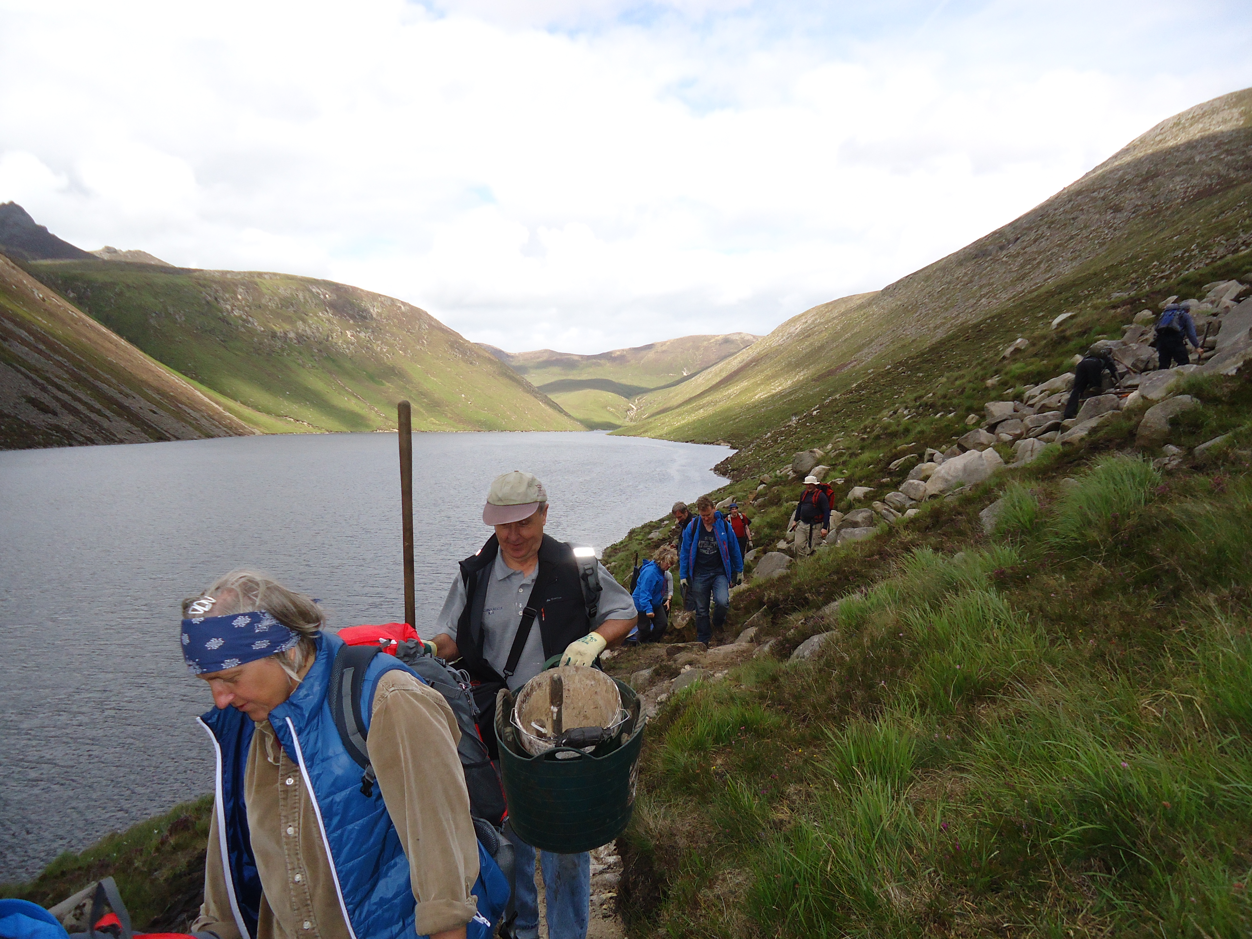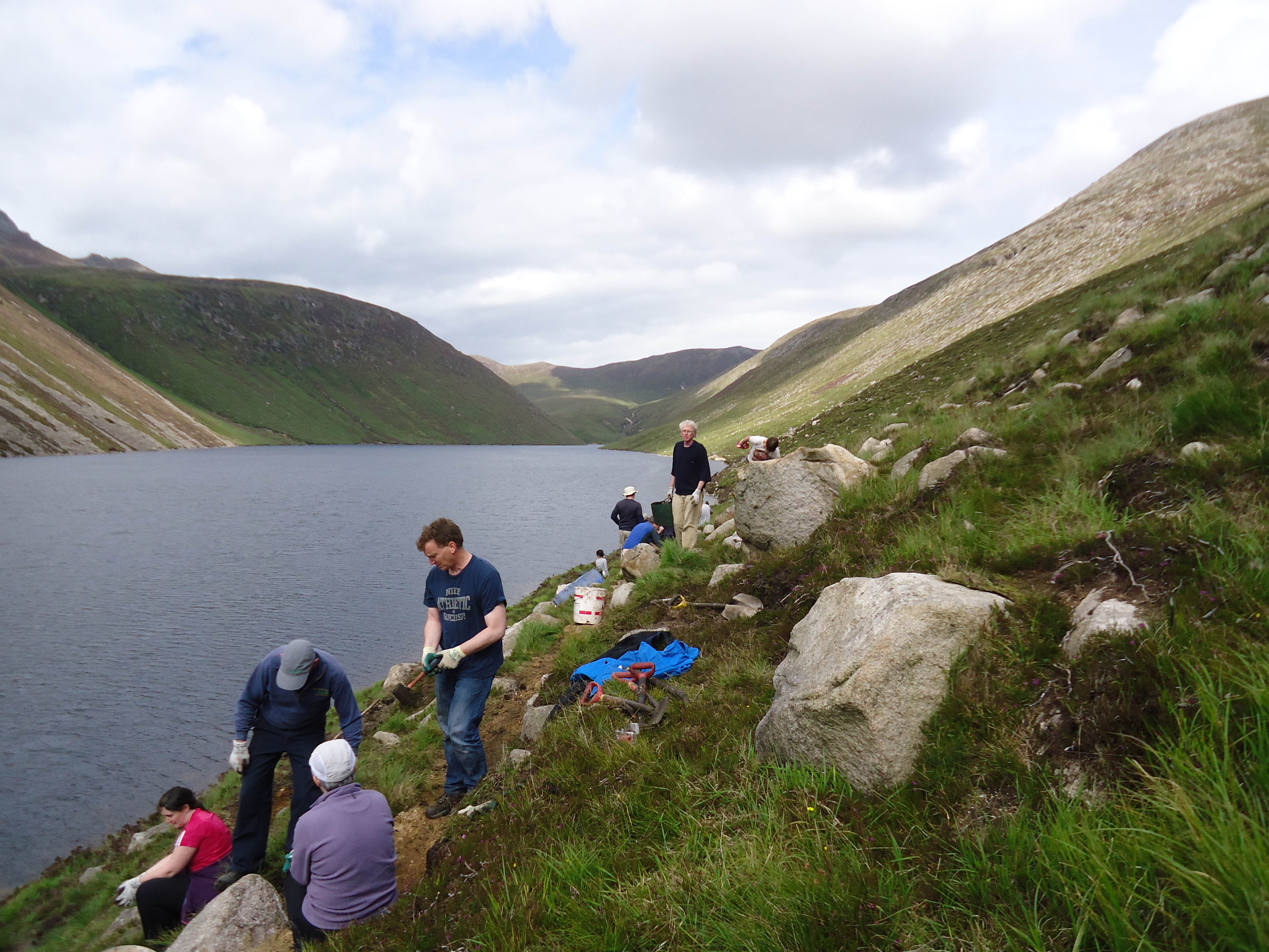 Today I volunteered in the Mourne Mountains with 17 people who busted our humps building trails. The trail nearest the reservoir is caving in in places so we worked on a higher trail. Photos? Of course.
