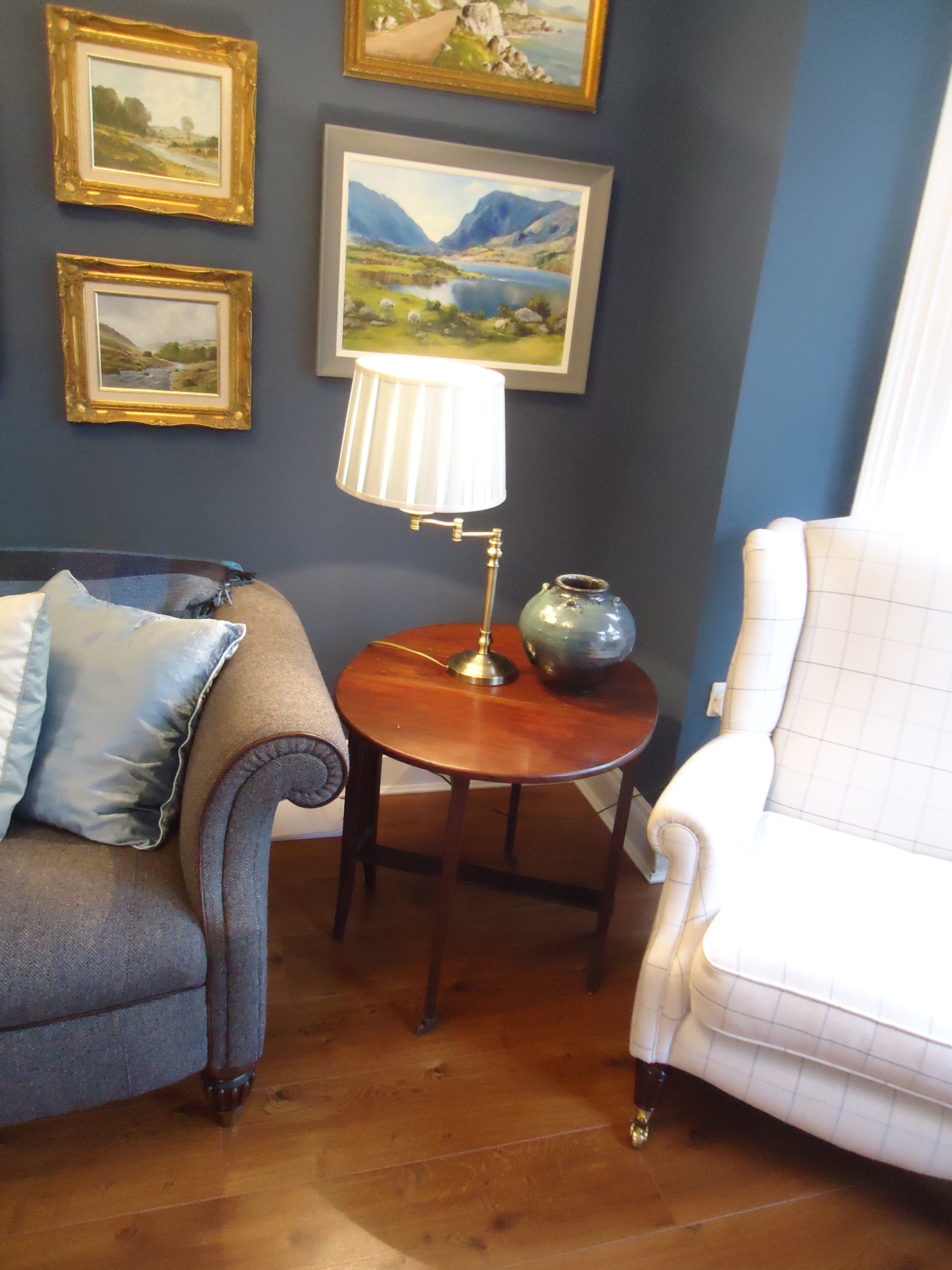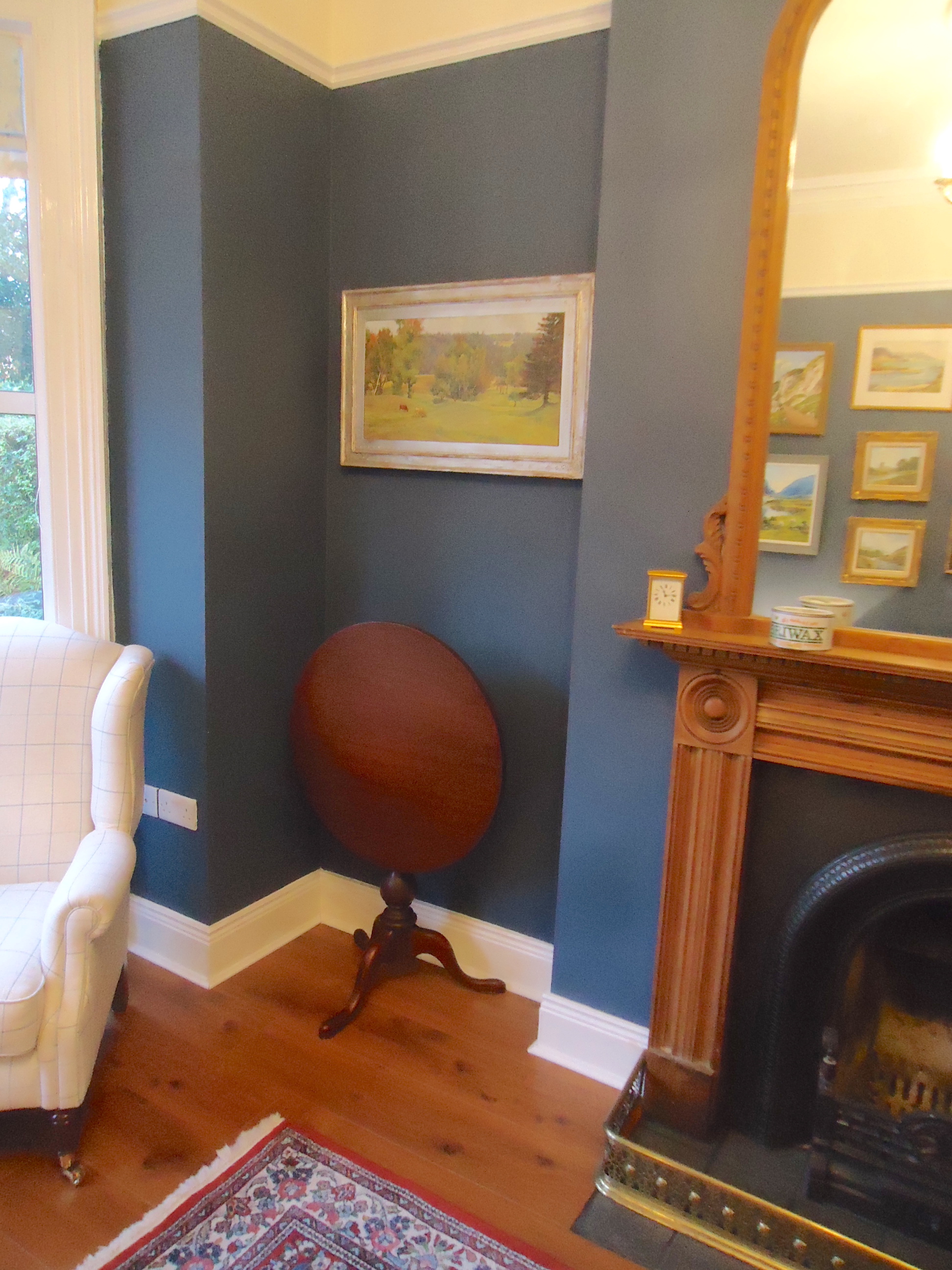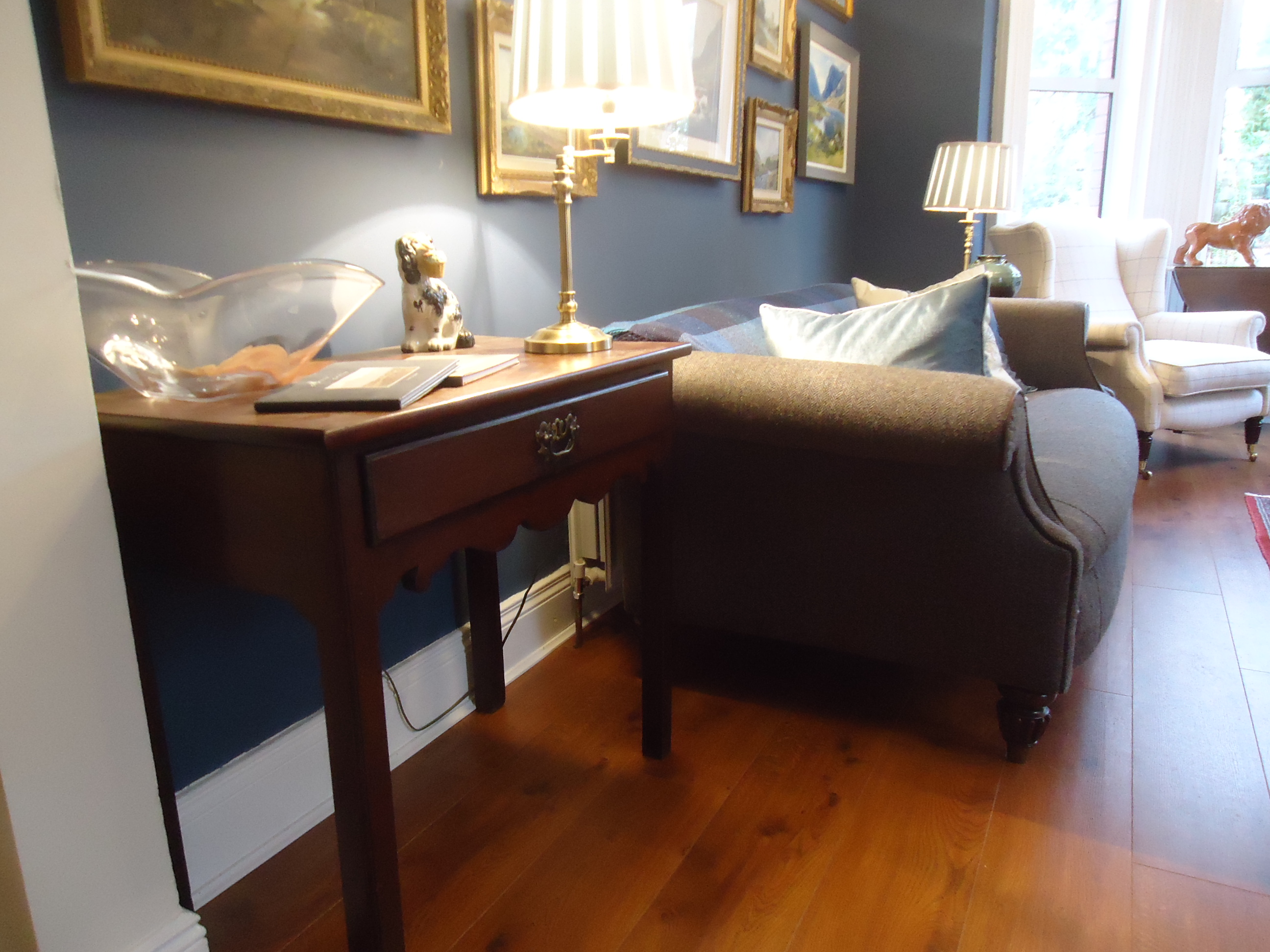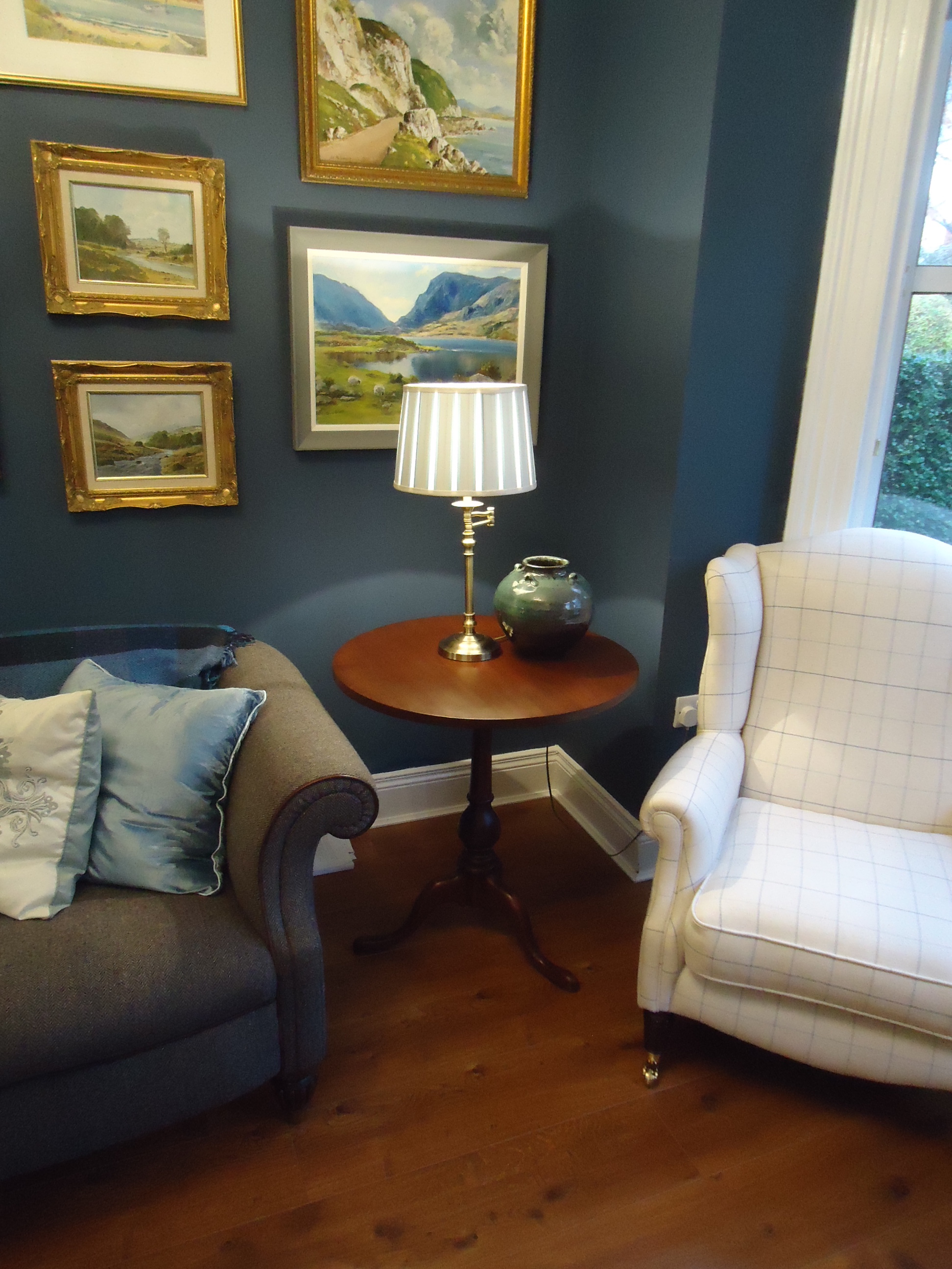 After: It has been replaced by a set of three nesting tables. Maybe not ideal, aesthetically, but very handy when you have visitors and are serving tea and buns. Which I actually did today when a new neighbour stopped by. The next design challenge is replacing the drop leaf on the right. I want something taller that reaches up closer to the middle painting. So far, nothing has taken my fancy.