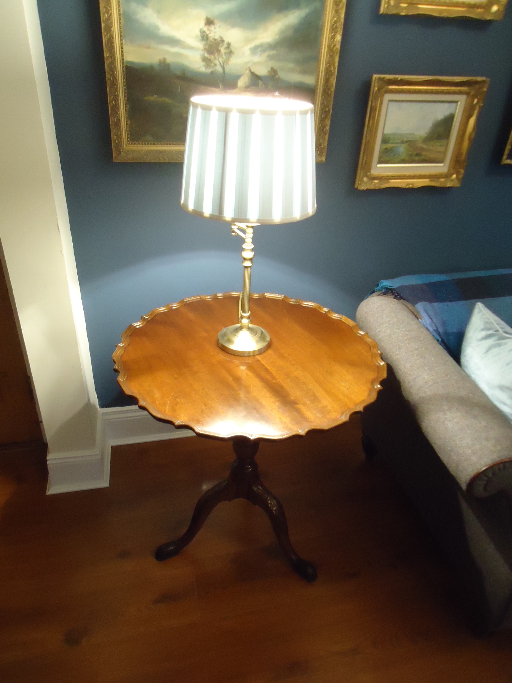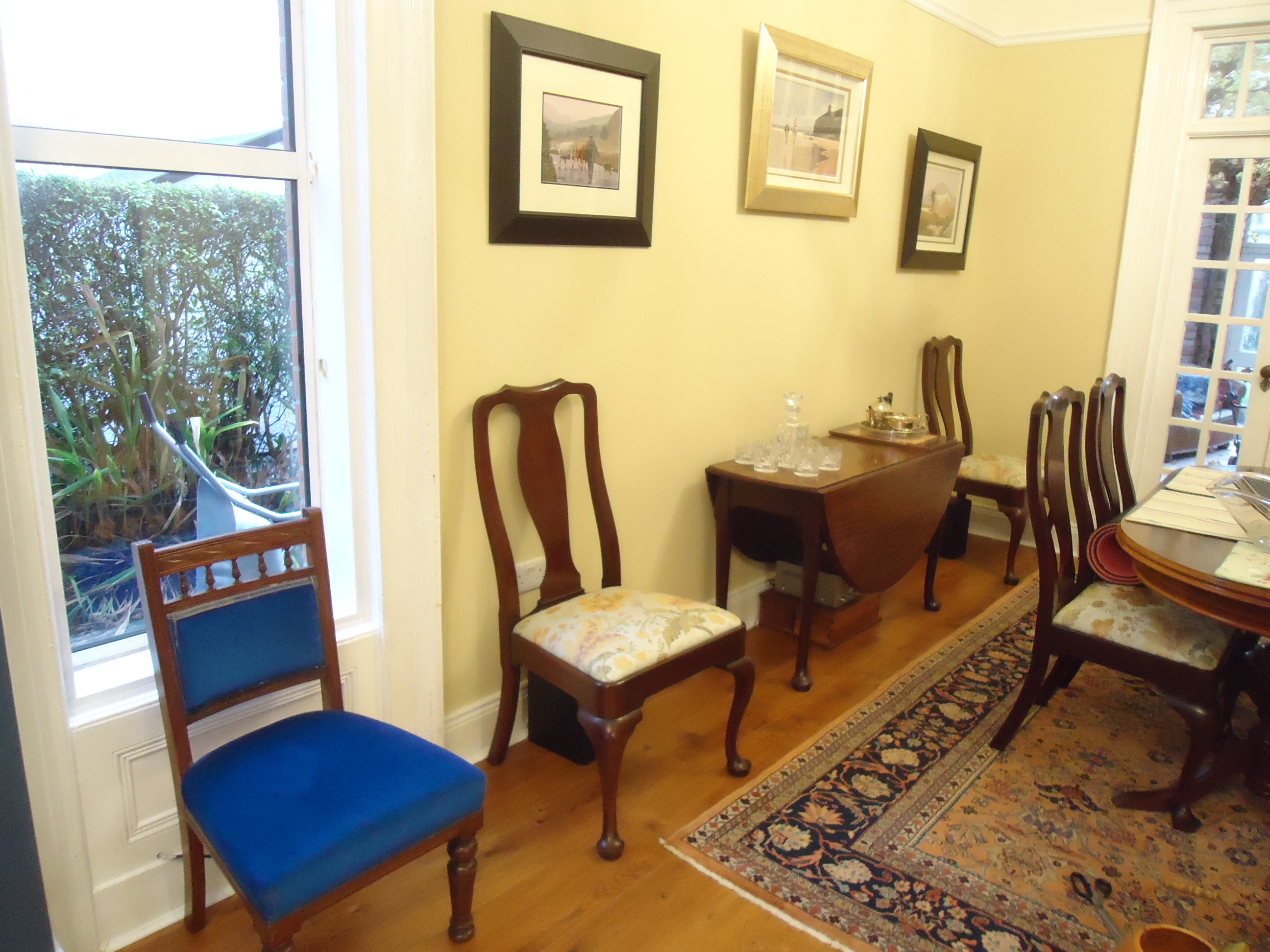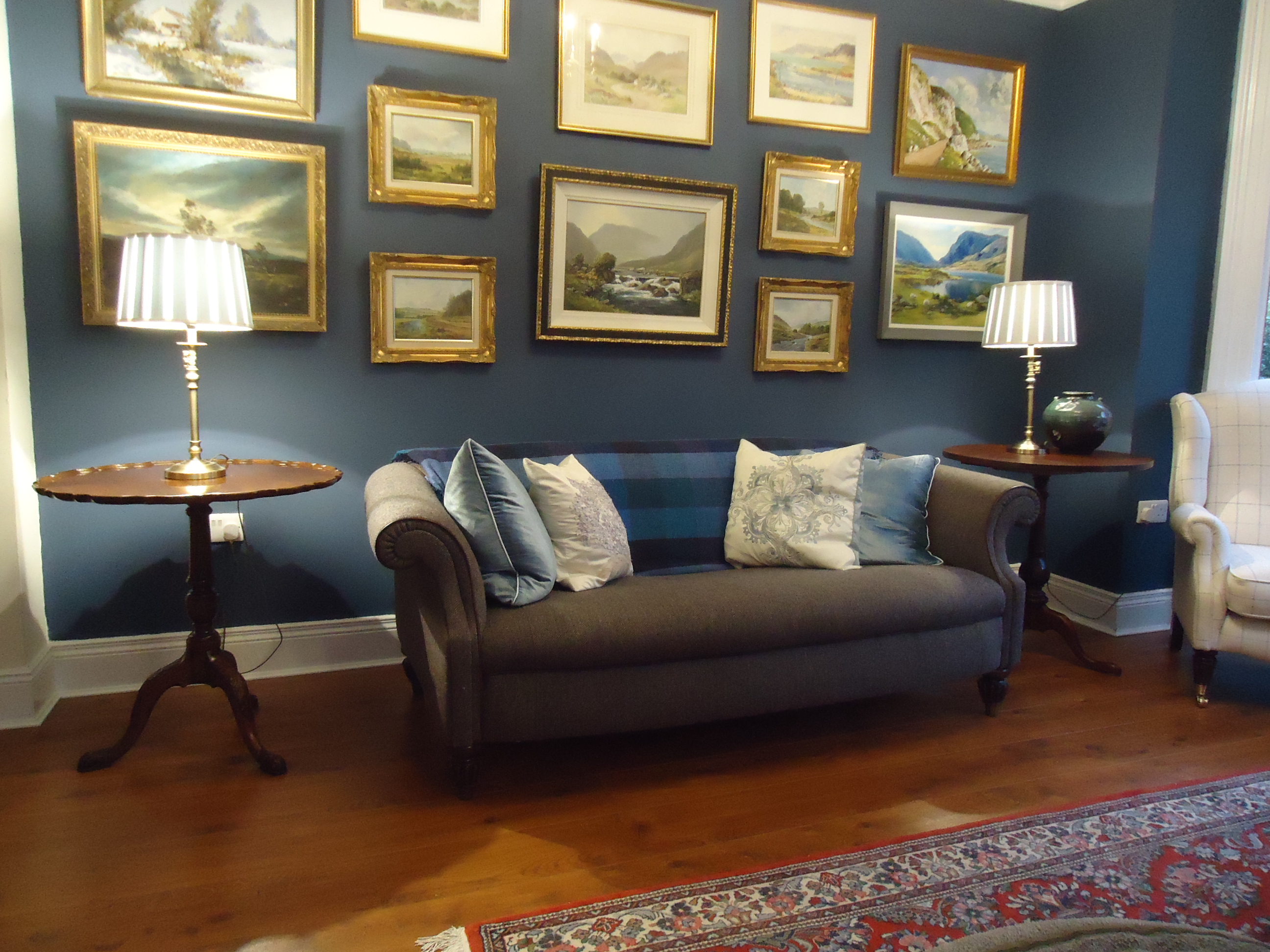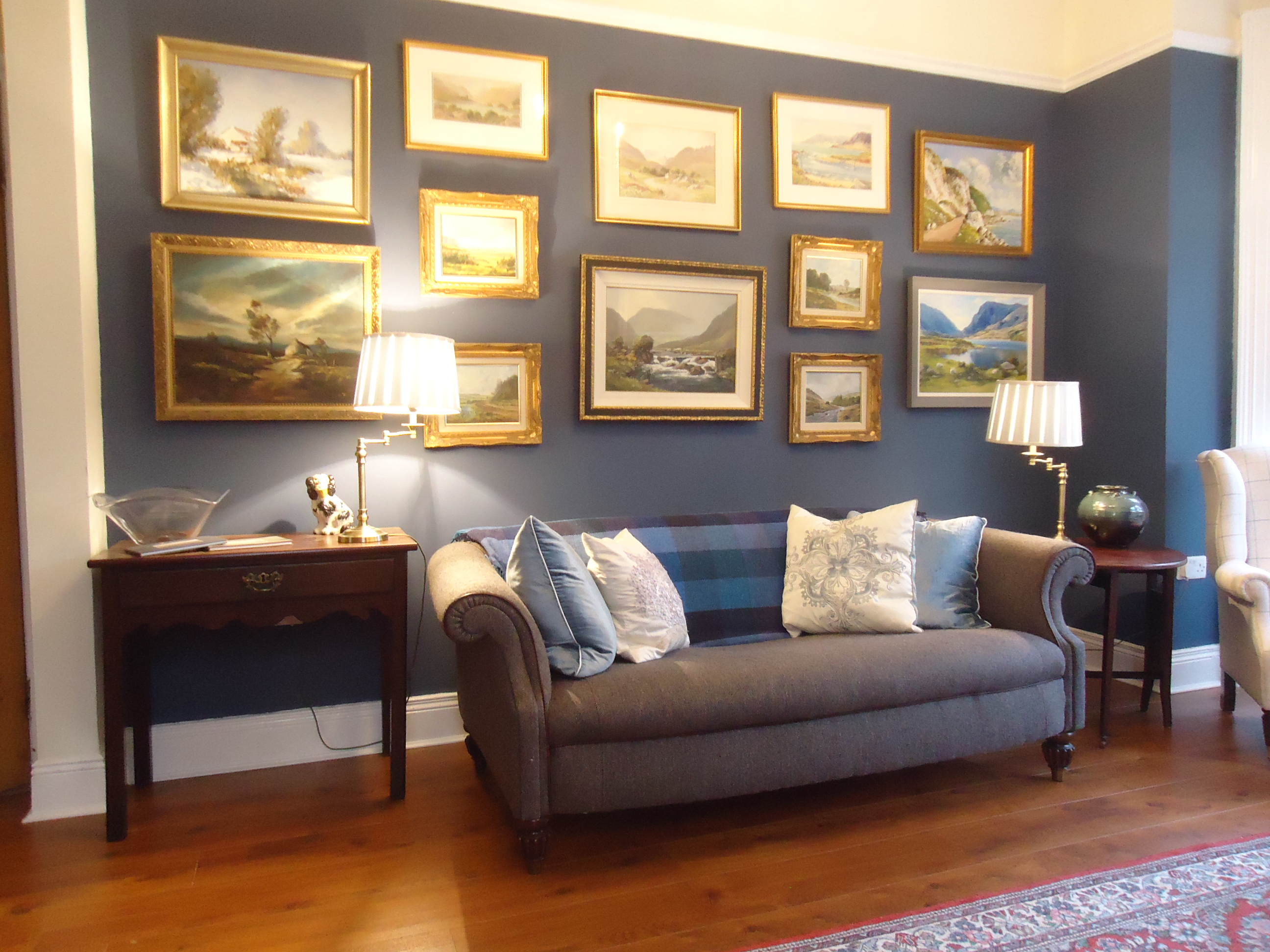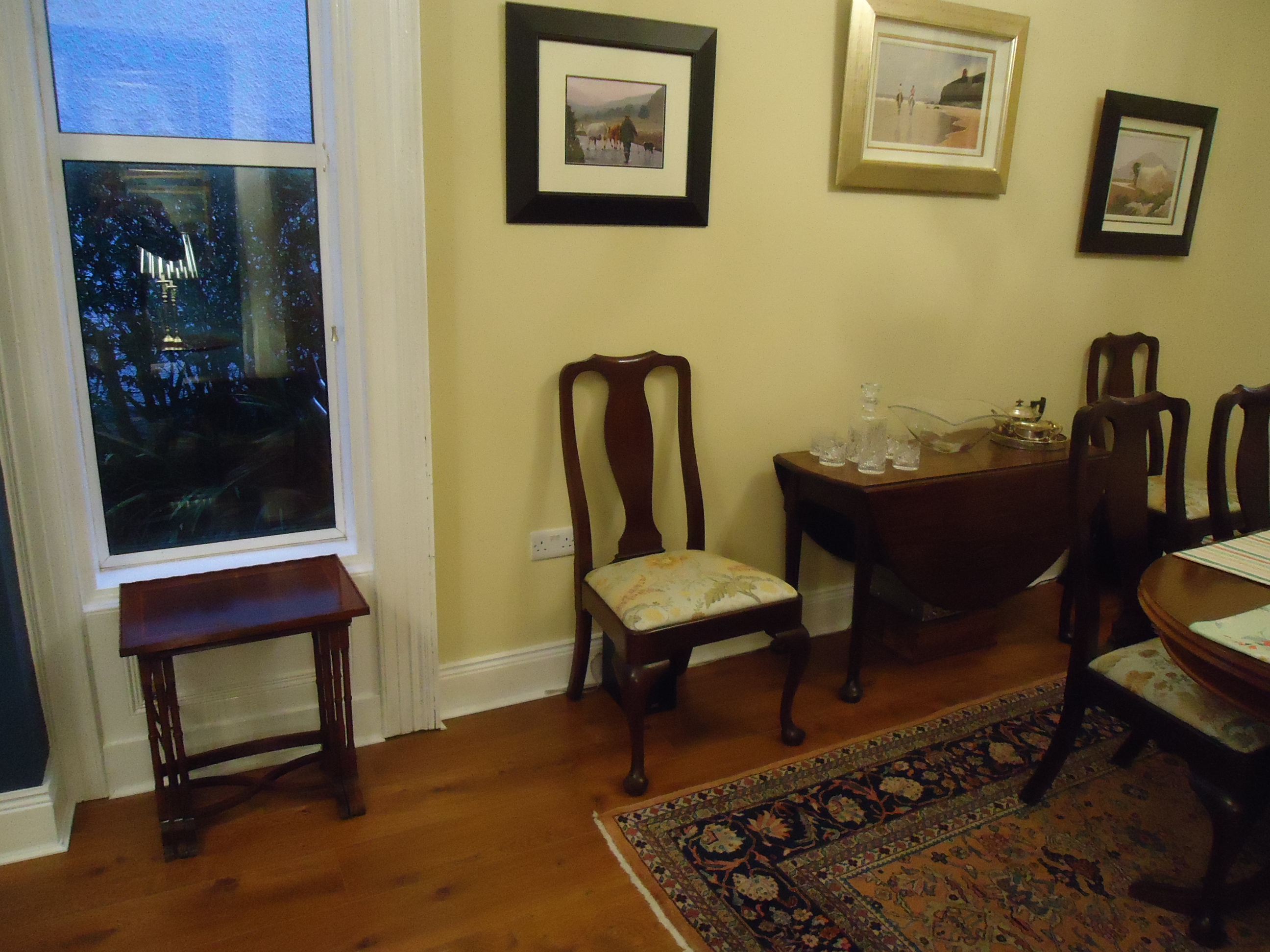 After: It has been replaced by a set of three nesting tables. Maybe not ideal, aesthetically, but very handy when you have visitors and are serving tea and buns. Which I actually did today when a new neighbour stopped by. The next design challenge is replacing the drop leaf on the right. I want something taller that reaches up closer to the middle painting. So far, nothing has taken my fancy.