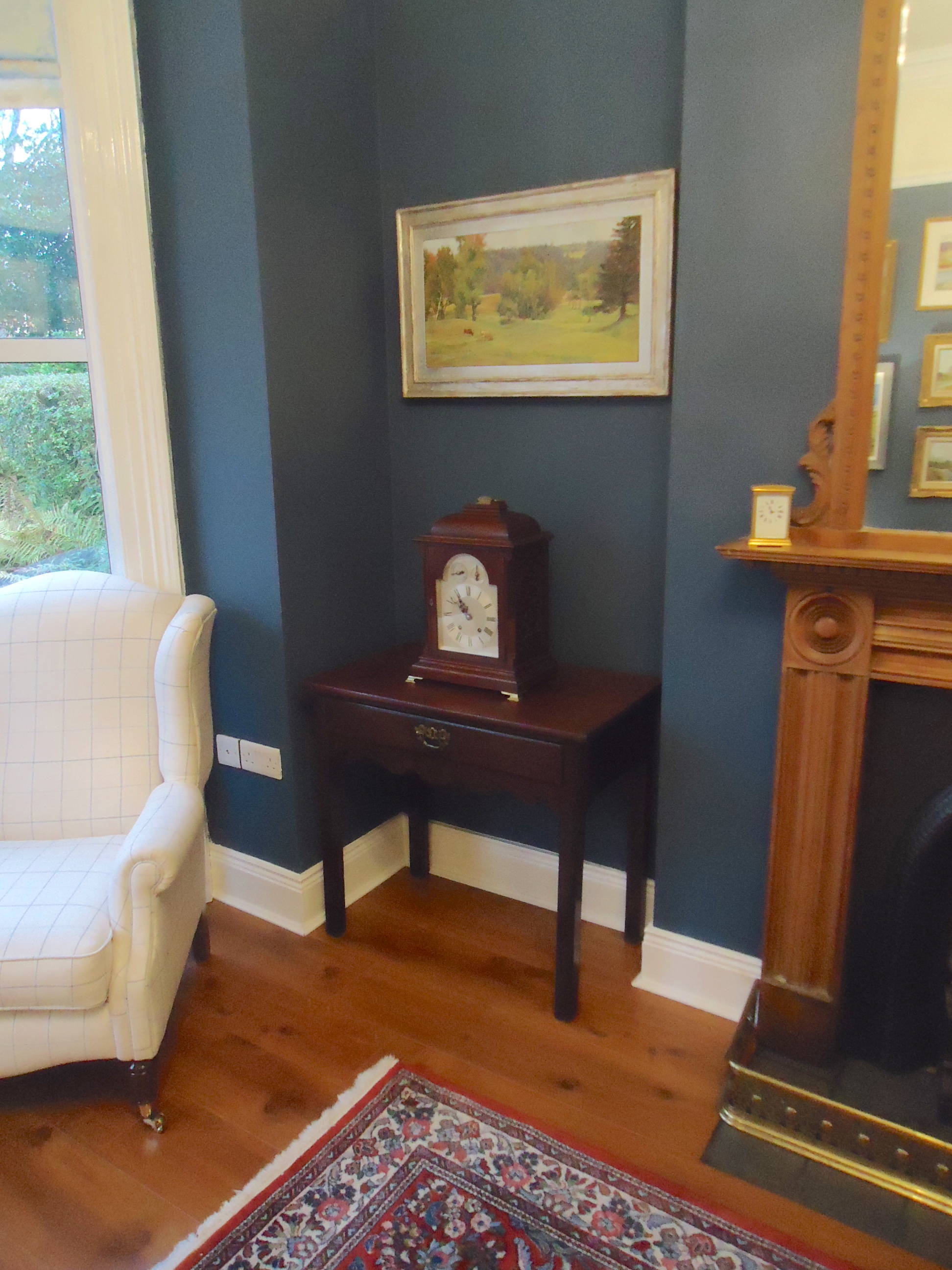 After: Now home to the other mahogany table and the clock (also from mom) that had been in the dining room.