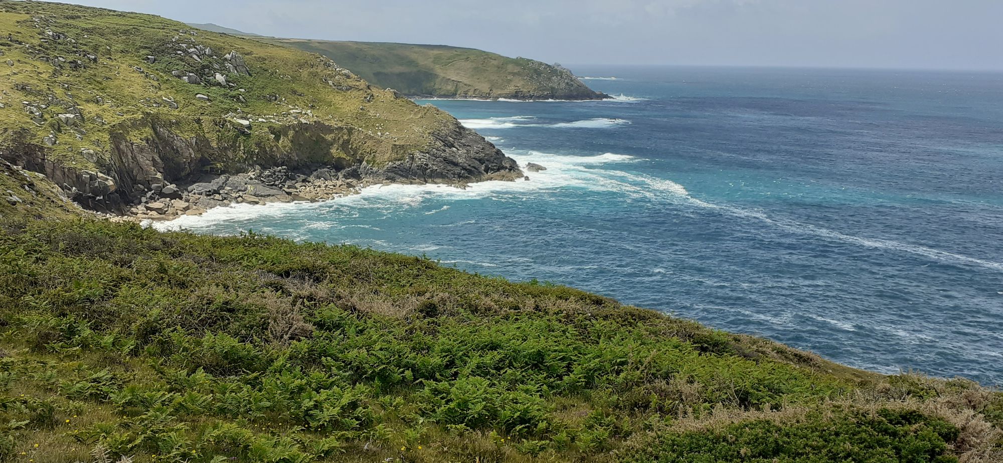 Donegal is just as beautiful--but a 3 hour drive away and maybe not as warm and sunny as Cornwall. The one glitch in the hike was our final approach to St. Ives. All of the guides are volunteers and many haven't done the hikes before. They use detailed maps and trip notes. As we neared St. Ives, Nigel took us into an overgrown path, where the bracken was up to our shoulders and there were a lot of raised roots ready to catch our ankles. We went down down down, trying to reach the coastal path. We hit a dead end--surrounded by prickly gorse bushes. Then another dead end. Then he found a path that got us out of the bracken and onto the coast path.