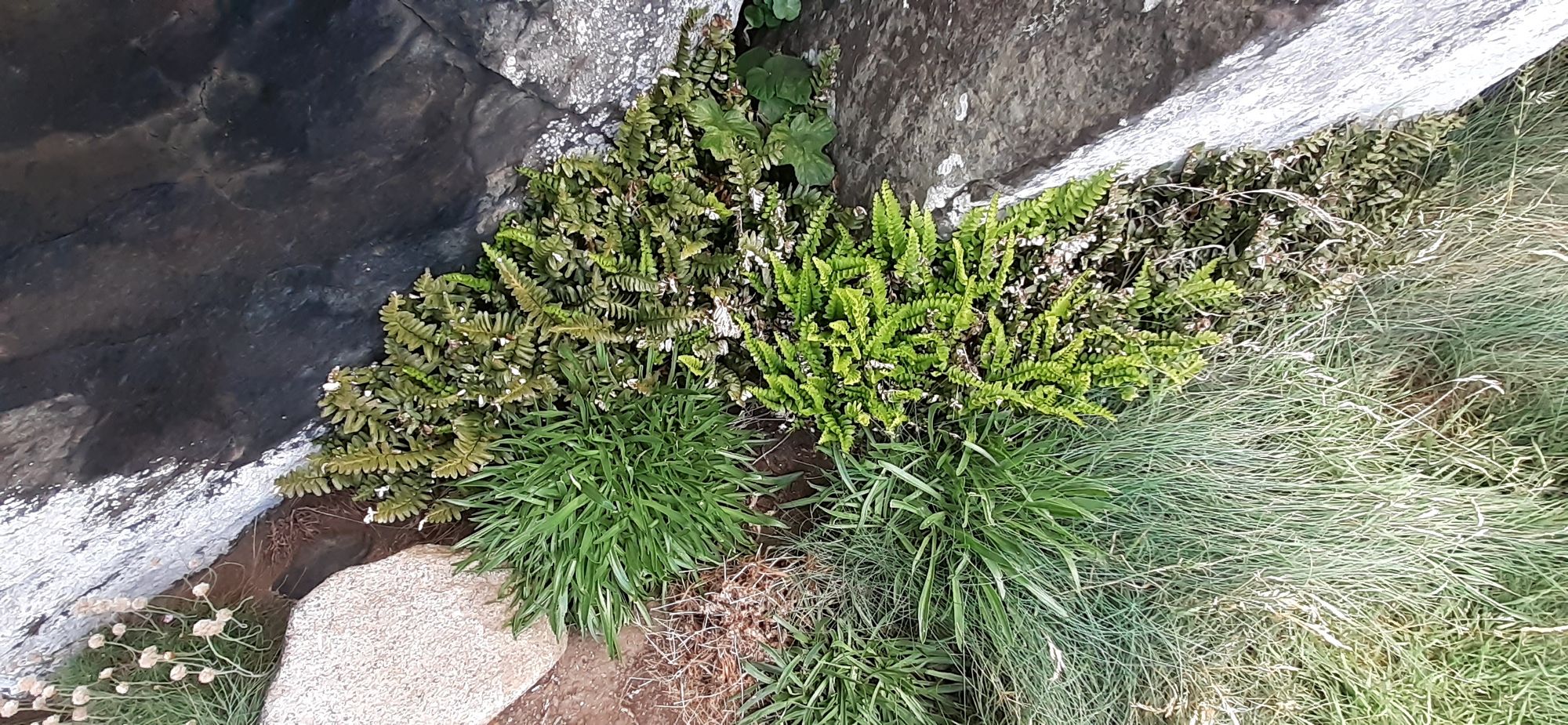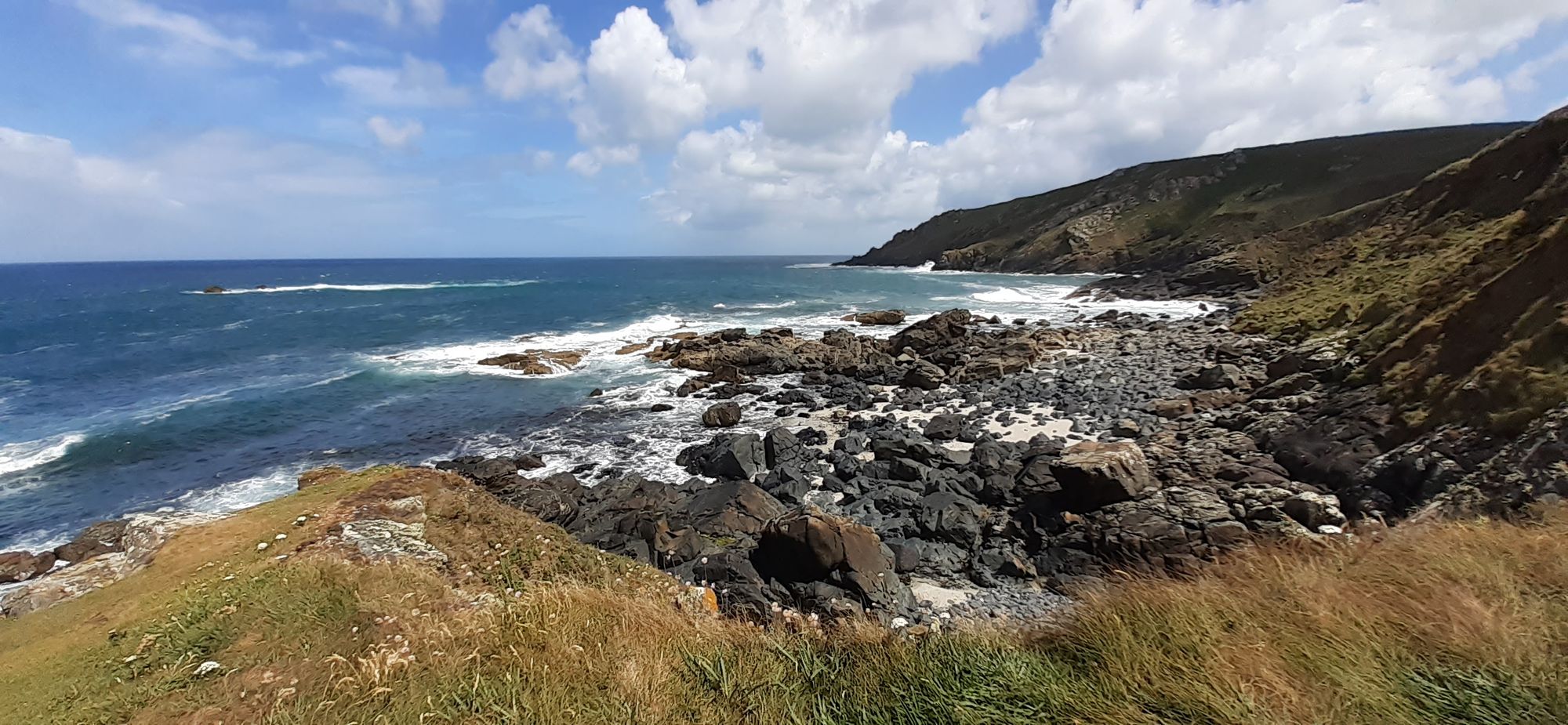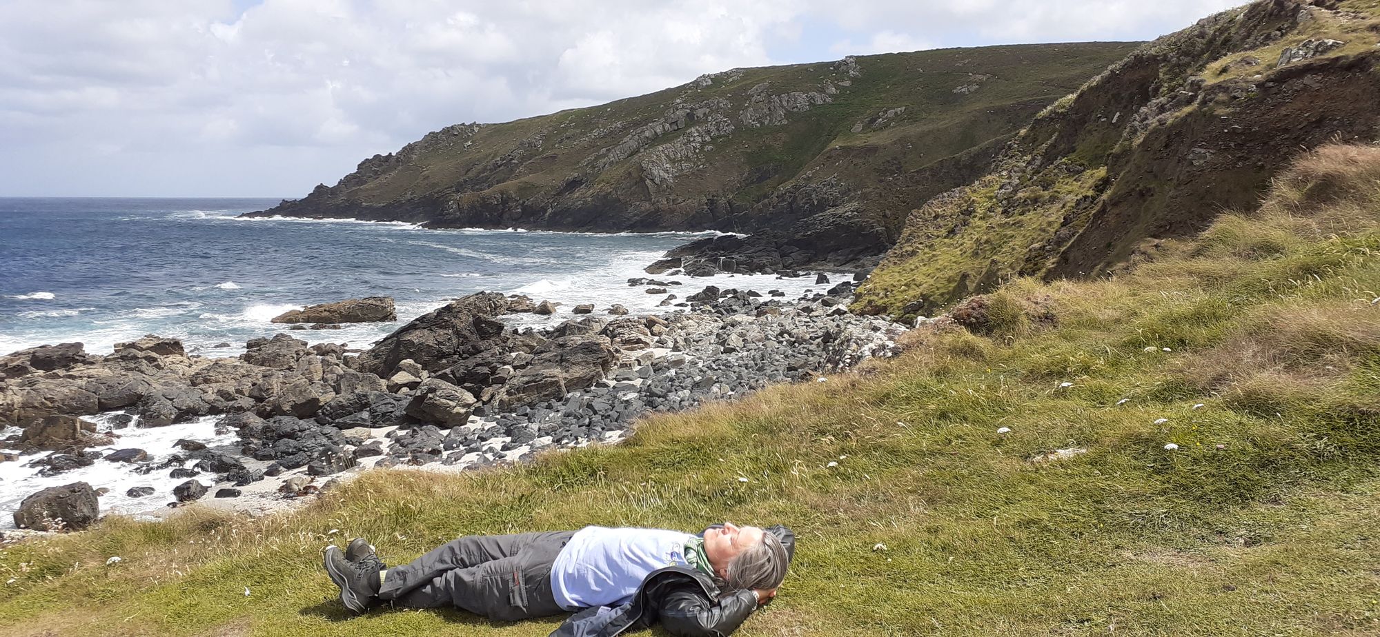 We saw five seals today, two were hanging around while we ate lunch, and three were in a cove further on. They looked like corks bobbing in the boiling ocean.