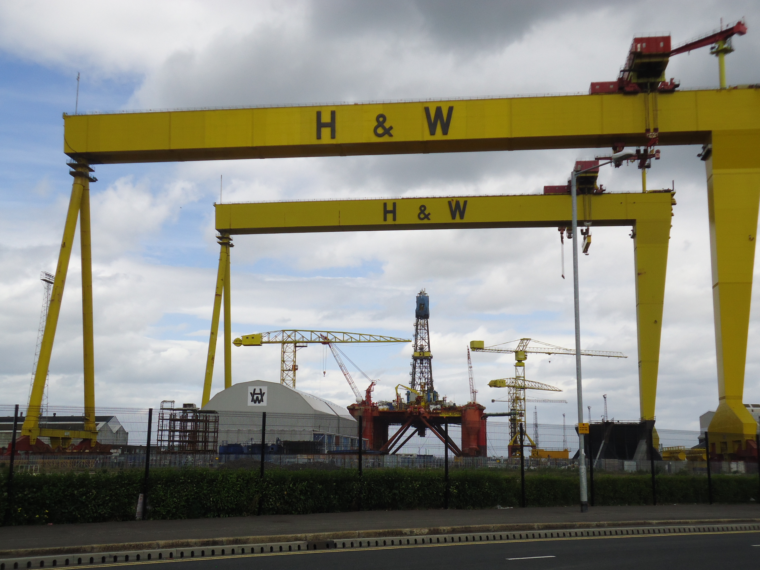 It doesn't help that your parting impression is Celine Dion belting out the song of this post's title. You learn a lot about the shipyard, so when we left, I couldn't resist this shot of the Harland and Wolff cranes and the oil rig currently in for service.