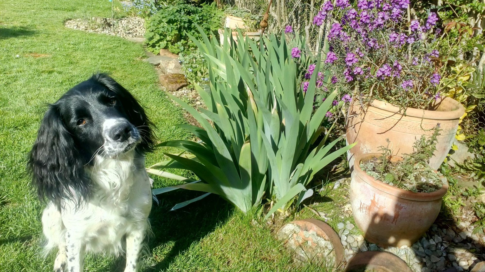 Despite very sore ribs, I've been working in the garden, digging up and replanting turf to widen my borders. Not wise as I think it has set me back, rib-wise. But we have had week after week of gorgeous weather so it's hard to stay out of the garden. Even though Paddy tried to kill me on Easter and even though he does a lot of damage to my border gardens, how can I not adore him?