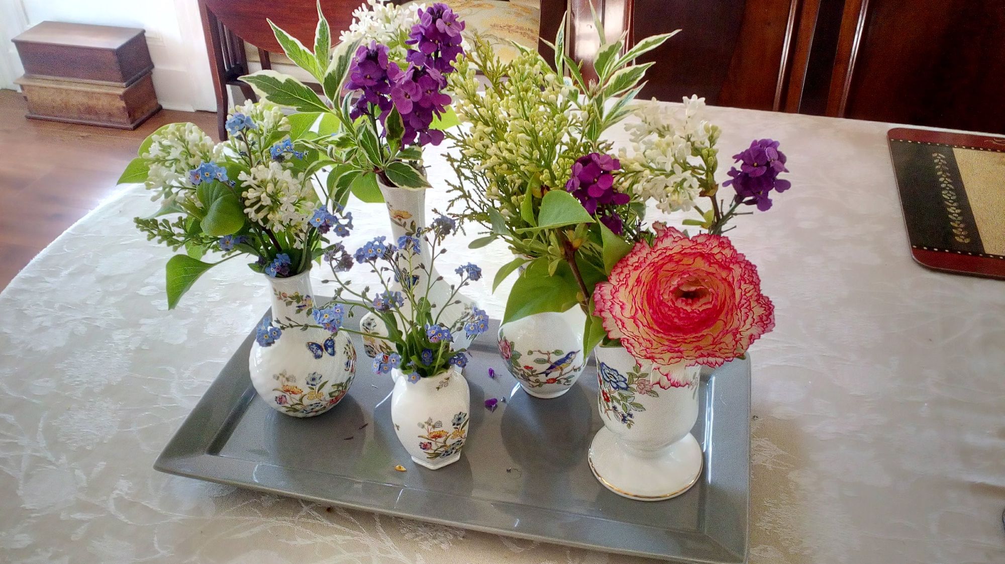 Now that things are blooming, I'm making bouquets with my own flowers. With the exception of the white lilac, which is from next door. Marshall's old house was bought by an Ulster Rugby player, who leased it to another player from New Zealand. He's back in NZ enjoying lockdown at home. So Marshall's old lilac bush is fragrantly blooming in an empty yard. So I helped myself.