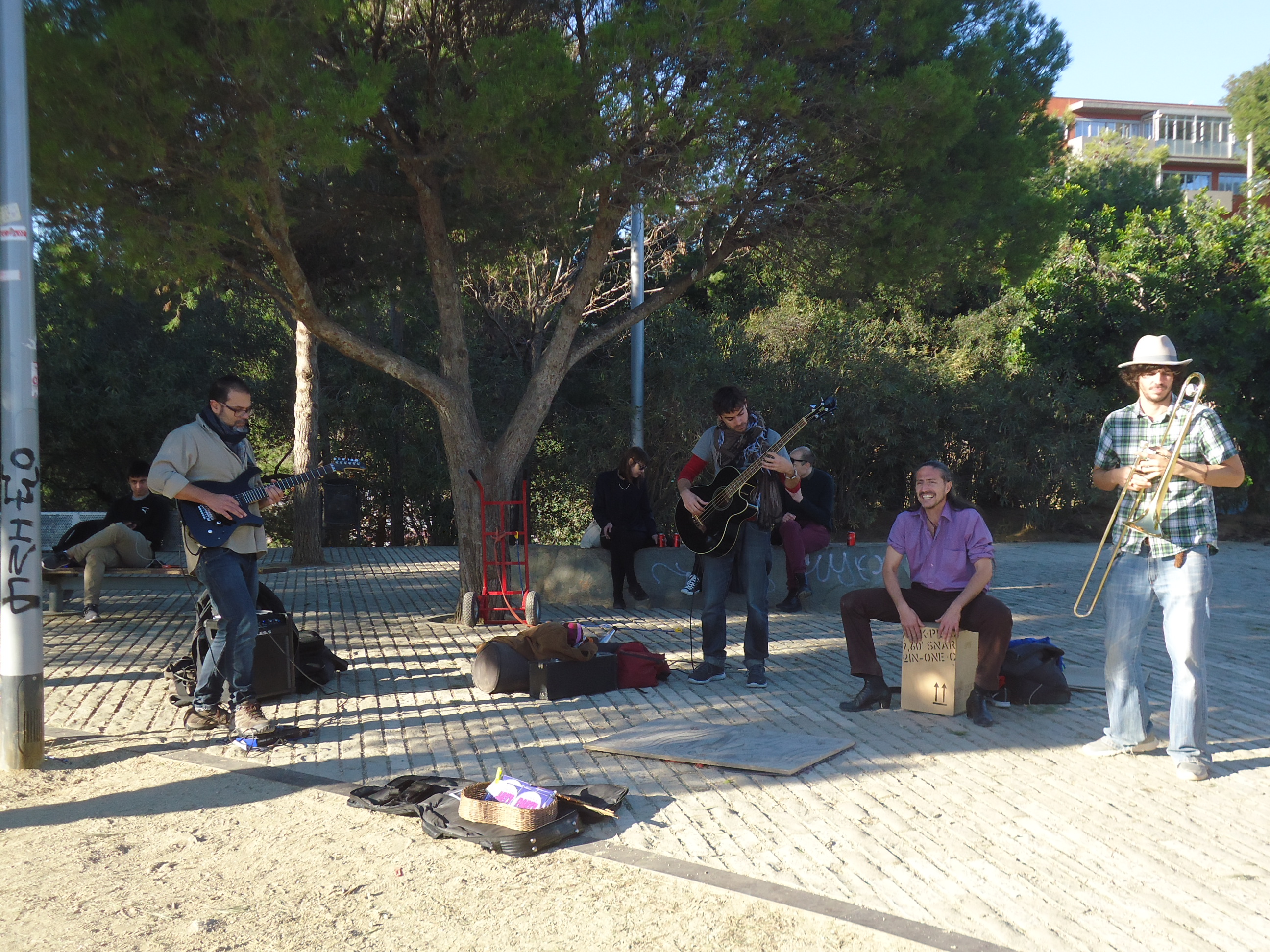 At the very top of Parc Guell, where a big mansion was probably once planned, we encounter a band. One of them was from Chile, one from Peru, one from Venezuela, I can’t remember the last. They were phenomenal. The guy with the smile playing percussion got up and danced flamenco on the board on the ground. That made my day.