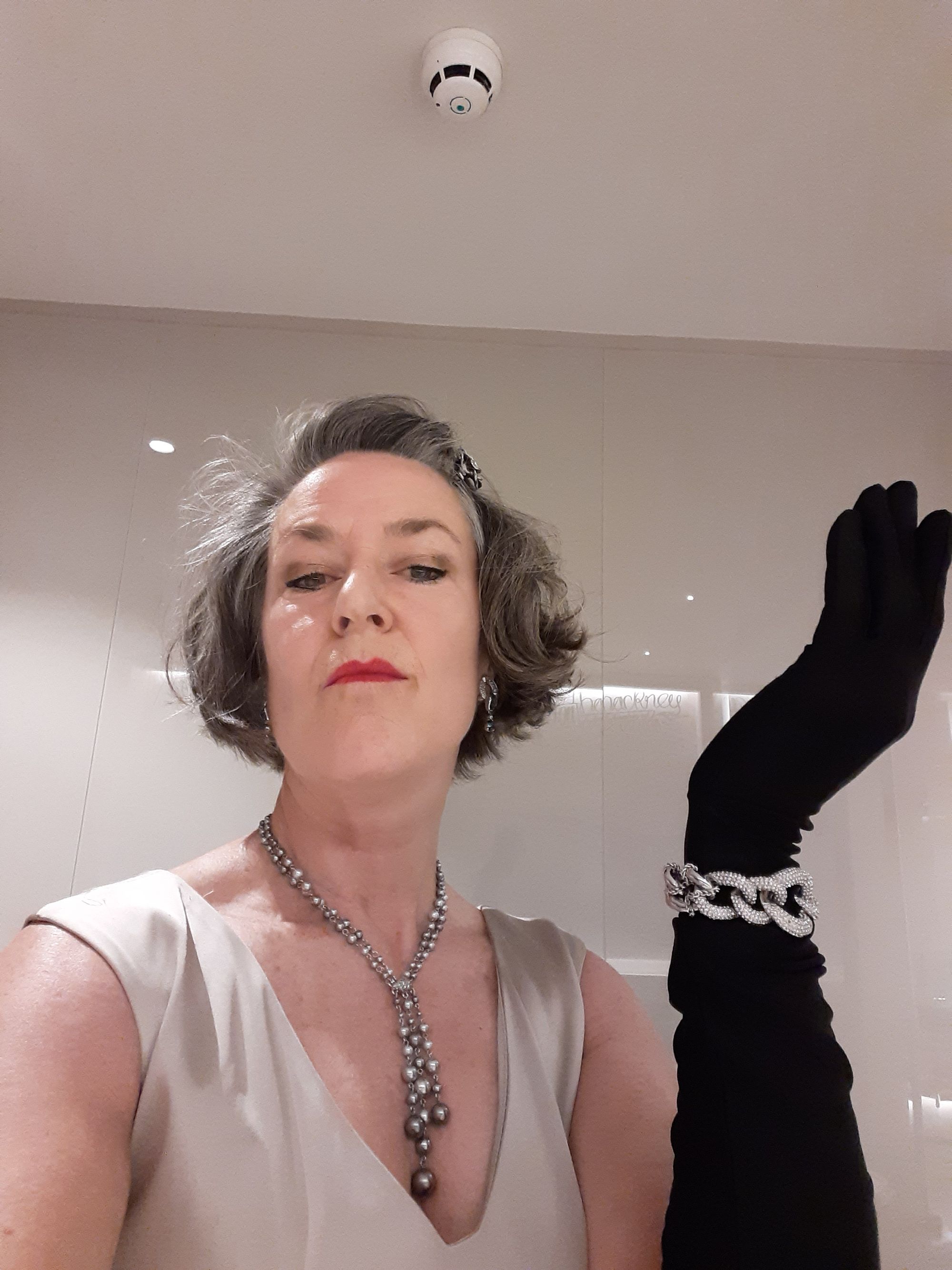 I worked Friday, but also took a nap in preparation for the big night. I took a selfie after getting all dolled up--this is my Cruella look.