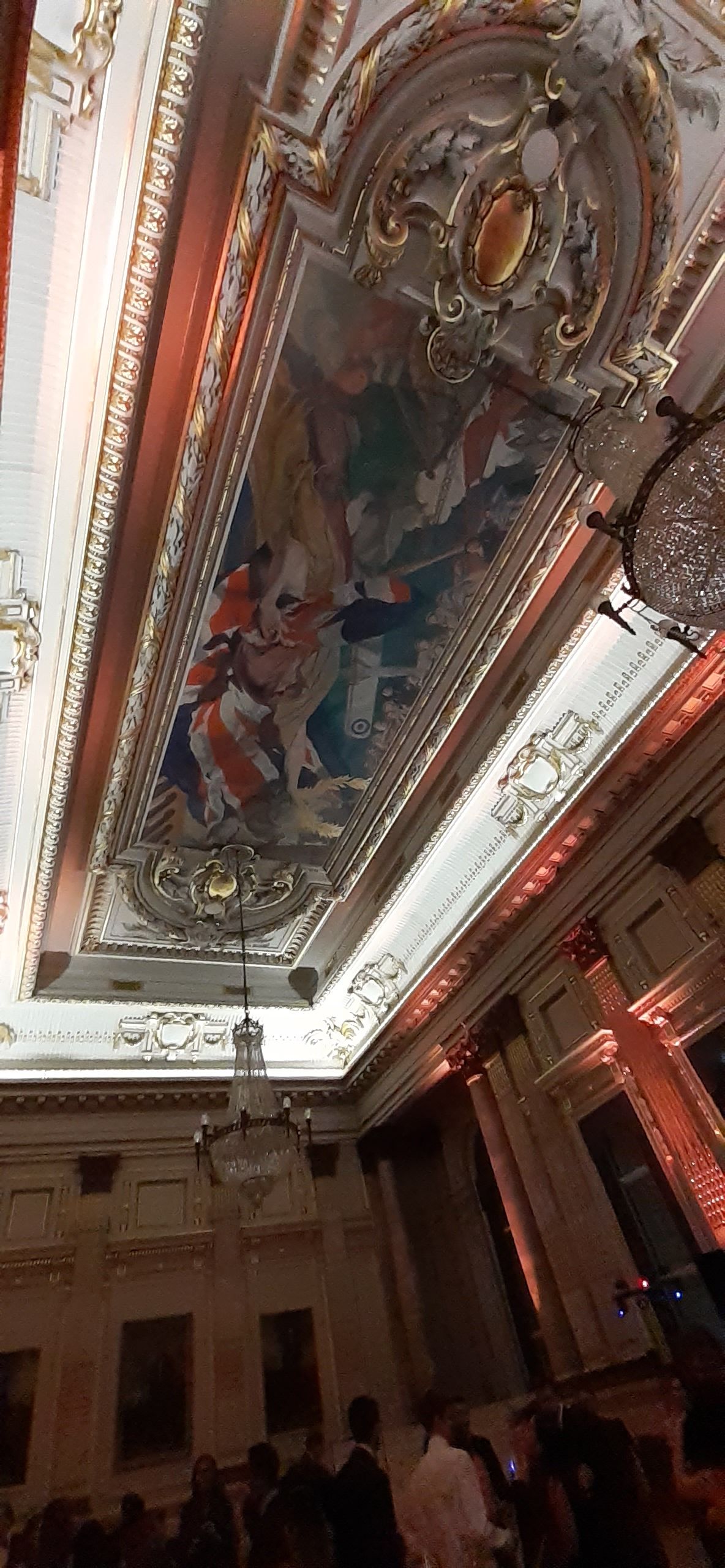 We had drinks in the Brunel Room, named for Isambard Kingdom Brunel, "one of the most ingenious and prolific figures in engineering history," according to Wikipedia. Then upstairs to the Great Hall, where our outgoing CEO, Fiona Reynolds, gave a moving speech about her nine years at PRI. Below is the ceiling of the Great Hall. The ICE members don't mess around.