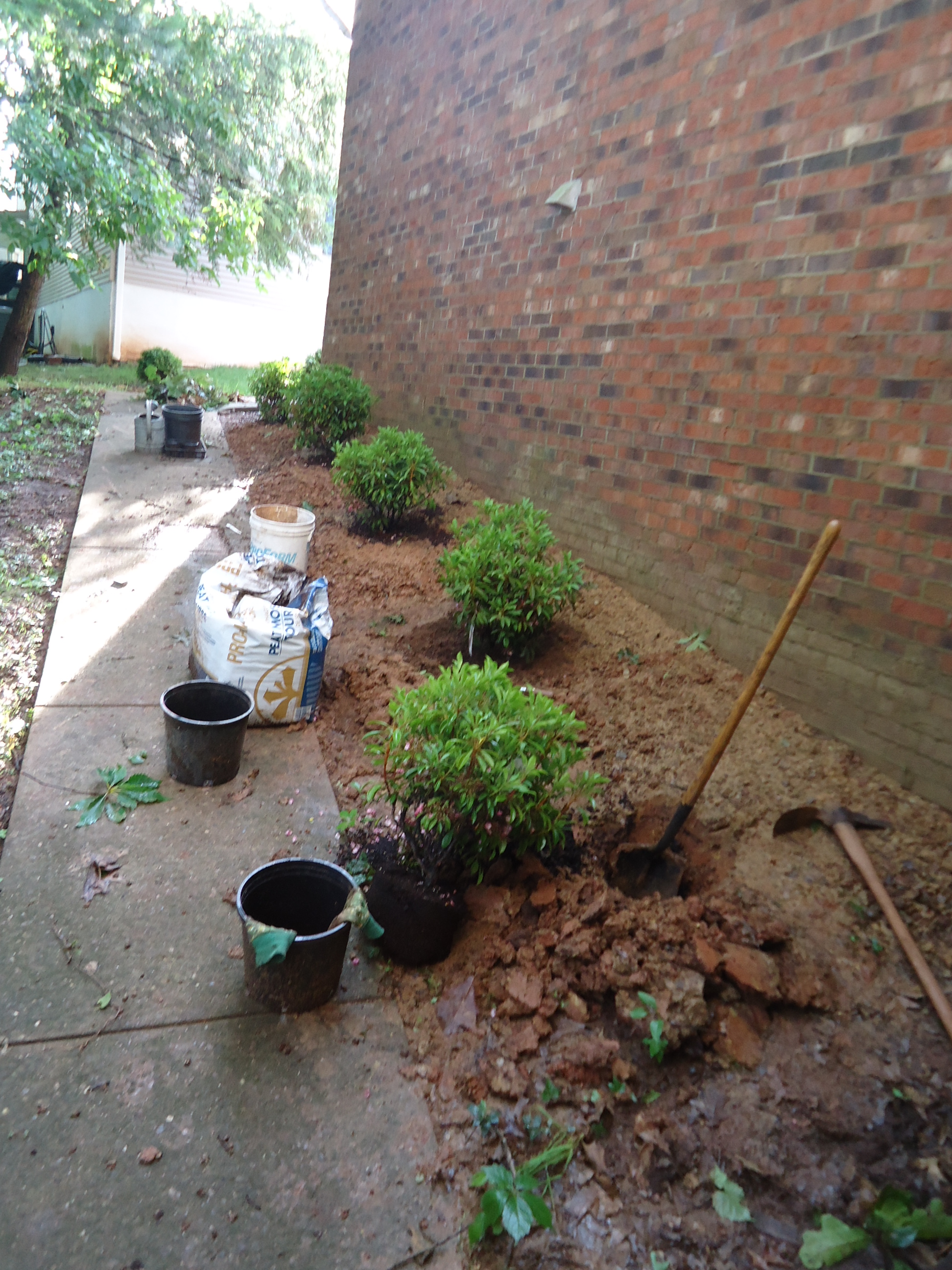 The job entailed digging five big holes and mixing peat moss into the clay to try to create something resembling soil. It was like cutting flour into fudge. Here's the fifth and final: