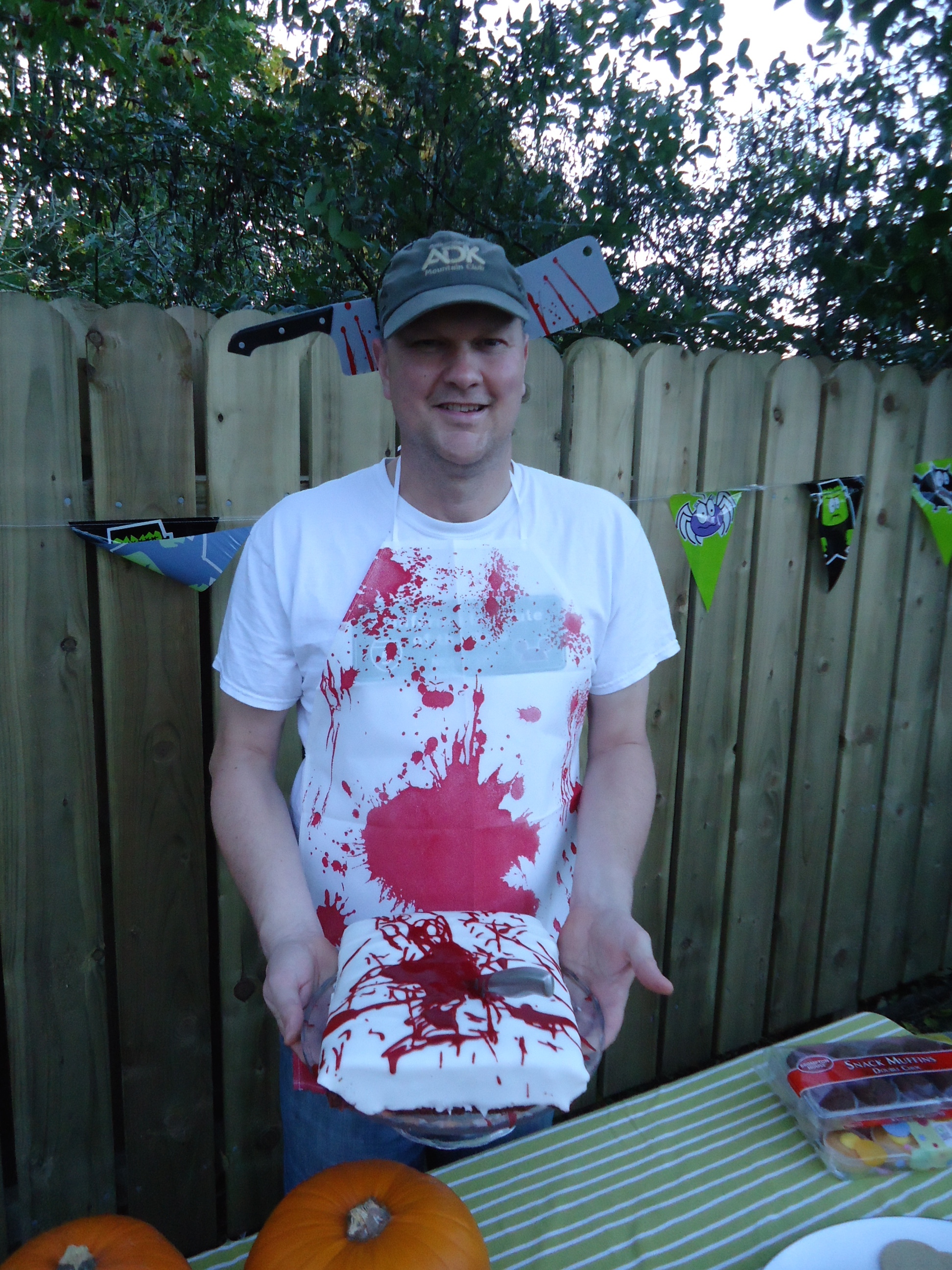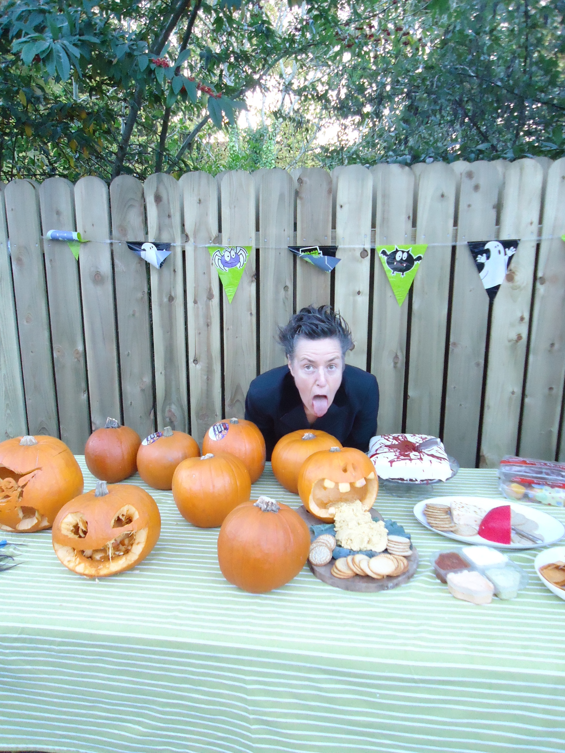 And here's me behind a pumpkin with "vomit" made out of hummus, sweet potato and curry powder. It was disturbingly tasty.